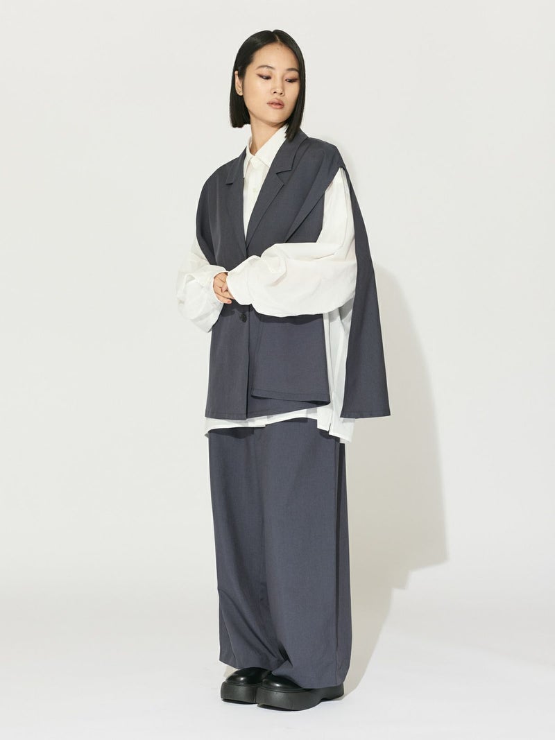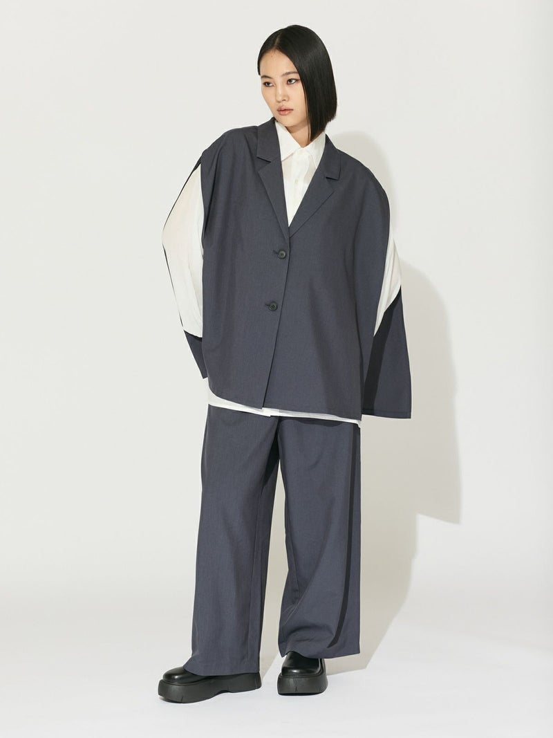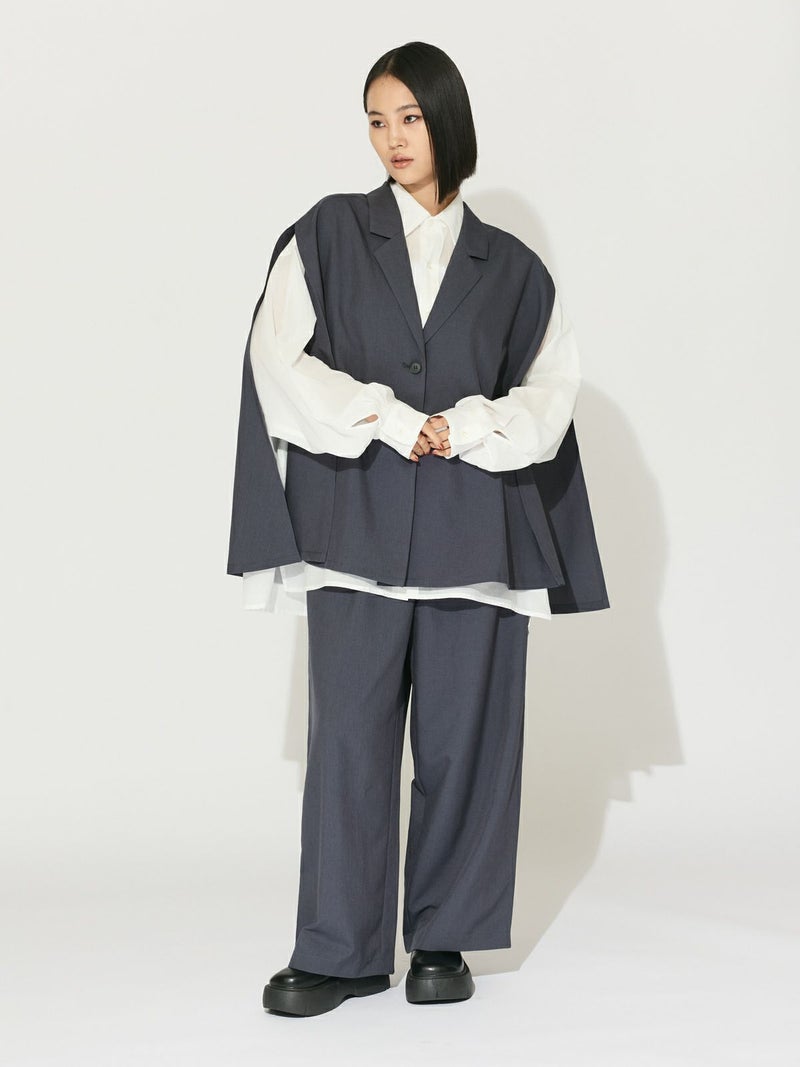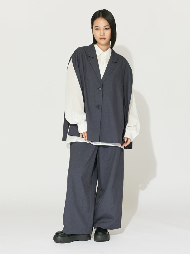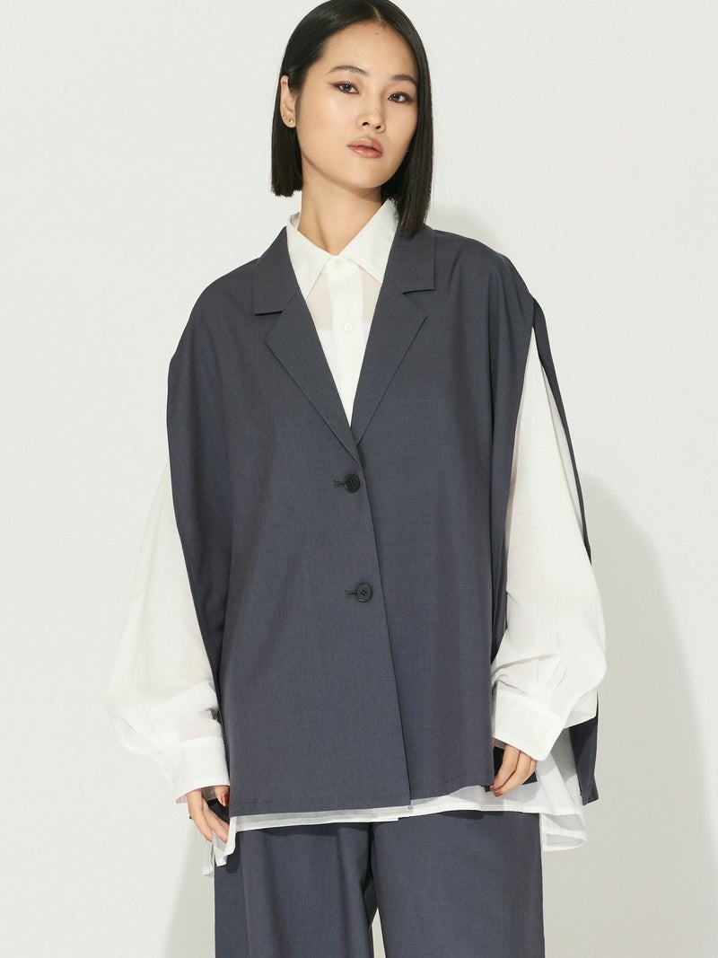 ナチュラルなルックスと肌触りのリネンライクファブリック、ケープライクジレです。縮みが少なく、マシーンウォッシャブル可能。シワになりにくくノーアイロンも可能なので日々のお手入れも簡単。チクチク感がなく、心地よい肌触りが特徴です。テーラードの襟元は清楚できちんと感を表現。サイドが大きく開いていることで優雅にゆれるデザインが印象的。繰り返しの選択でも毛羽立ちが少なくキレイが長持ちします。女性らしい1枚です。