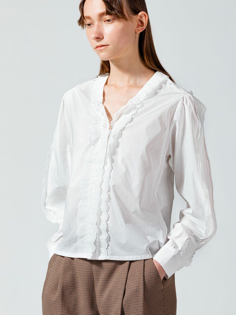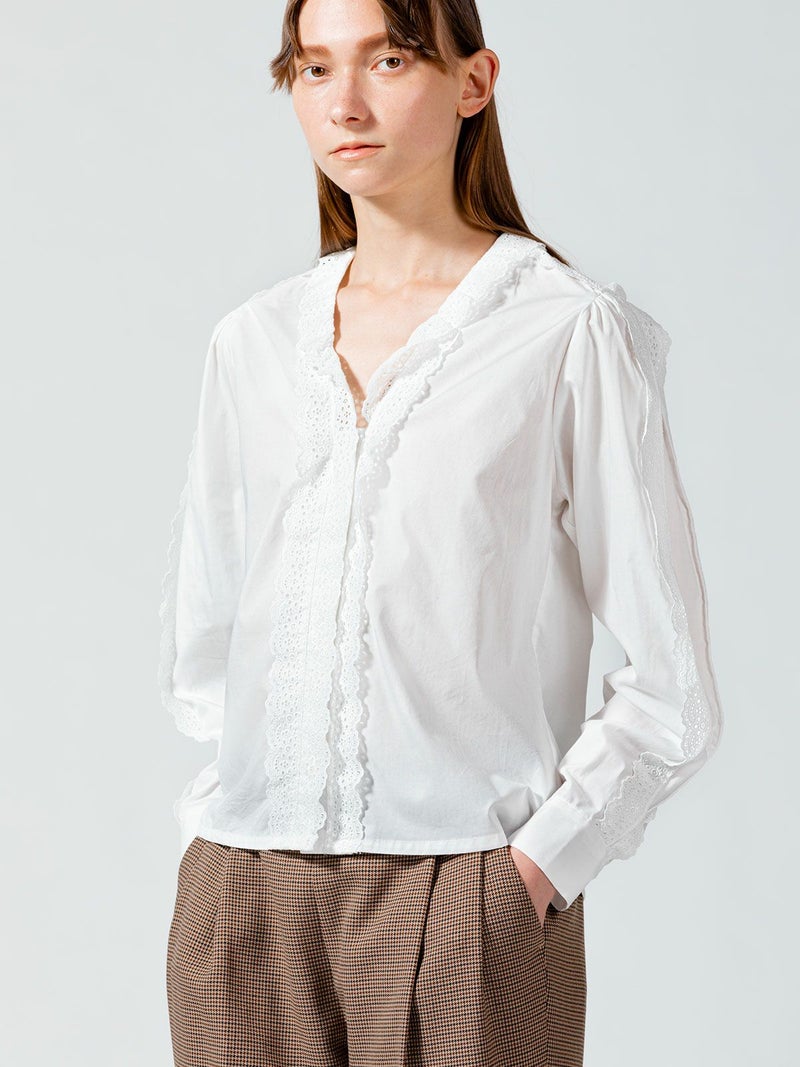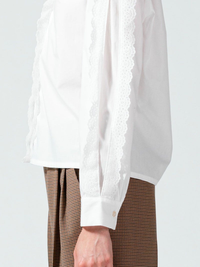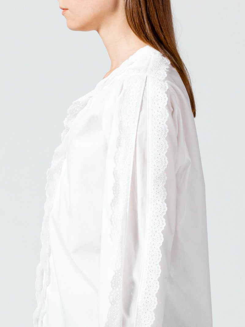 50ブロード生地を使用したレースフリルシャツです。肩から袖口まで、襟元からフロントボタンを隠すようにレースを施した清楚な1枚。中折れになった特長的な袖のデザインはアームにゆとりがあります。 前後の身頃にはダーツを入れたことですっきりとしたシルエットを表現。首に添うレースの華やかさは、カーディガンやジャケットを着た時に見えるレースがより洗練された着こなしを演出します。上品なレースシリーズは、爽やかなオフホワイトと落ち着きのあるベージュの2色展開です。