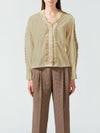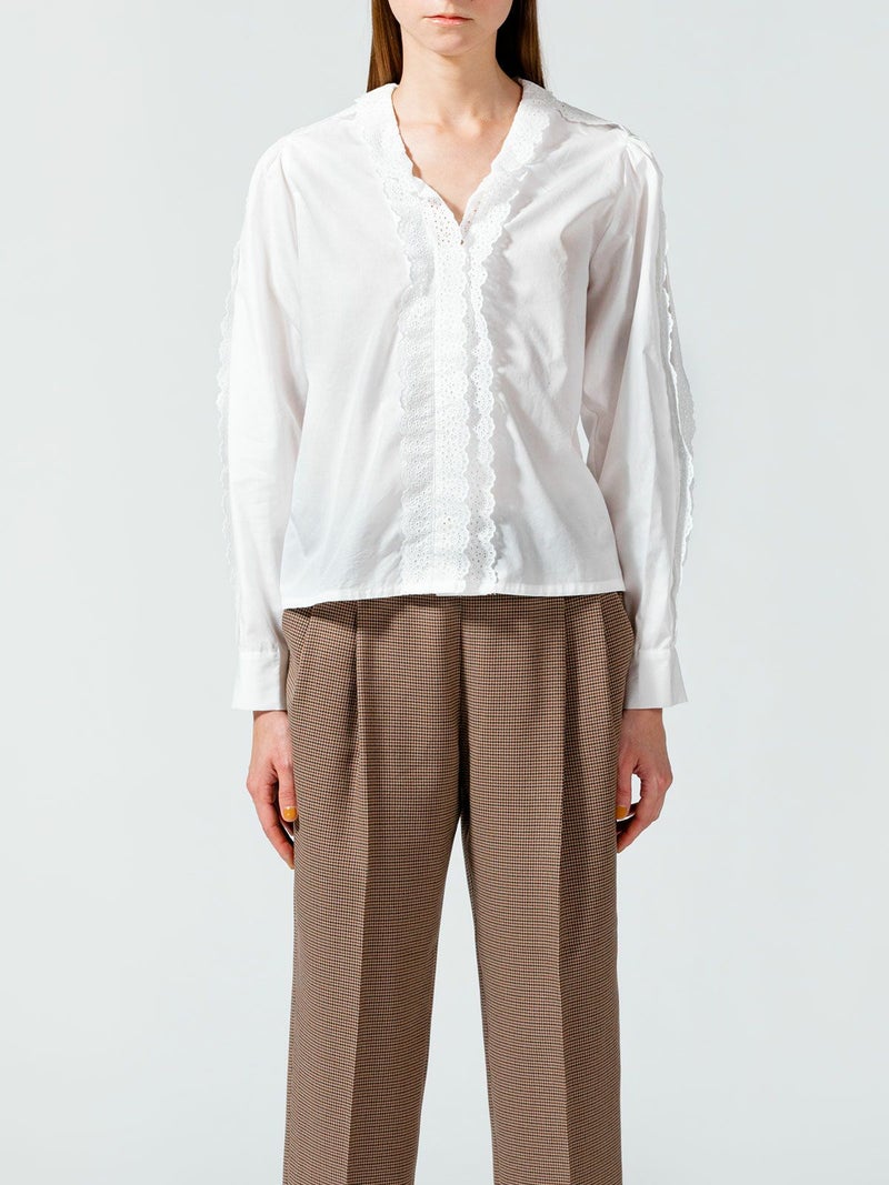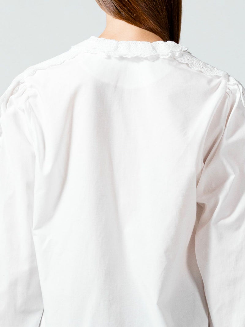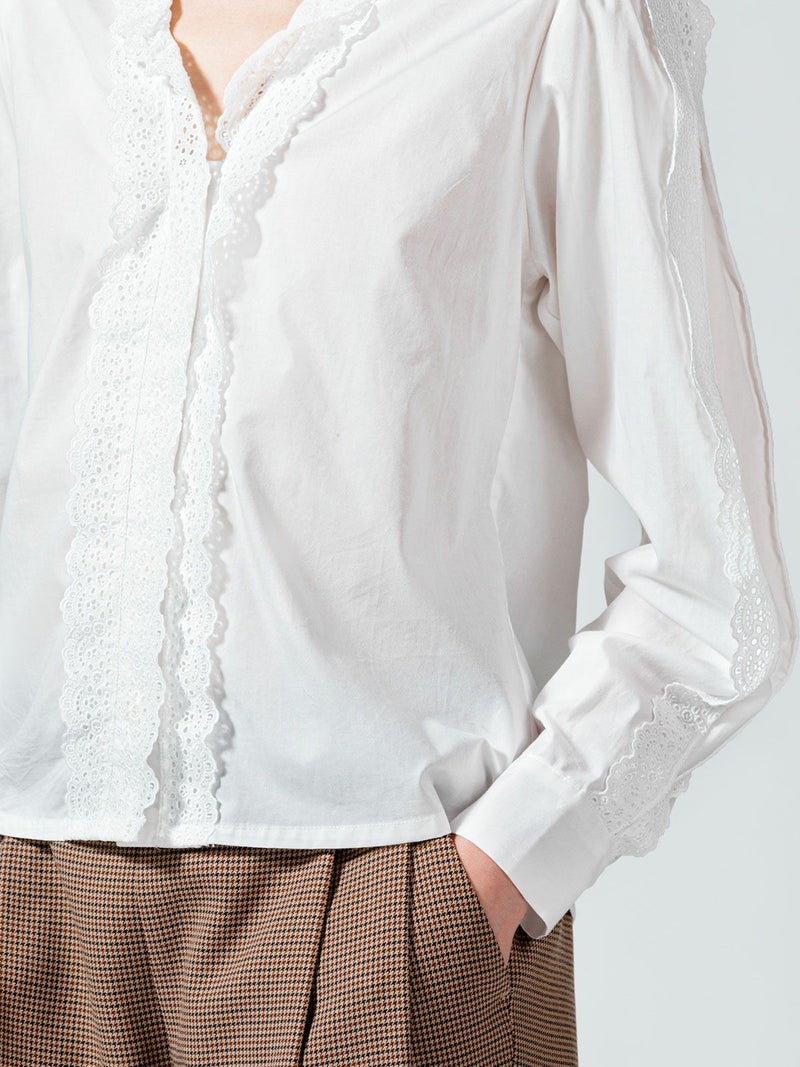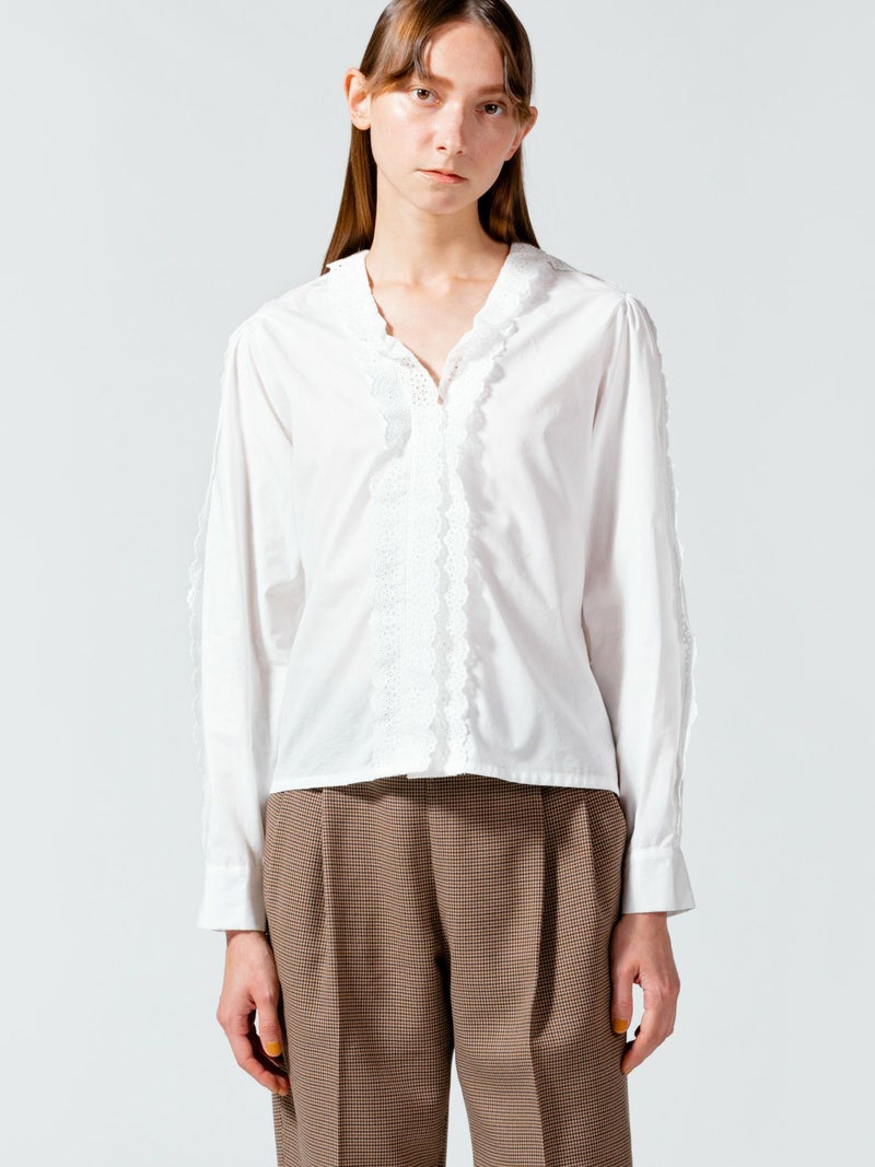 50ブロード生地を使用したレースフリルシャツです。肩から袖口まで、襟元からフロントボタンを隠すようにレースを施した清楚な1枚。中折れになった特長的な袖のデザインはアームにゆとりがあります。 前後の身頃にはダーツを入れたことですっきりとしたシルエットを表現。首に添うレースの華やかさは、カーディガンやジャケットを着た時に見えるレースがより洗練された着こなしを演出します。上品なレースシリーズは、爽やかなオフホワイトと落ち着きのあるベージュの2色展開です。