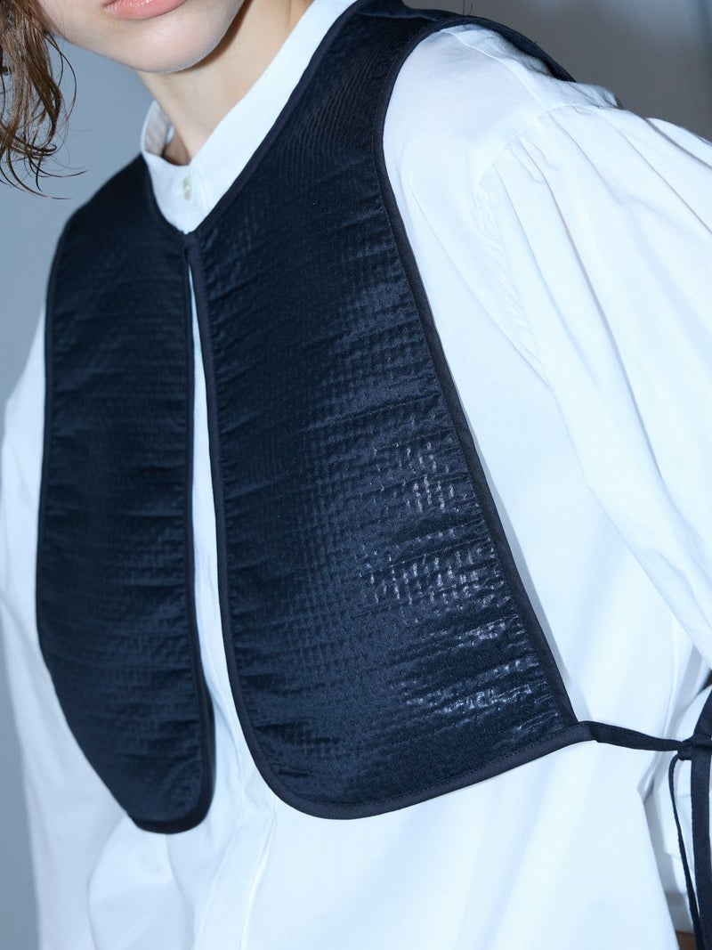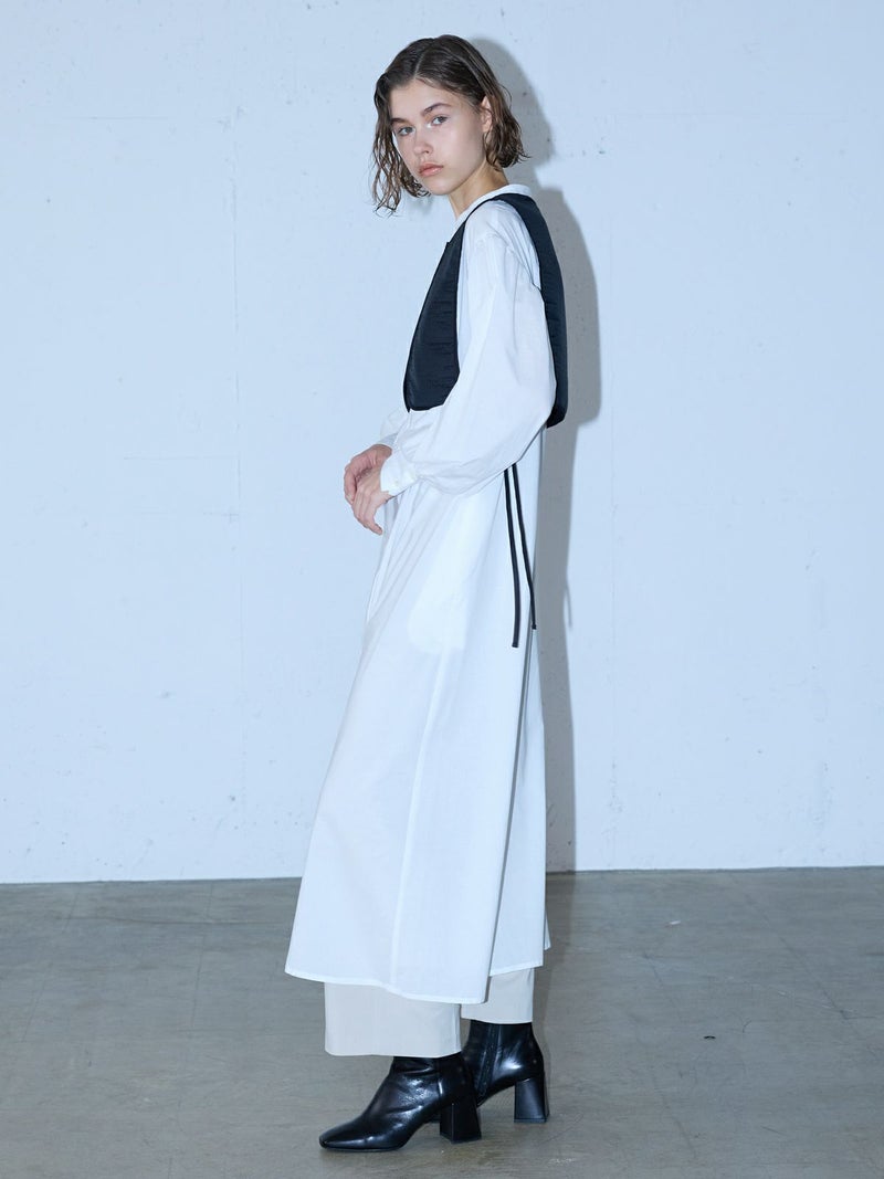 キメが細かく、透け感が抑えられたソフトな肌触りが特徴の60ローン素材を使用したベスト付きロングシャツワンピース。コレクションラインの素材を使用したインパクトのある取り外しヨークがポイント。別々で着用可能。ワンピースは1枚でも着られるデザイン性のあるボリューム袖が魅力的。身頃はスッキリ縦長なシルエットを表現しています。雰囲気の異なる3色で展開。