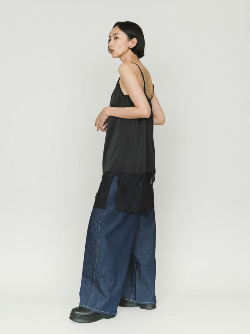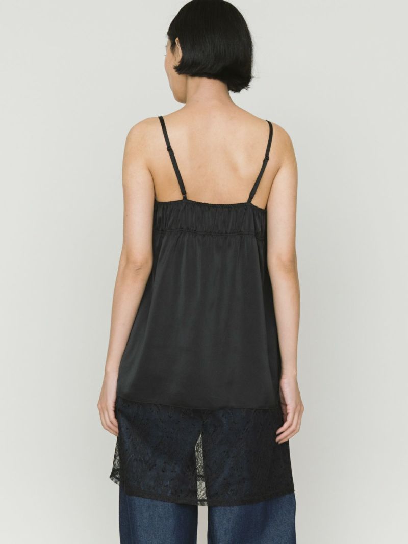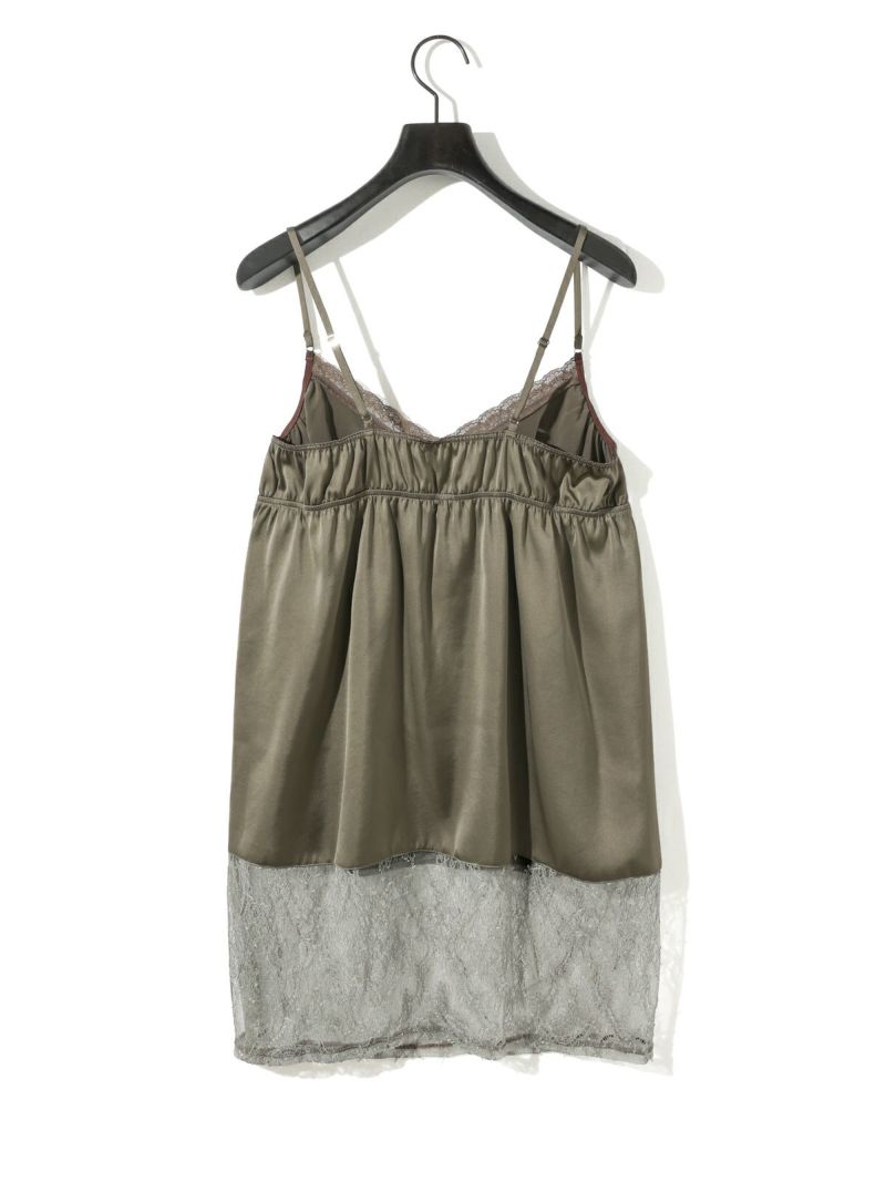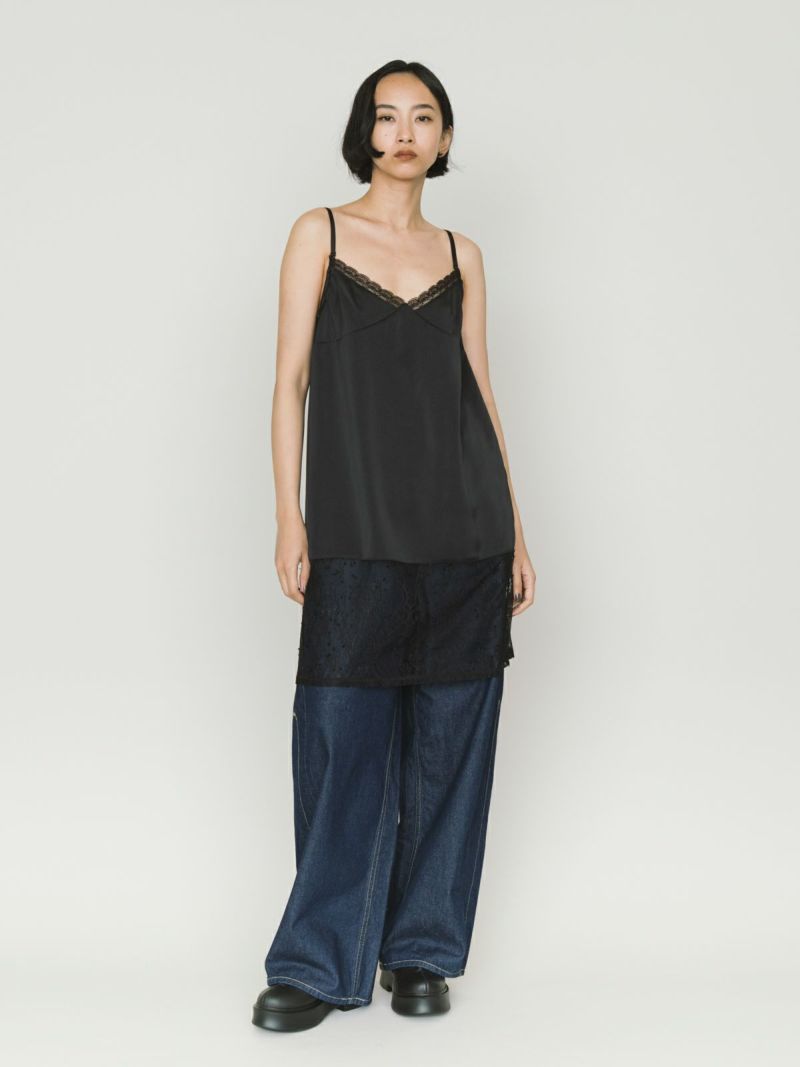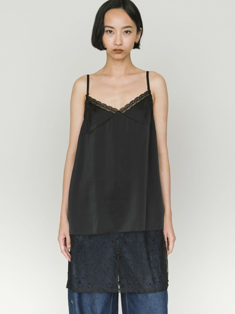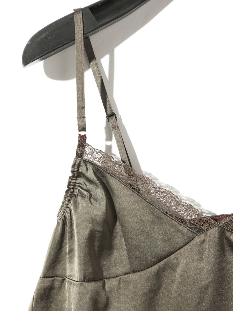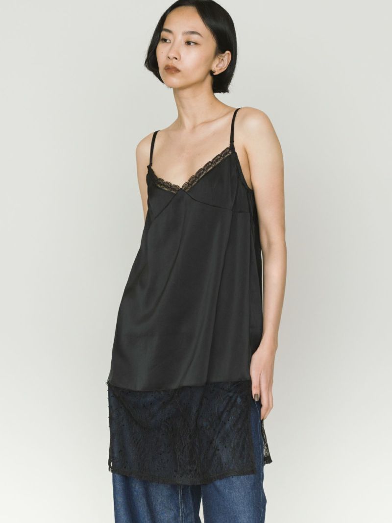 今季トレンドのランジェリーファッションを提案したスリップキャミソールワンピースです。ヴィンテージレース風の布レースを裾や胸元にあしらっており、シャーリングのきいたカットレースが上品な装いを演出します。ぺチワンピースとしても使え、レイヤードアイテムとして幅広くコーディネートが可能です。肩紐はアジャスター付きで長さ調整が可能。同シリーズ3-132226/スリップキャミソールも展開。