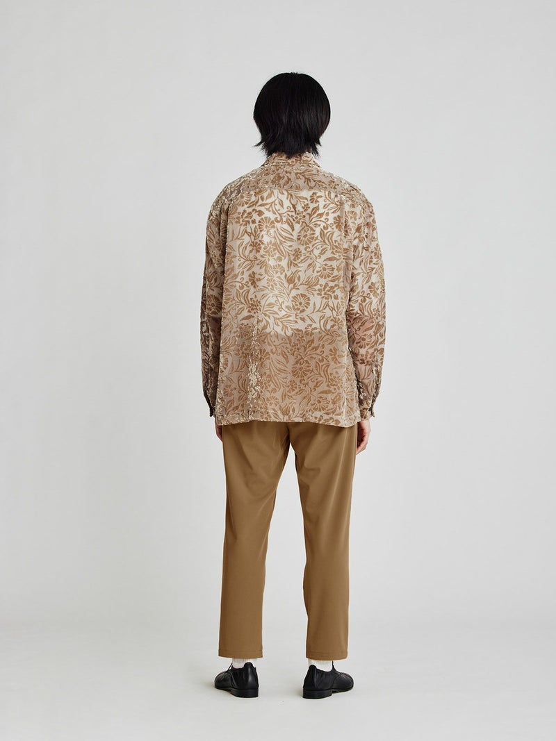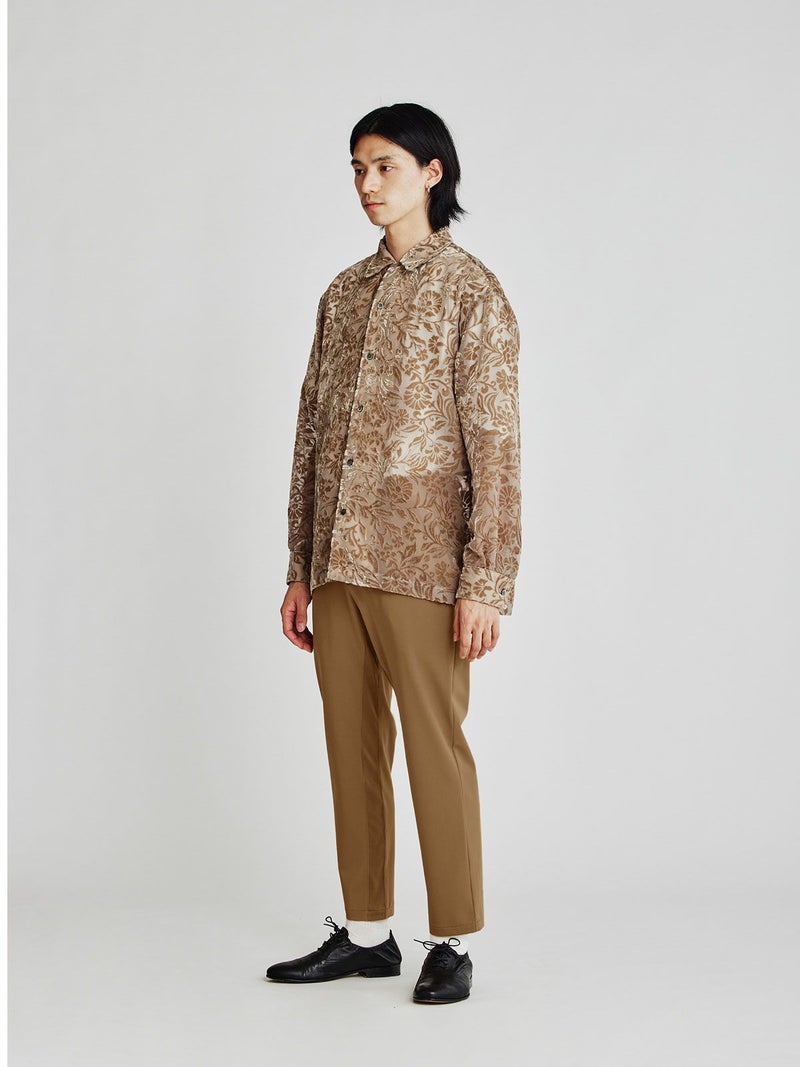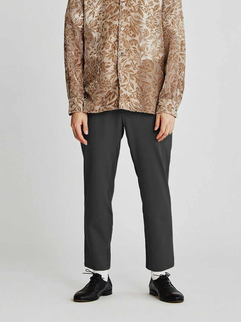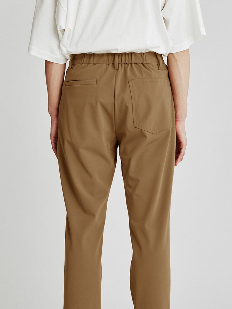 内側にリブを施したデザインパンツです。きっちり感のあるスラックスにはずしたデザインで遊び心を。バックポケットの左がピスポケット、右がパッチポケットとアシンメトリーなデザインを採用。フロントのスナップボタンがポイントとなっています。よく伸びるストレッチ素材で後ろゴムで楽に穿いていただけます。