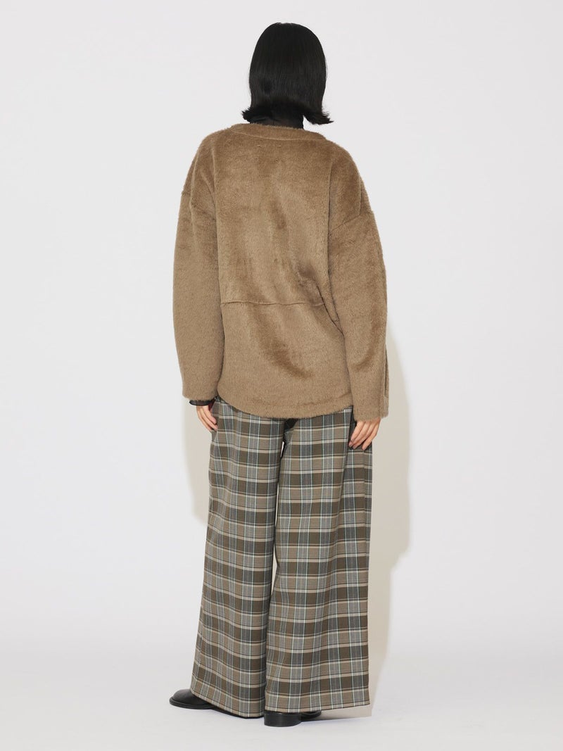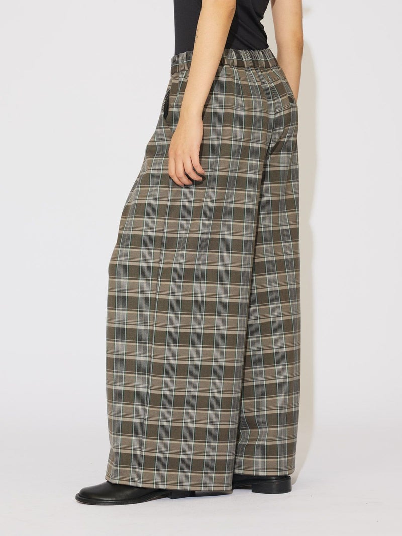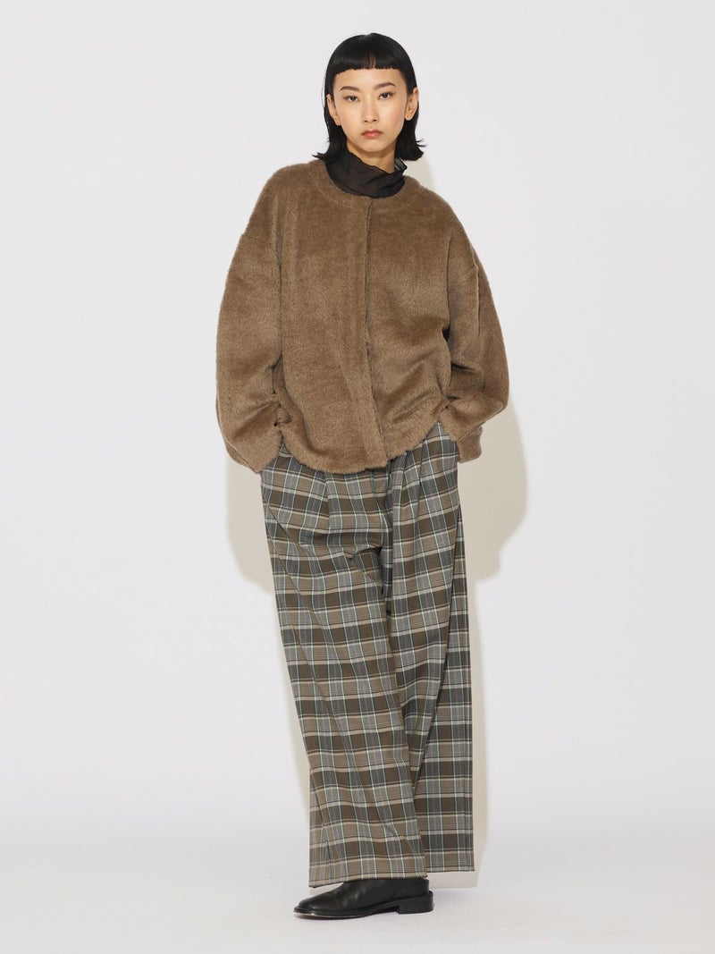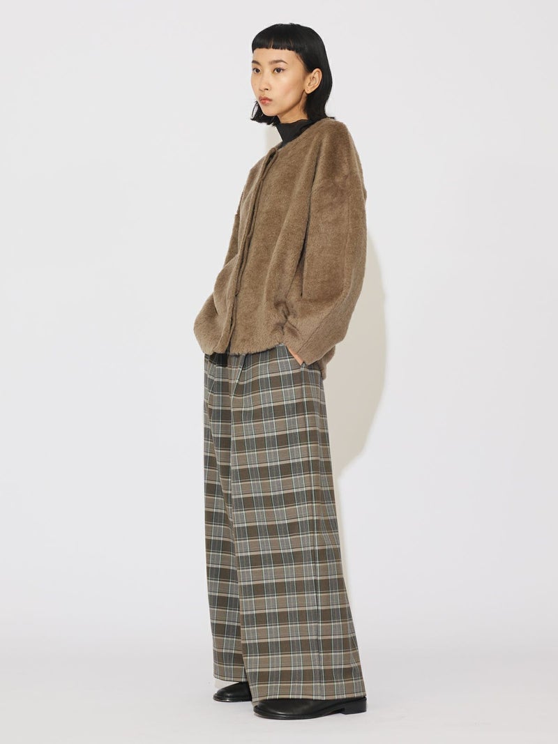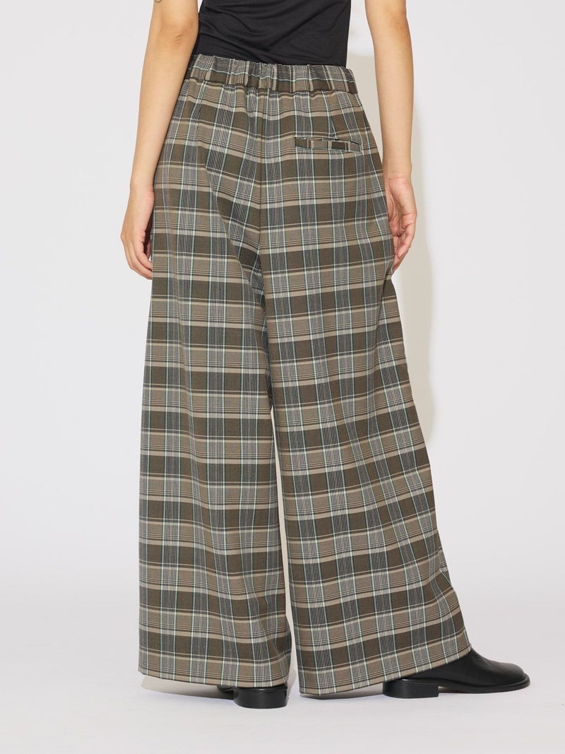 MIDIUMISOLIDの人気のパンツ(3-16215043)をチェック柄の生地を使用してデザインしたチェックストレートパンツです。カーキオンリーで展開した秋らしい1枚です。裏微起毛で暖かな生地感がポイント。インパクトのあるボリュームシルエットを表現。ウエストはシャツインにもおすすめでフロントフラットに、サイドからバックにかけてゴム使用に仕上げました。調整紐付きなのでウエストキープがしやすいデザインです。