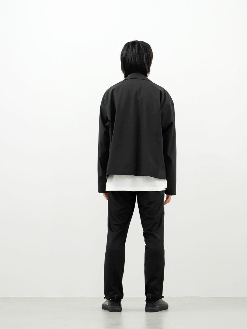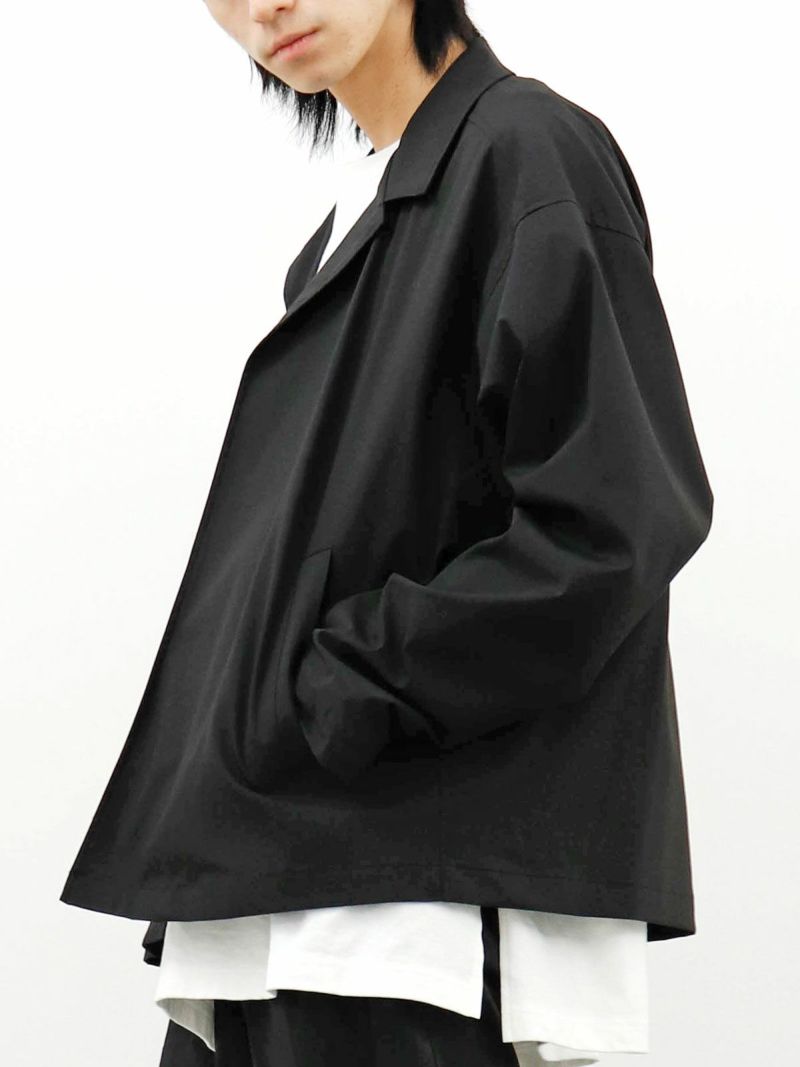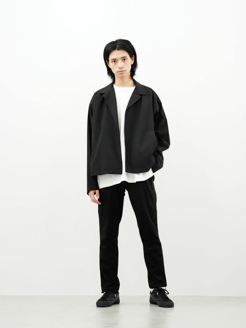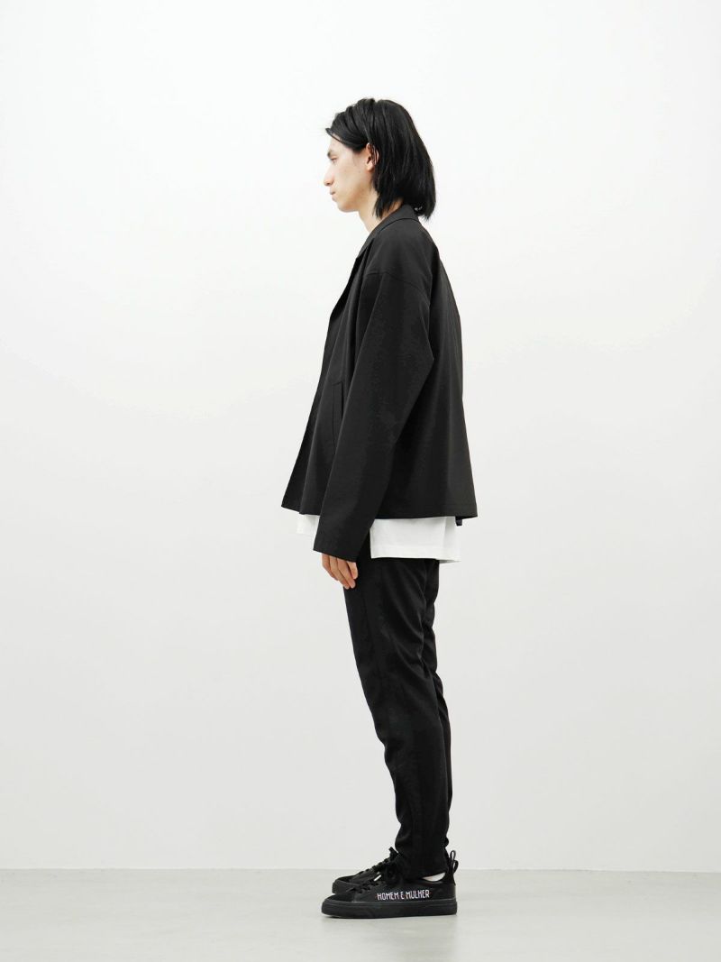 3-160768品番のイージーパンツとセットアップで着ることのできるダブルジャケット。落ち着いた色味と生地を使っており、トラッドな印象を受けます。シルエットは少しワイドで裾はボックスカット。袖が長めなデザインは折り返して裏地を見せて着こなすのもオススメです。