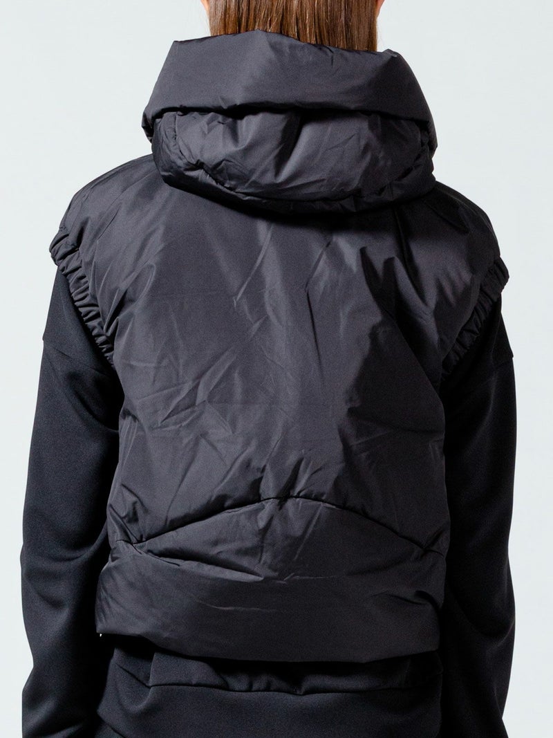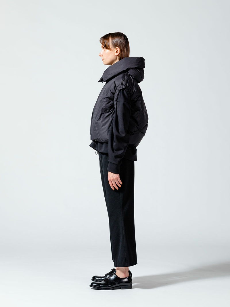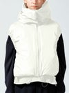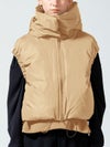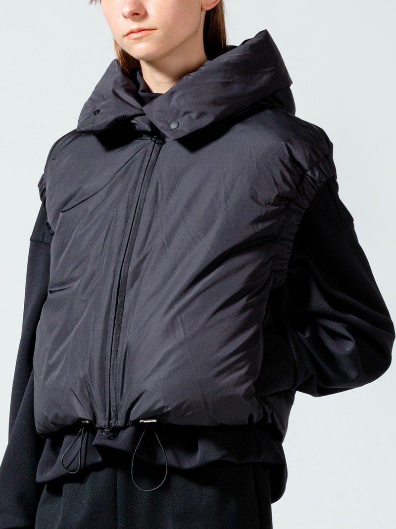 超高密度で織られたマットでハリのある質感のタフタ素材を使用したダウンベストです。防風性・撥水性がございます。首をしっかりと覆うデザインで風通しがなくとても軽くて暖かな1枚。スッキリと短めの丈で腕周りはフィット感のあるゴムを使ったデザインが特長。フロントはジッパー使用、裾はドロスト紐付で調整可能。真っ白のオフホワイトとベージュとブラックの印象の異なるカラー展開となっています。コンパクトでシンプルなデザインなので、毎年冬の定番アイテムとして愛用できるベストです。