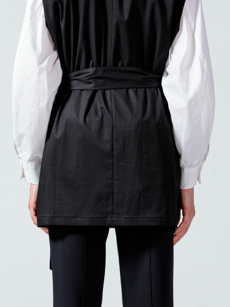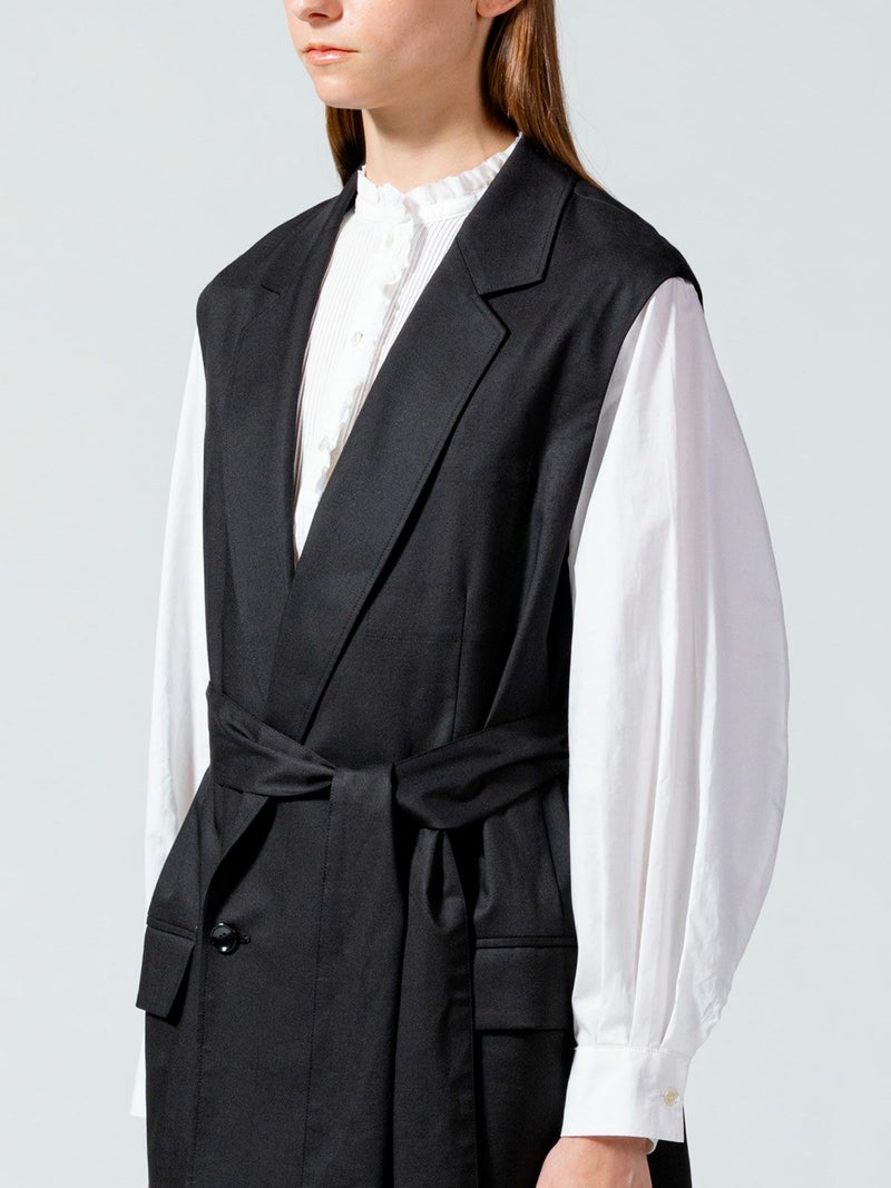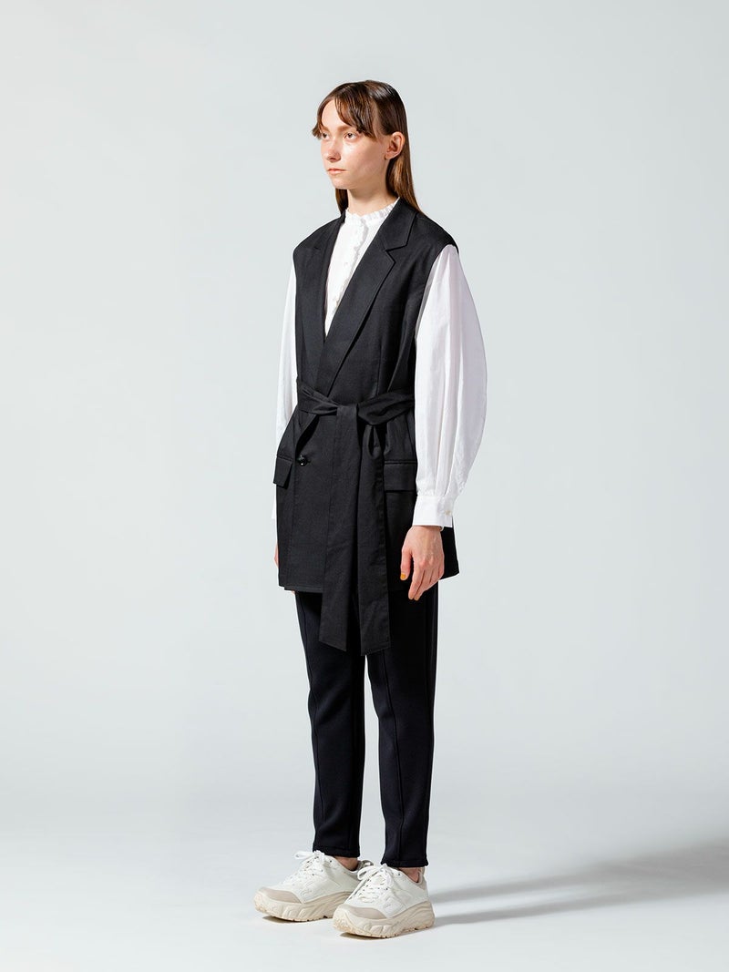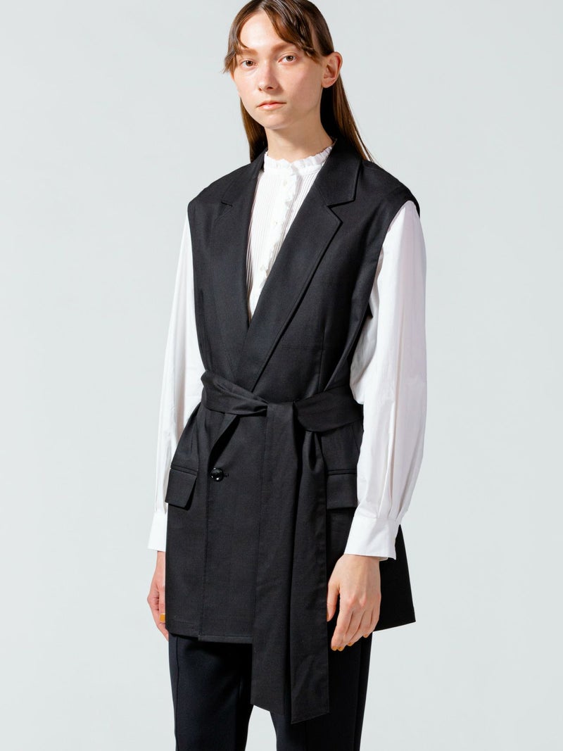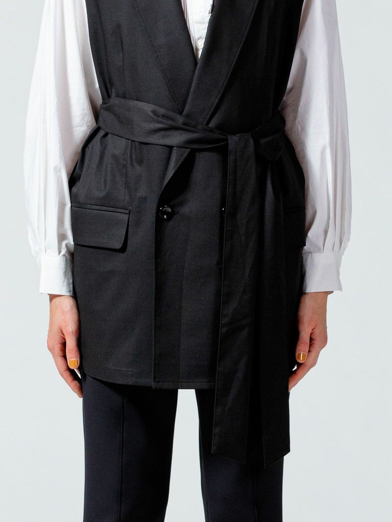 毛羽が少ないクリアな表面感、適度なハリコシのある上質なツイル素材を使用したダブルベストです。そのままTシャツやシャツ・ワンピースにサラッと羽織るだけで印象的なコーディネートができます。広めにとったアームが特長。長めの着丈になったシックで大人の魅力を演出した1枚。ベストには同素材のベルトがセットになっている為、着こなしによってベルトを使用が可能。メリハリのある着こなしにお勧めです。