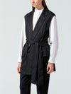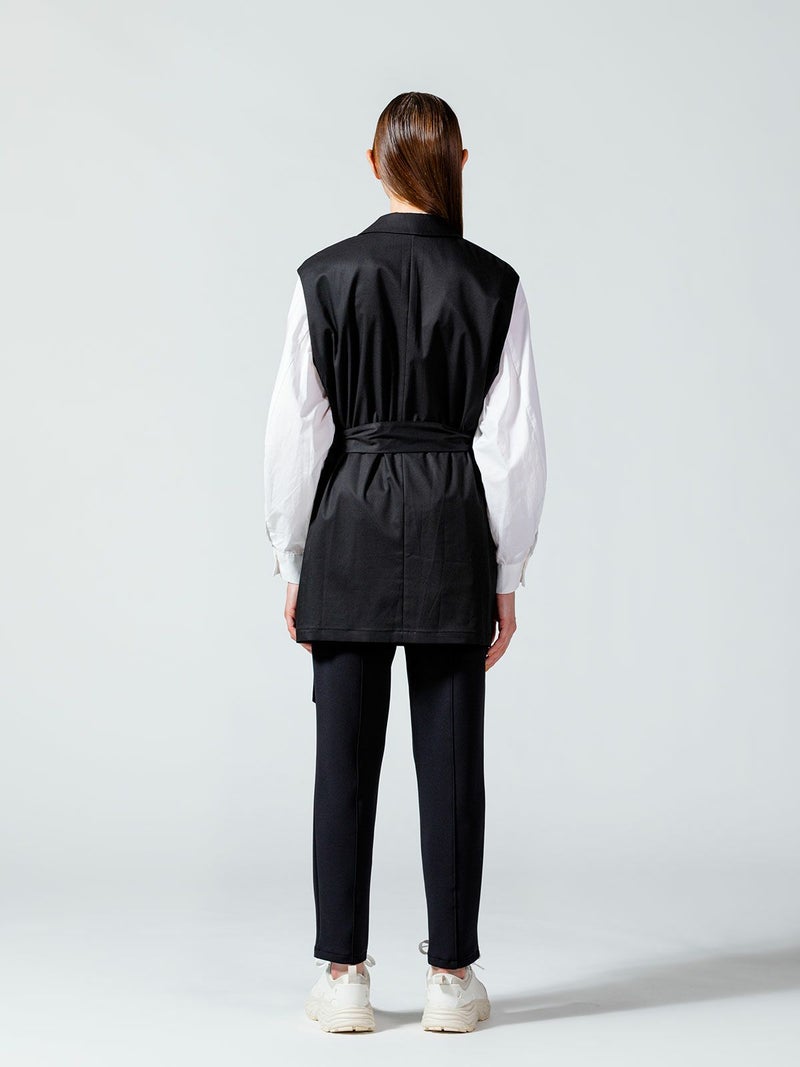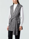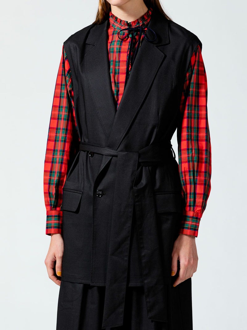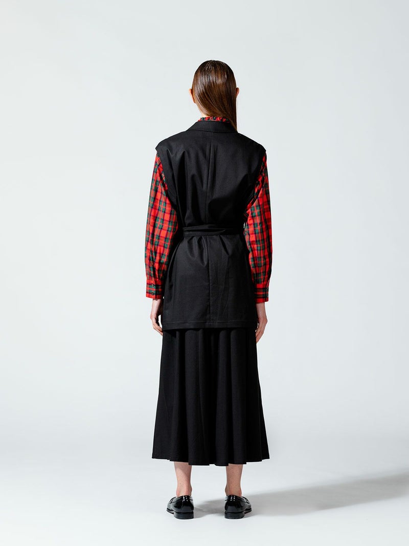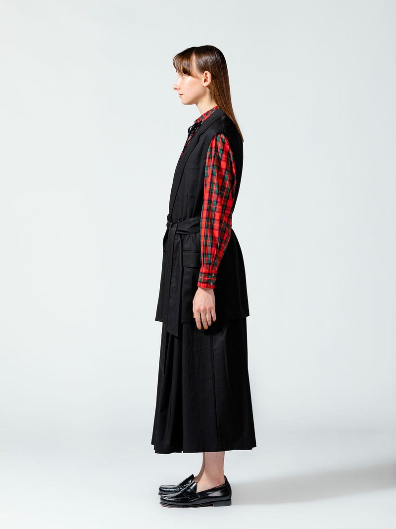 毛羽が少ないクリアな表面感、適度なハリコシのある上質なツイル素材を使用したダブルベストです。そのままTシャツやシャツ・ワンピースにサラッと羽織るだけで印象的なコーディネートができます。広めにとったアームが特長。長めの着丈になったシックで大人の魅力を演出した1枚。ベストには同素材のベルトがセットになっている為、着こなしによってベルトを使用が可能。メリハリのある着こなしにお勧めです。