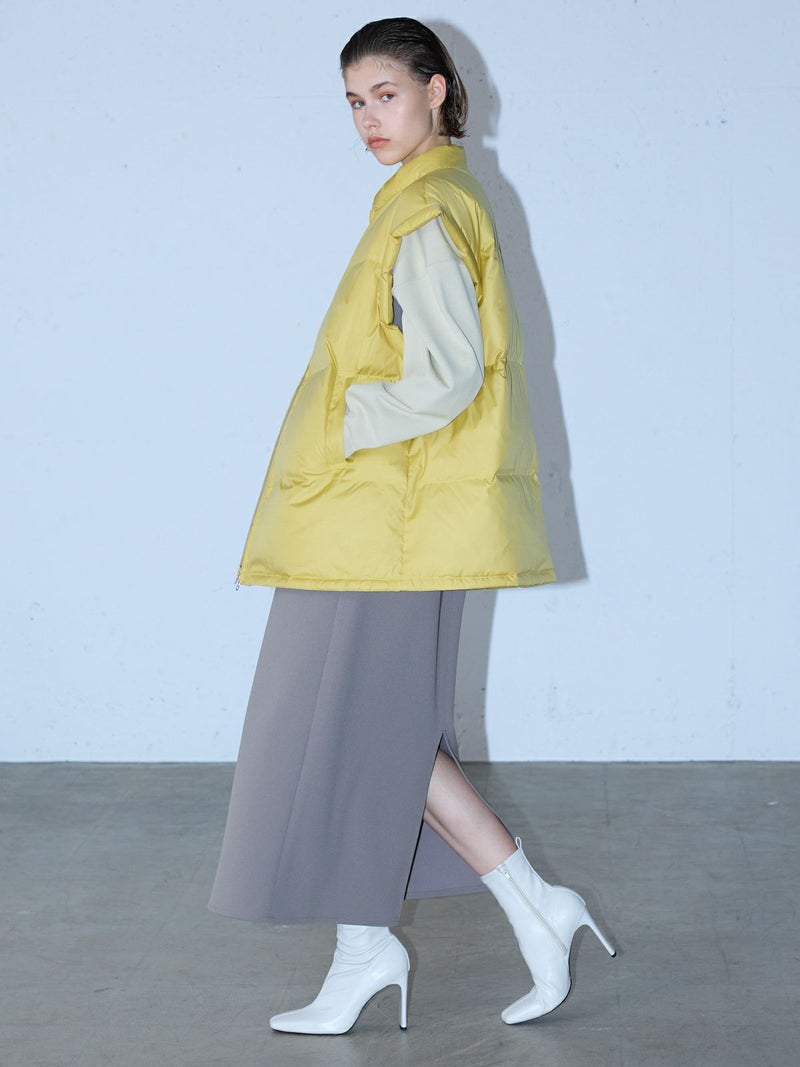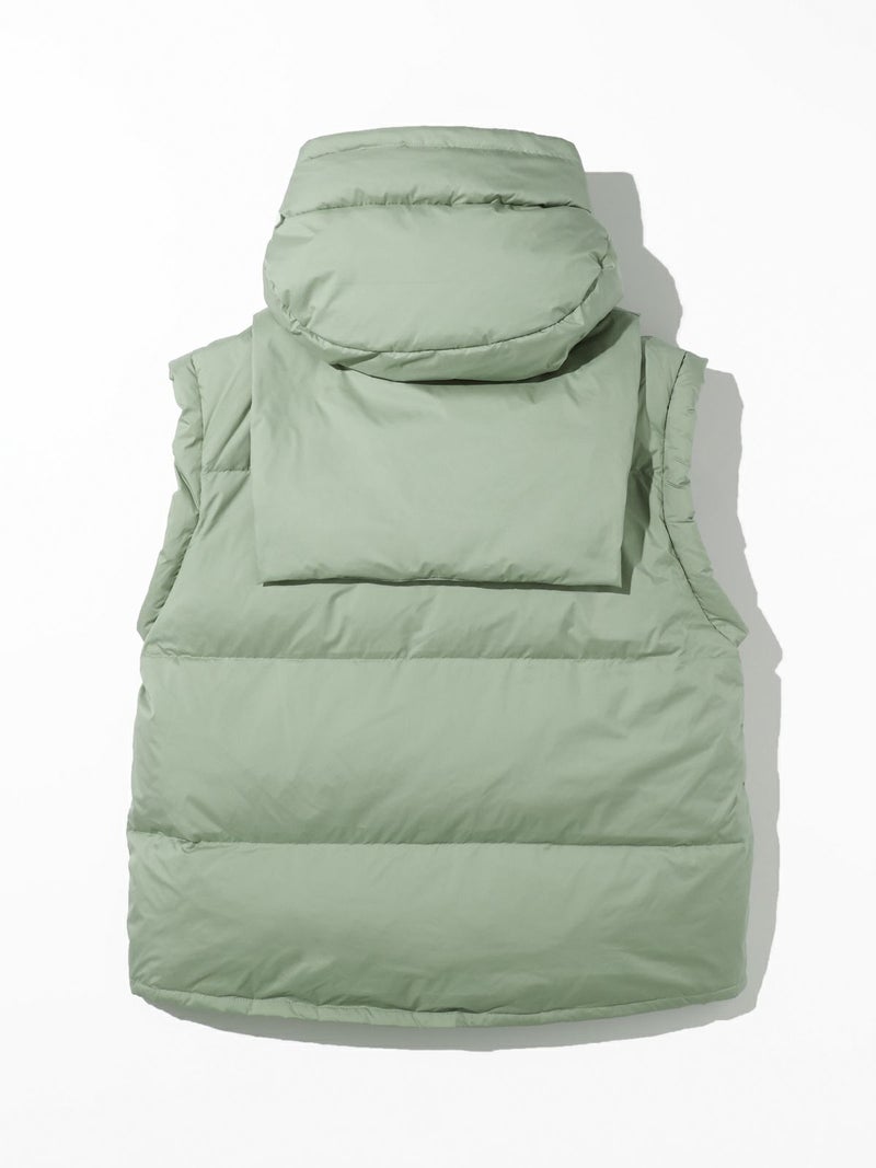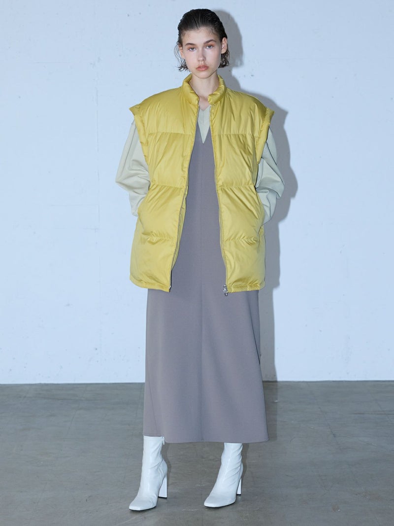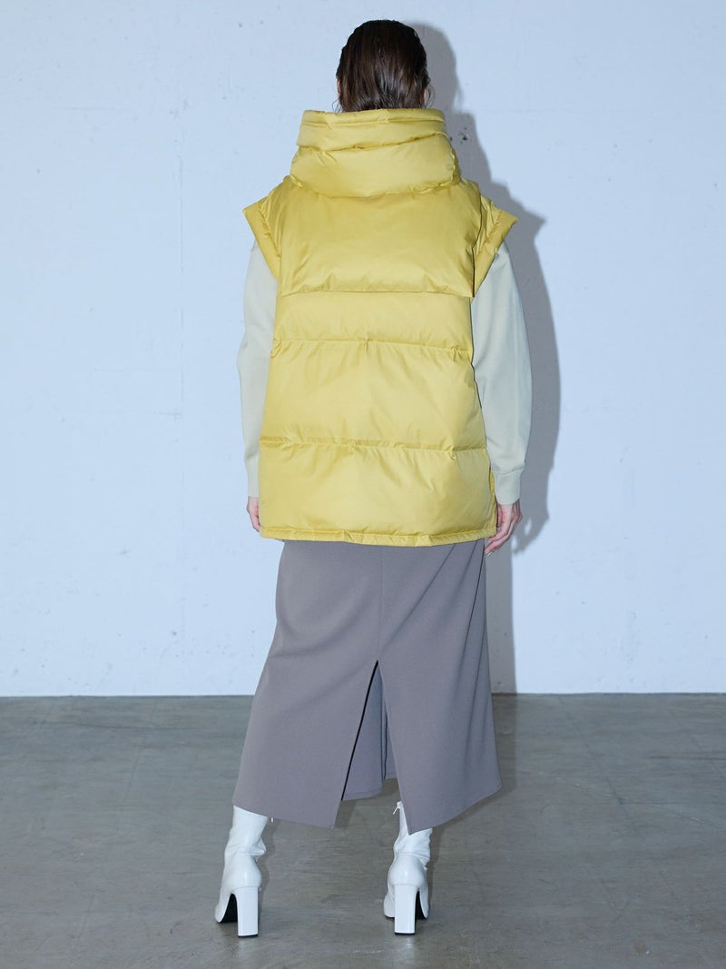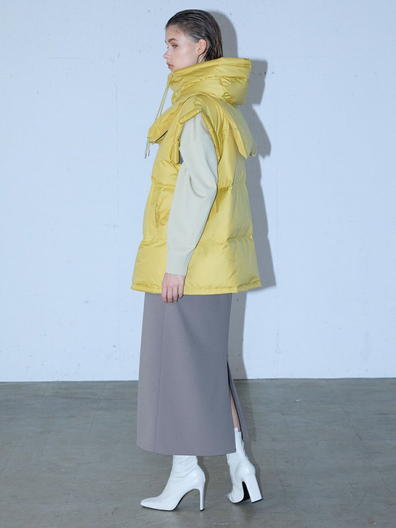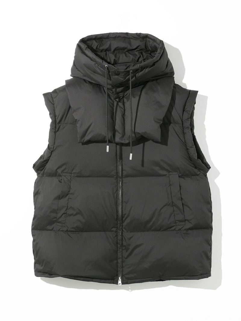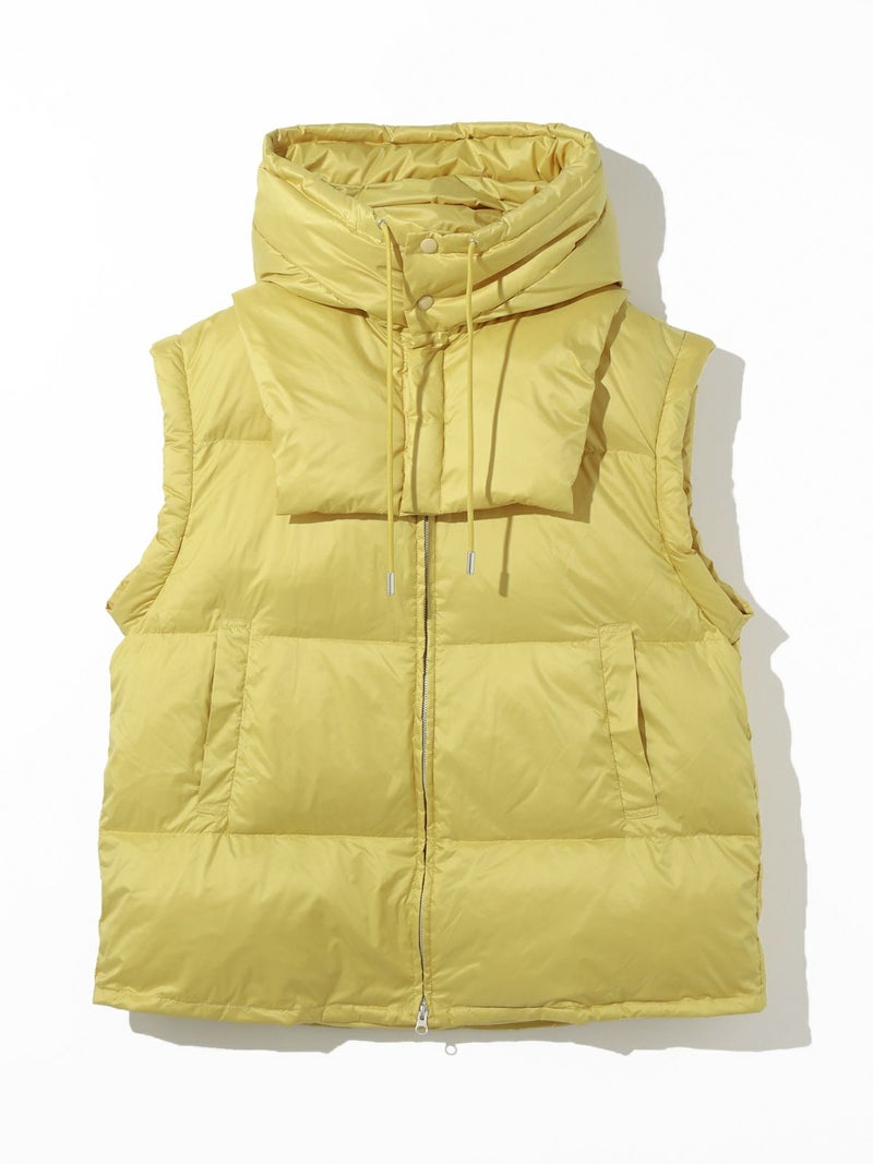 ダウン高混率。MIDIUMISOLIDの暖かなデザイン、ダウンベストです。取り外して別で使えるフードがセットになっており早い時期からシャツやニットにスタイリングしたりと秋冬のムードを楽しめる1枚。ジャケットにフードを合わせたコーデがおすすめ。チュニック丈なので、レディス・メンズともにゆったり着用できるサイズ感が特徴。イエローやカーキを使った落ち着きのある印象的なカラーが魅力のこの冬お勧めのベストです。同シリーズ3-175046/ストール付きノーカラーロングダウンコートも展開中。