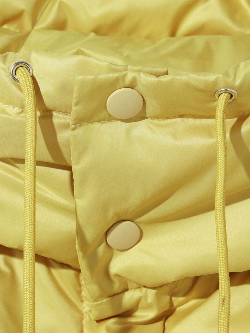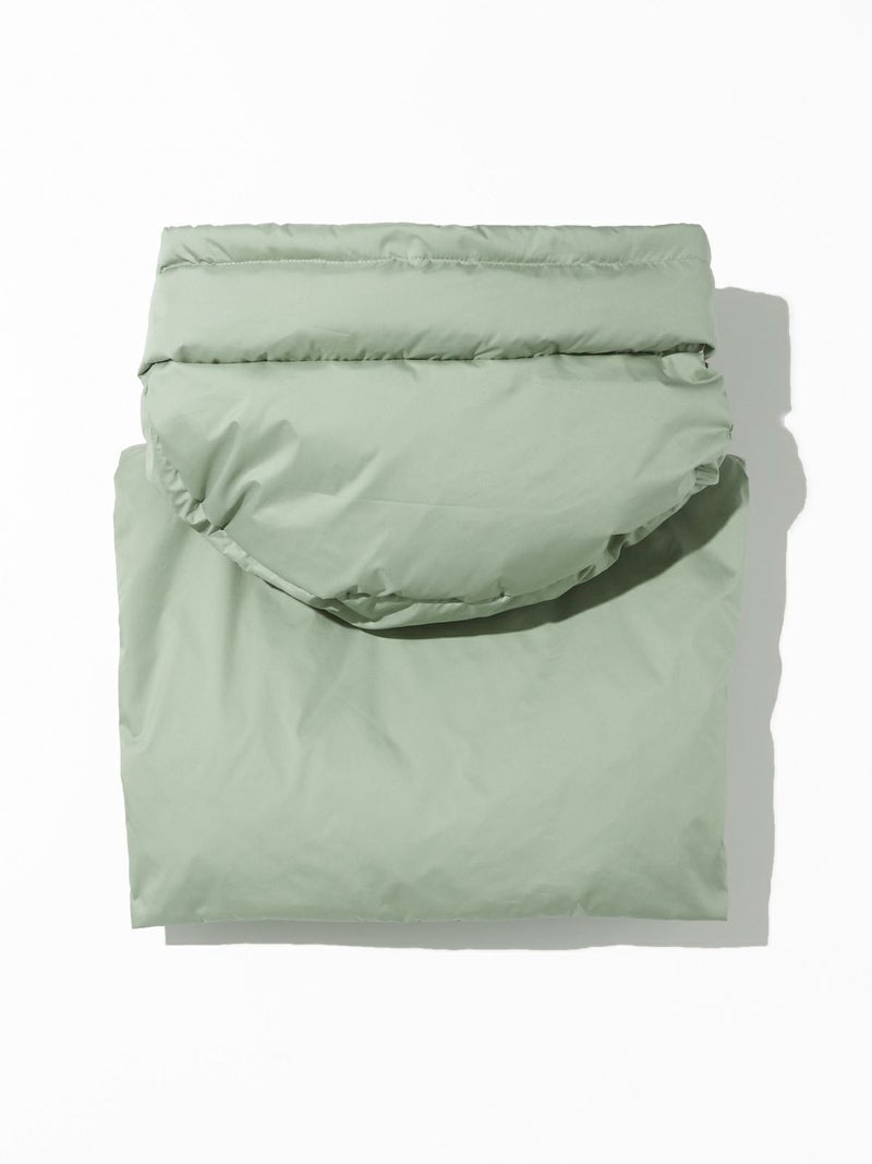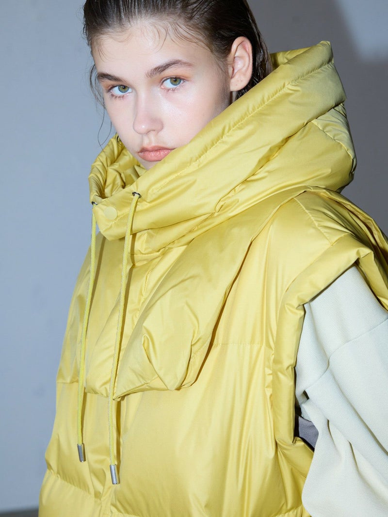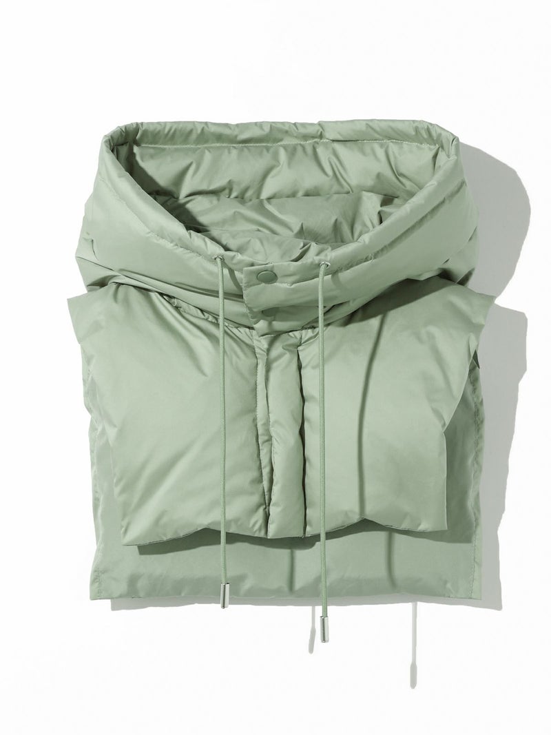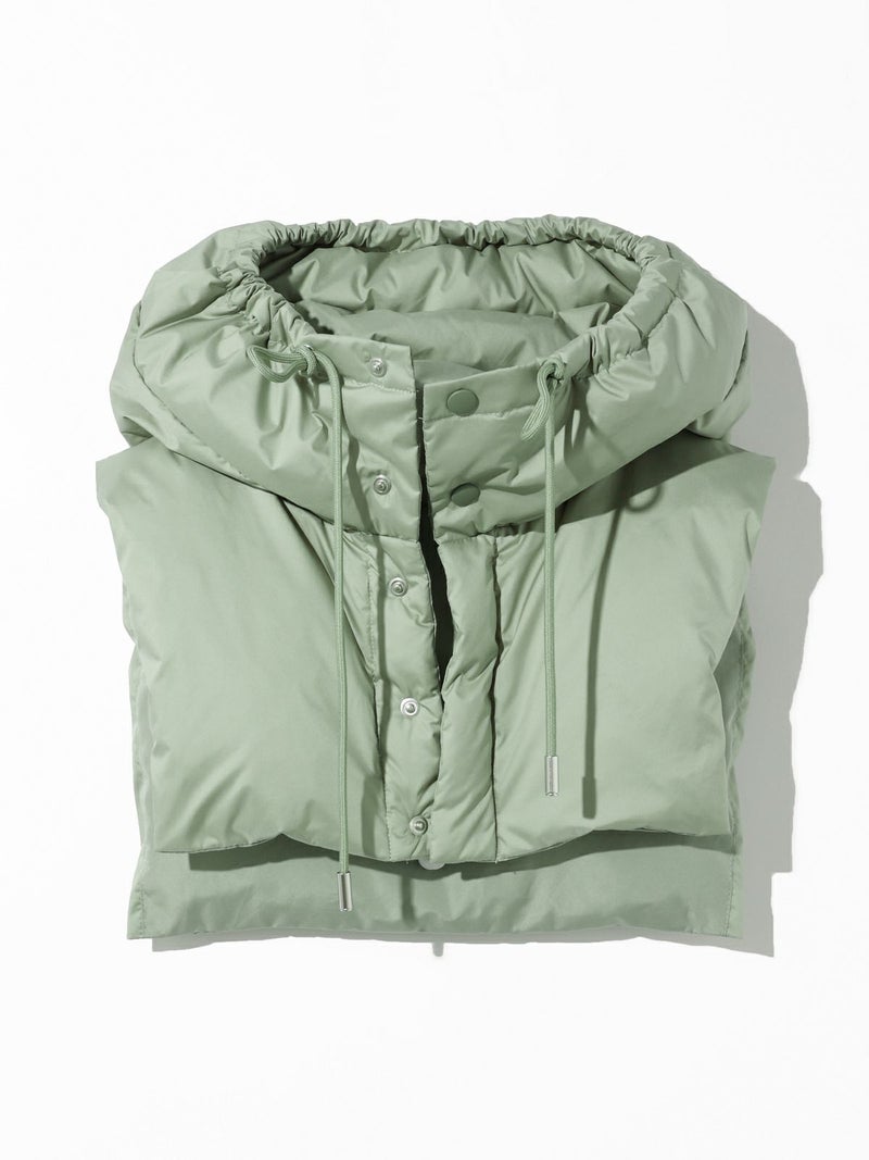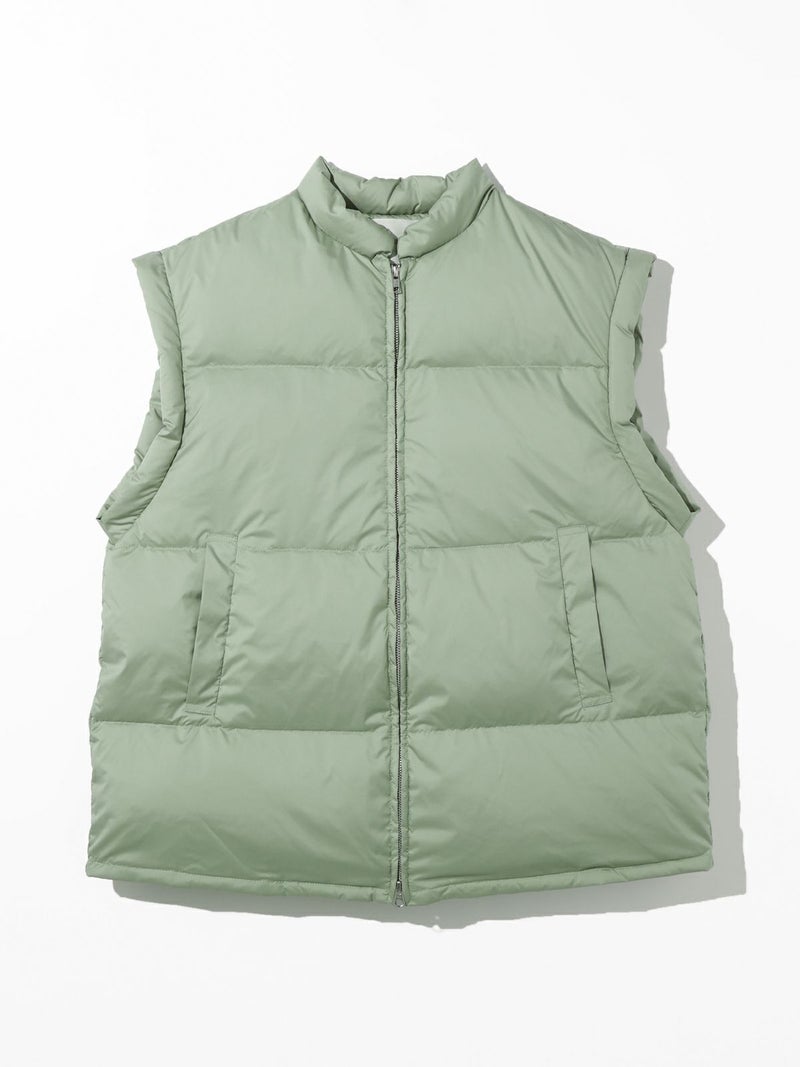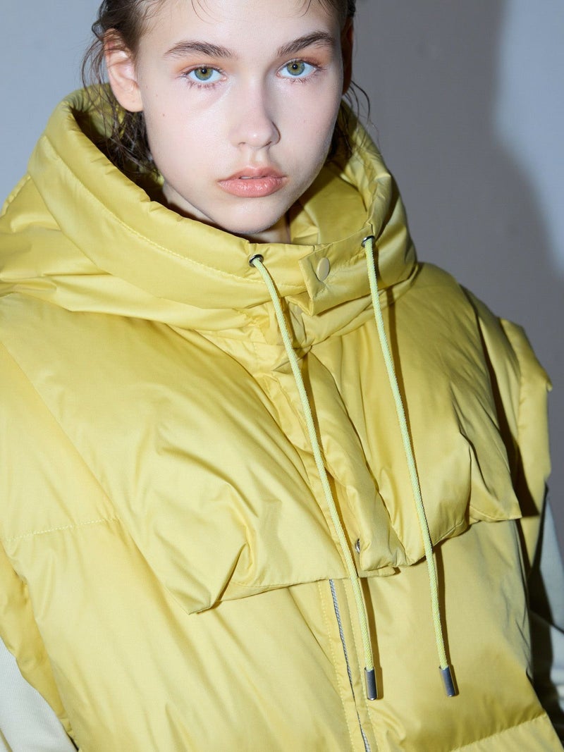ダウン高混率。MIDIUMISOLIDの暖かなデザイン、ダウンベストです。取り外して別で使えるフードがセットになっており早い時期からシャツやニットにスタイリングしたりと秋冬のムードを楽しめる1枚。ジャケットにフードを合わせたコーデがおすすめ。チュニック丈なので、レディス・メンズともにゆったり着用できるサイズ感が特徴。イエローやカーキを使った落ち着きのある印象的なカラーが魅力のこの冬お勧めのベストです。同シリーズ3-175046/ストール付きノーカラーロングダウンコートも展開中。