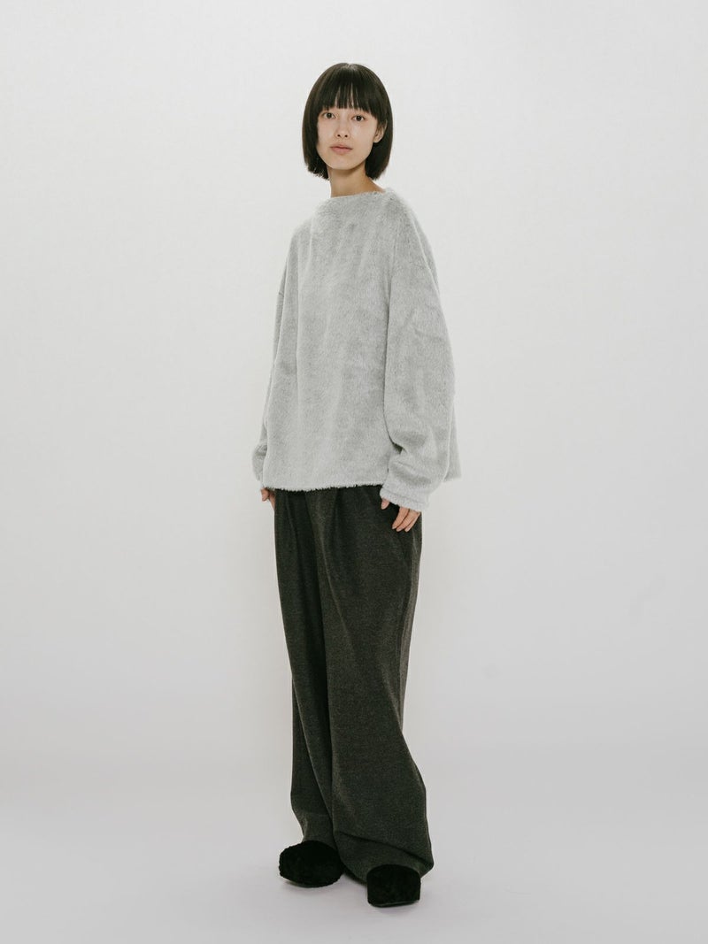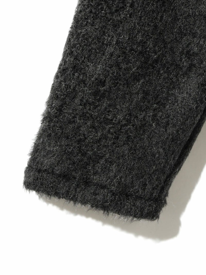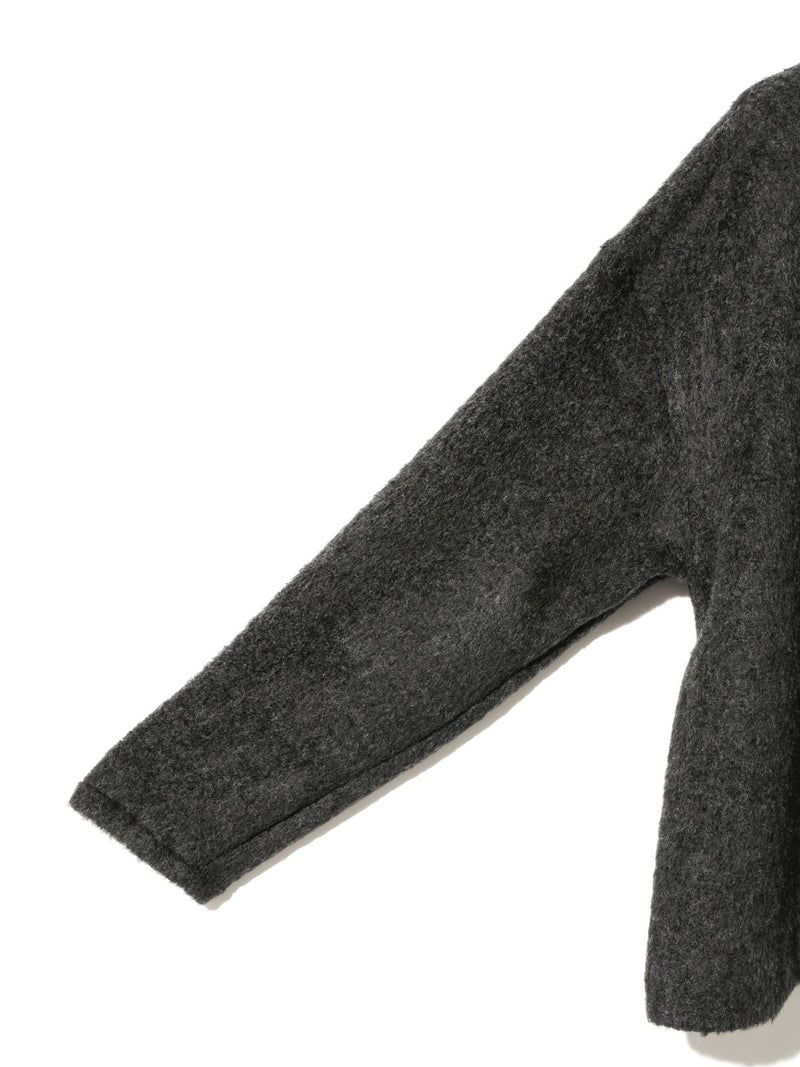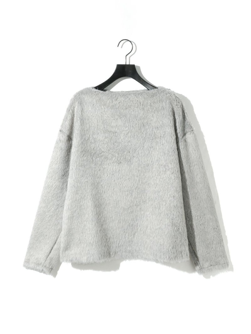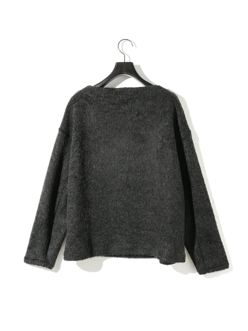 ヒップの2/3ほどを覆う丈感で、ゆったりとリラックスできる着用感。軽さのあるふんわりとしたシャギー素材が心地よく、保温性を感じられる1枚です。