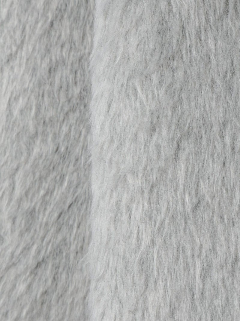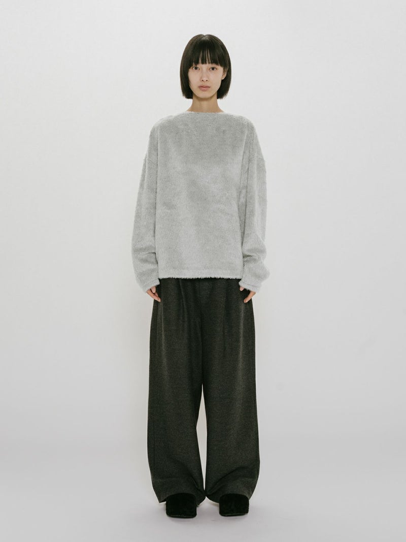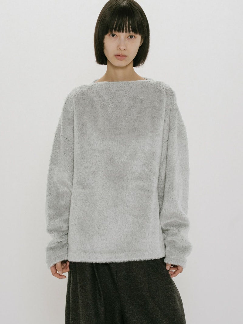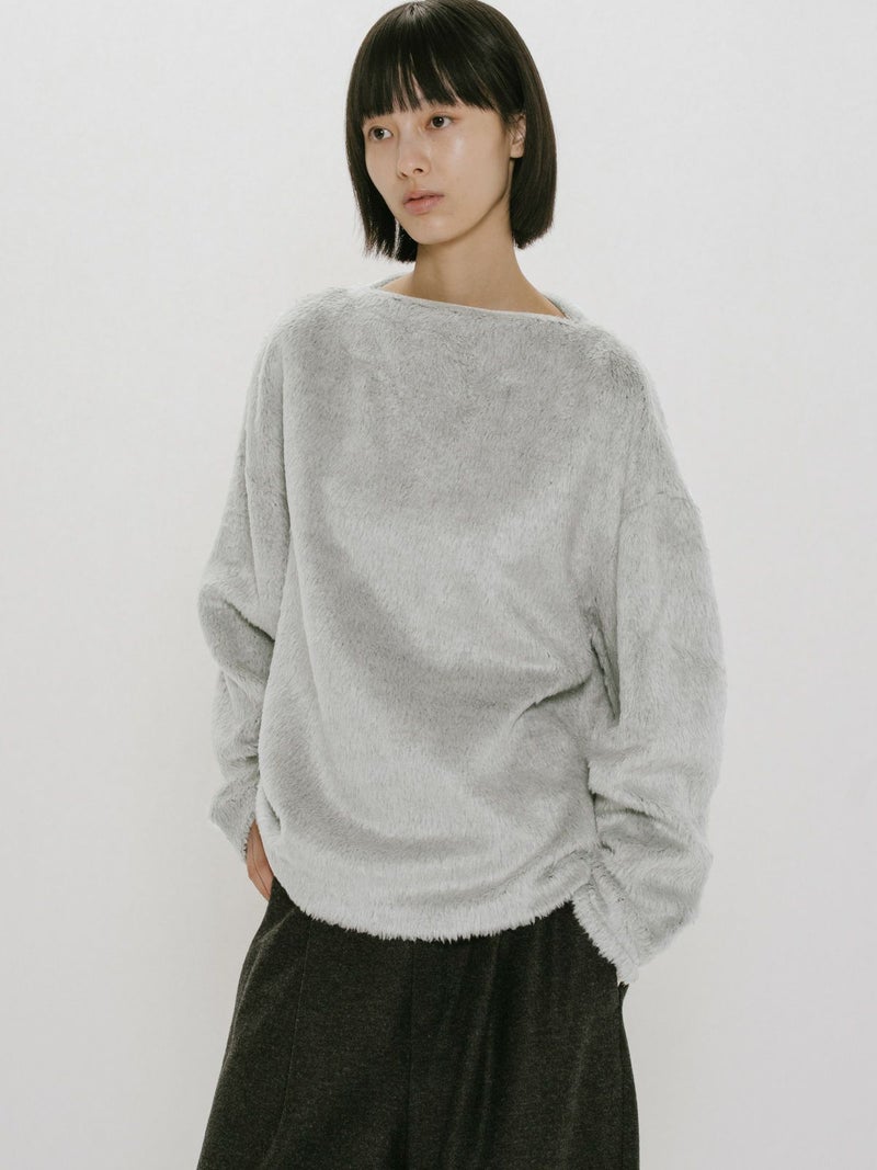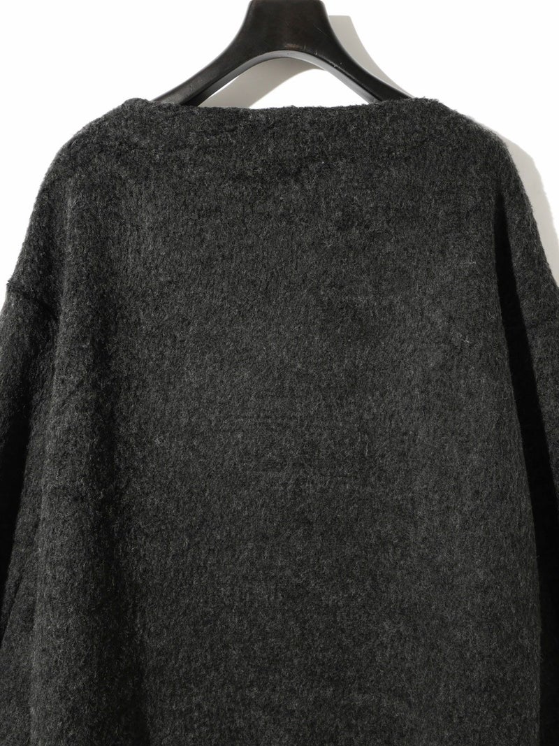 ヒップの2/3ほどを覆う丈感で、ゆったりとリラックスできる着用感。軽さのあるふんわりとしたシャギー素材が心地よく、保温性を感じられる1枚です。