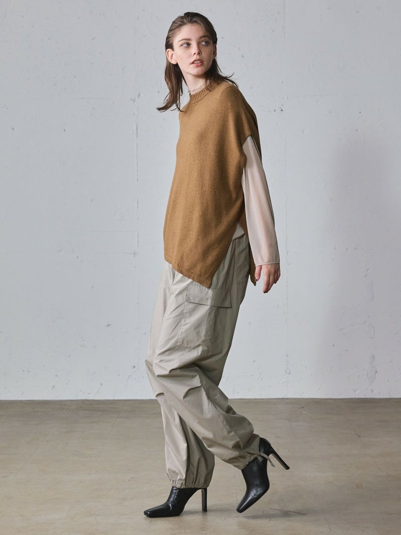 秋のレイヤードな着こなしにお勧めのアシンメトリープルオーバーです。左袖を大きく短くし裾を斜めに長くデザインした左右の異なる魅力のニットです。アシンメトリーの動きのあるシルエットなのでシンプルなコーディネートとの合わせによってどこか華やかな雰囲気を印象付けます。丈のバランスもとりやすく重ね着のしやすいサイズ感となっています。ワンピースに重ねたりカットソーにプラスしたりと、気温の変化に対応しやすくコーディネートのアクセントにお勧めの1枚です。