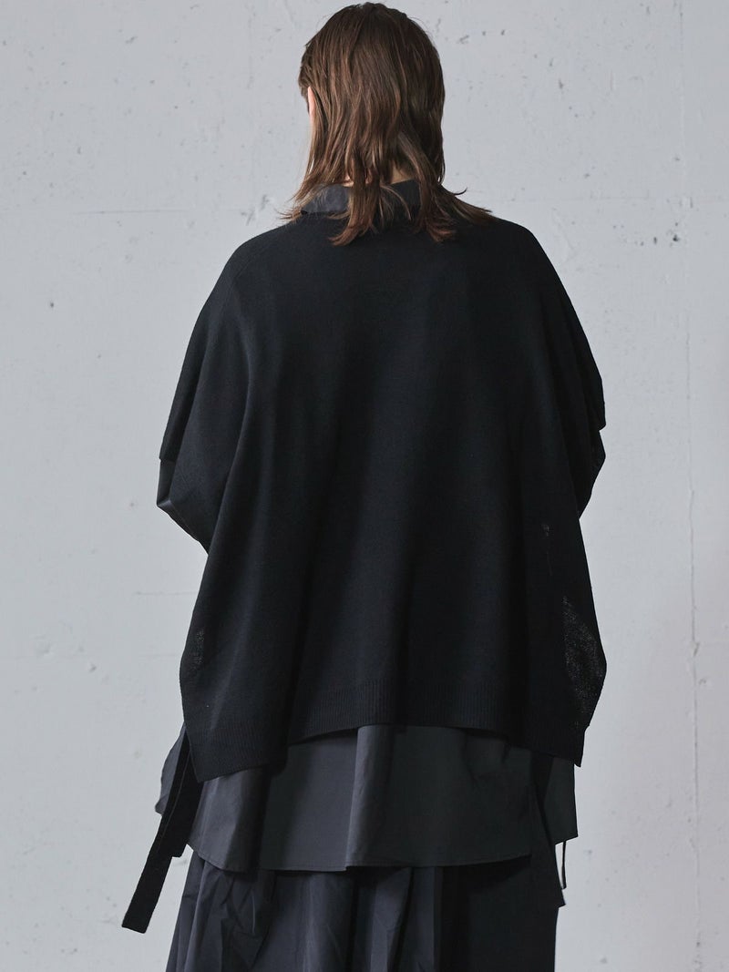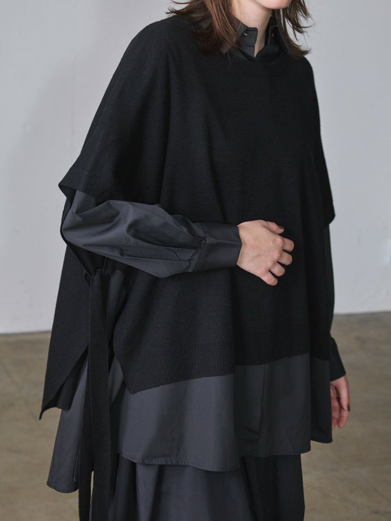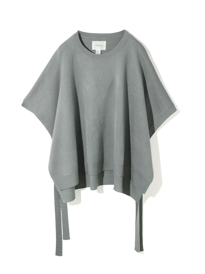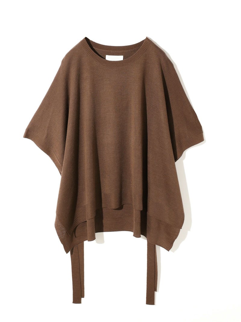 シンプルで女性らしい着こなしにお勧めのニットアイテム、サイドリボンポンチョです。ベーシックなデザインのクルーネックのワイドシルエットを前後の身頃をリボンで繋ぐポンチョニットに仕上げました。シャツワンピースなどのふんわりとしたアイテムにも素敵にレイヤードができる1枚です。ベスト感覚ですが、よりゆったりと動きのあるシルエットを表現。袖が通しやすく脱ぎ着のしやすいのもポイント。前後差を付けた丈感でリボンの結び方をラフにでもリボン結びでもお好みで演出していただけます。重ね着を魅力的に印象付けるポンチョです。