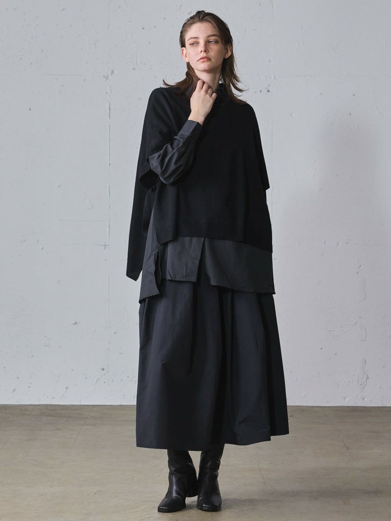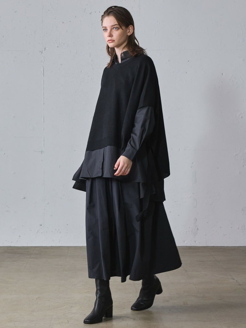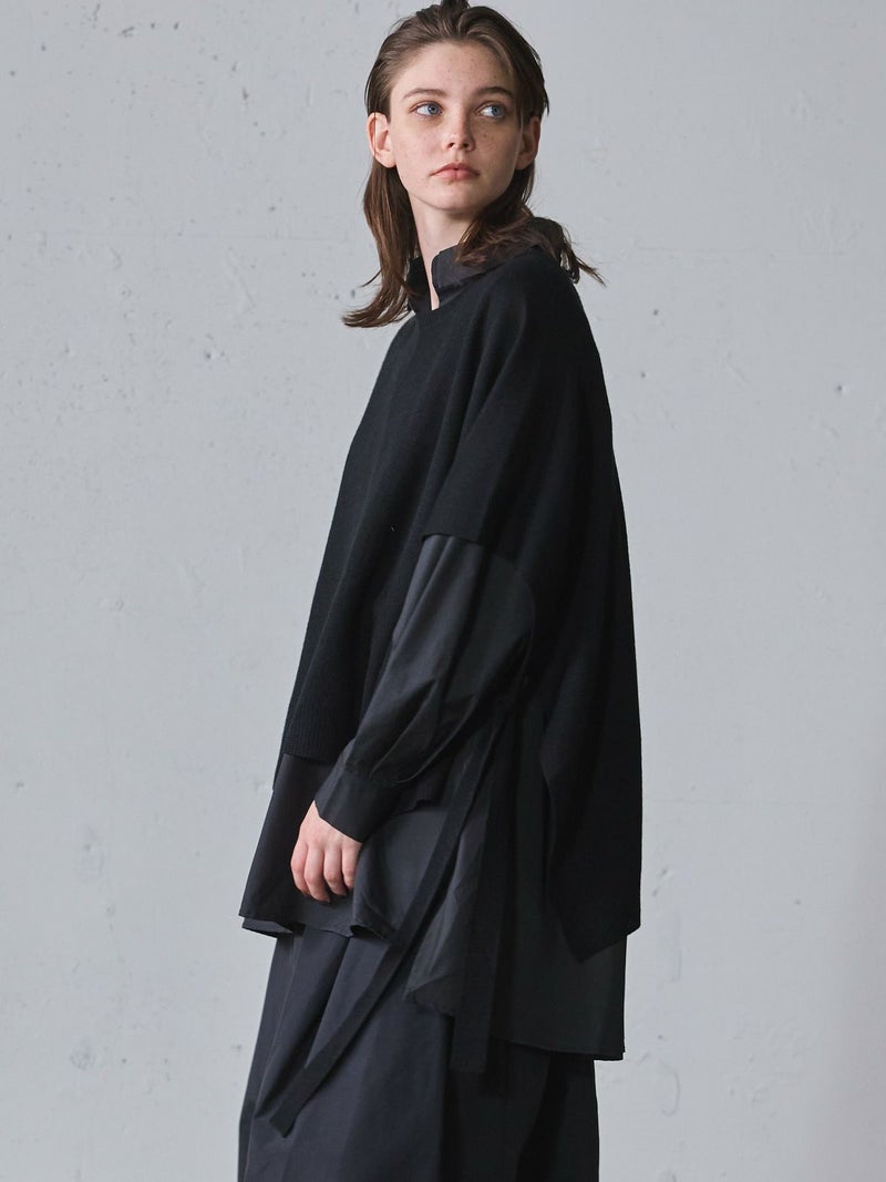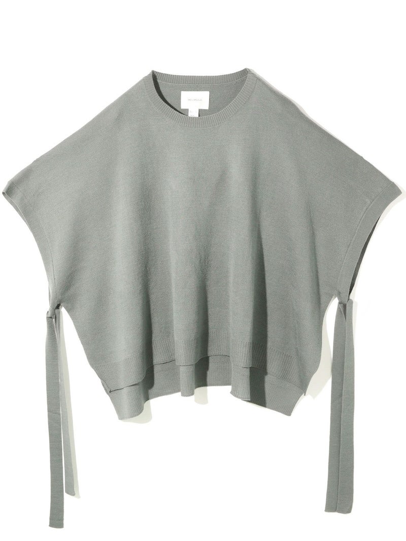 シンプルで女性らしい着こなしにお勧めのニットアイテム、サイドリボンポンチョです。ベーシックなデザインのクルーネックのワイドシルエットを前後の身頃をリボンで繋ぐポンチョニットに仕上げました。シャツワンピースなどのふんわりとしたアイテムにも素敵にレイヤードができる1枚です。ベスト感覚ですが、よりゆったりと動きのあるシルエットを表現。袖が通しやすく脱ぎ着のしやすいのもポイント。前後差を付けた丈感でリボンの結び方をラフにでもリボン結びでもお好みで演出していただけます。重ね着を魅力的に印象付けるポンチョです。