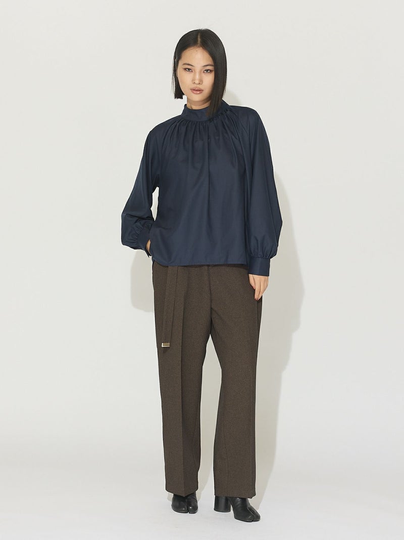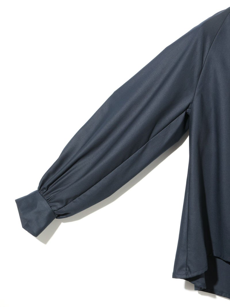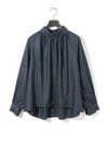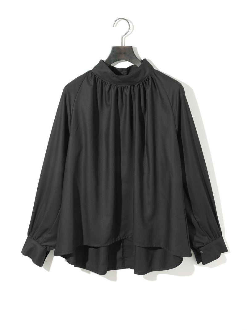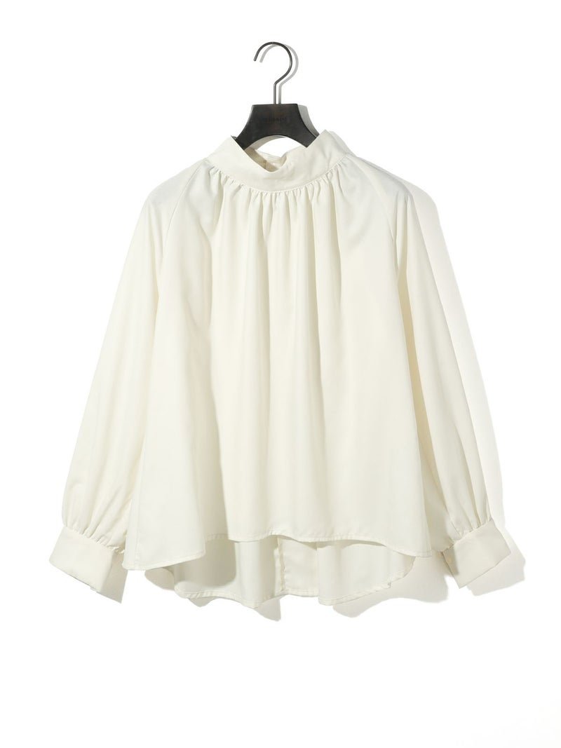 夏に人気のあった2-132169のブラウスを長袖にデザイン変更したハイネックギャザーブラウスです。ボリュームのある袖が特徴的で2段階に調整のきくカフス仕様です。ハイネックの襟元にギャザーを施したことでクラシックなデザインが印象的。前後差を付けた裾ラインは丸みがあり上品なフレアラインを表現。バックネック部分にボタンが付いているので着脱のしやすいのもポイントです。光沢と落ち感のある素材で清楚に着こなせる1枚です。