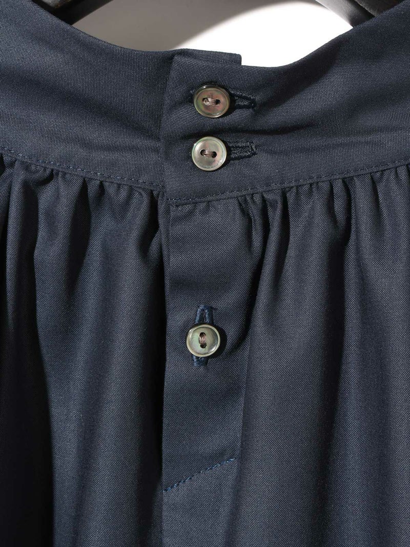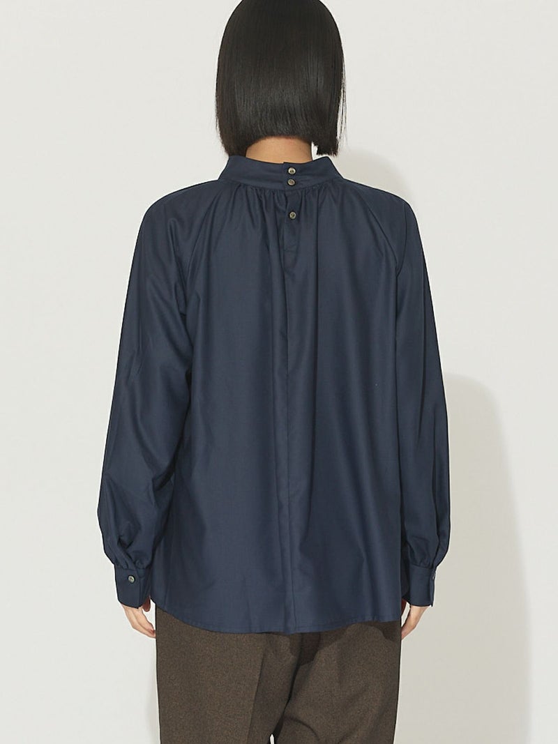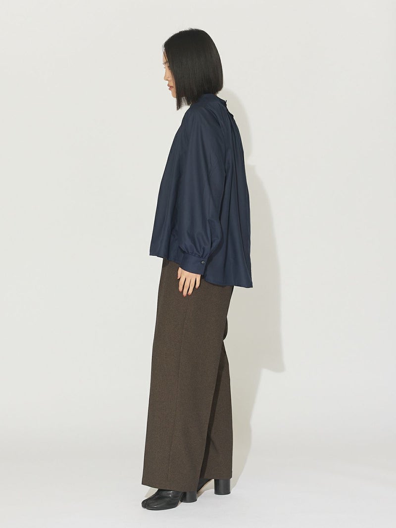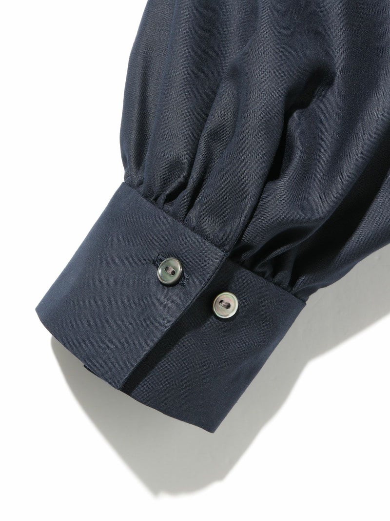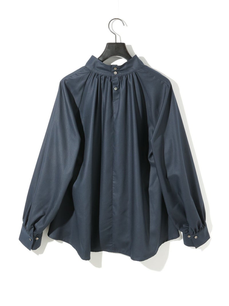 夏に人気のあった2-132169のブラウスを長袖にデザイン変更したハイネックギャザーブラウスです。ボリュームのある袖が特徴的で2段階に調整のきくカフス仕様です。ハイネックの襟元にギャザーを施したことでクラシックなデザインが印象的。前後差を付けた裾ラインは丸みがあり上品なフレアラインを表現。バックネック部分にボタンが付いているので着脱のしやすいのもポイントです。光沢と落ち感のある素材で清楚に着こなせる1枚です。