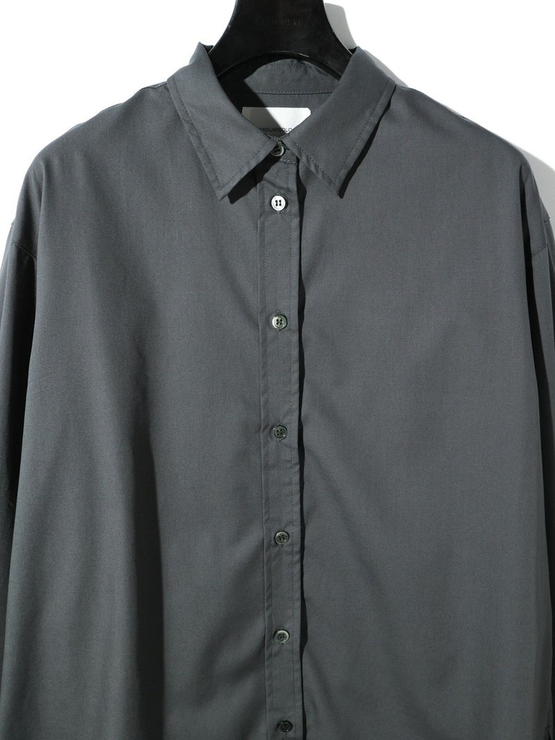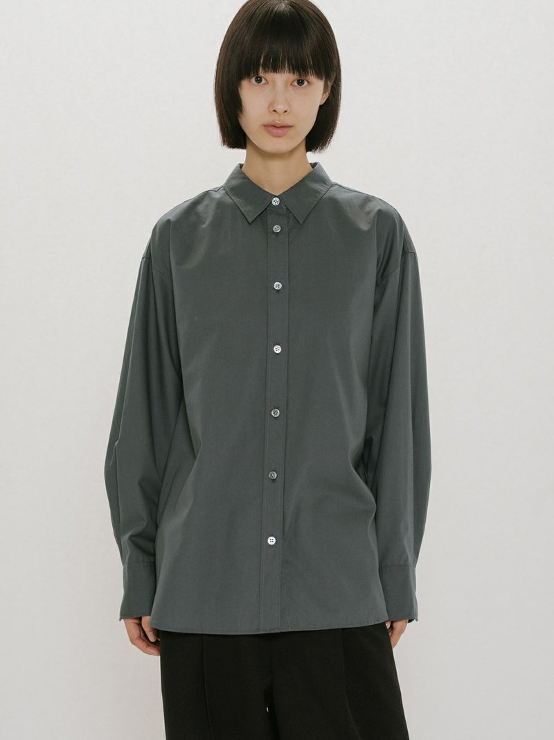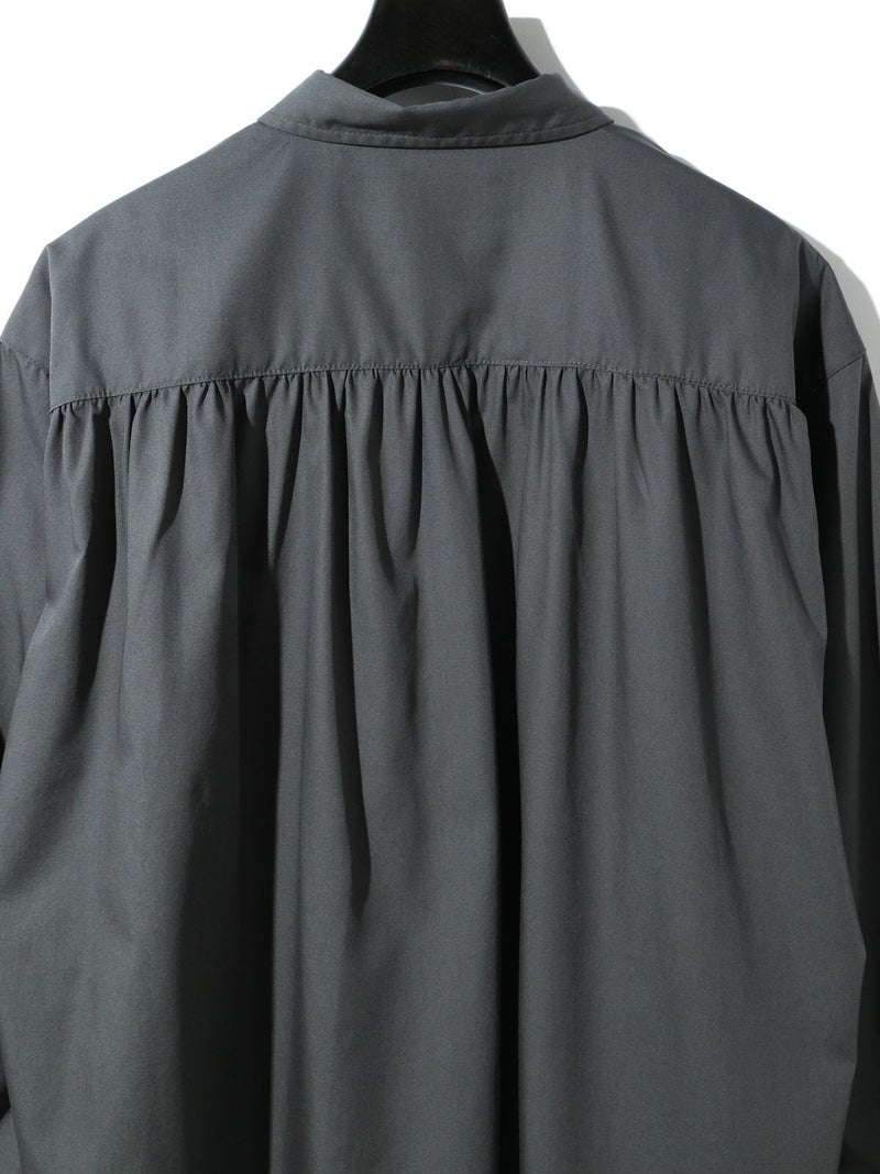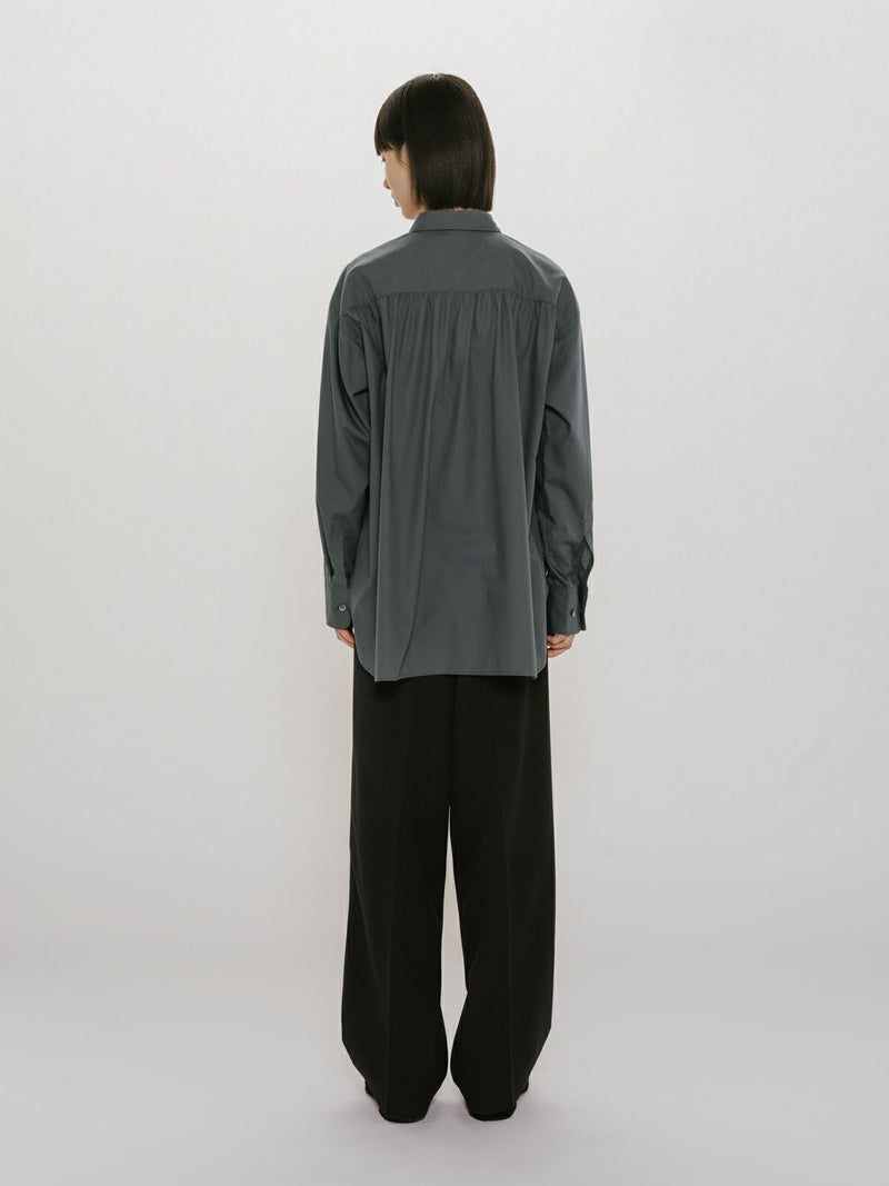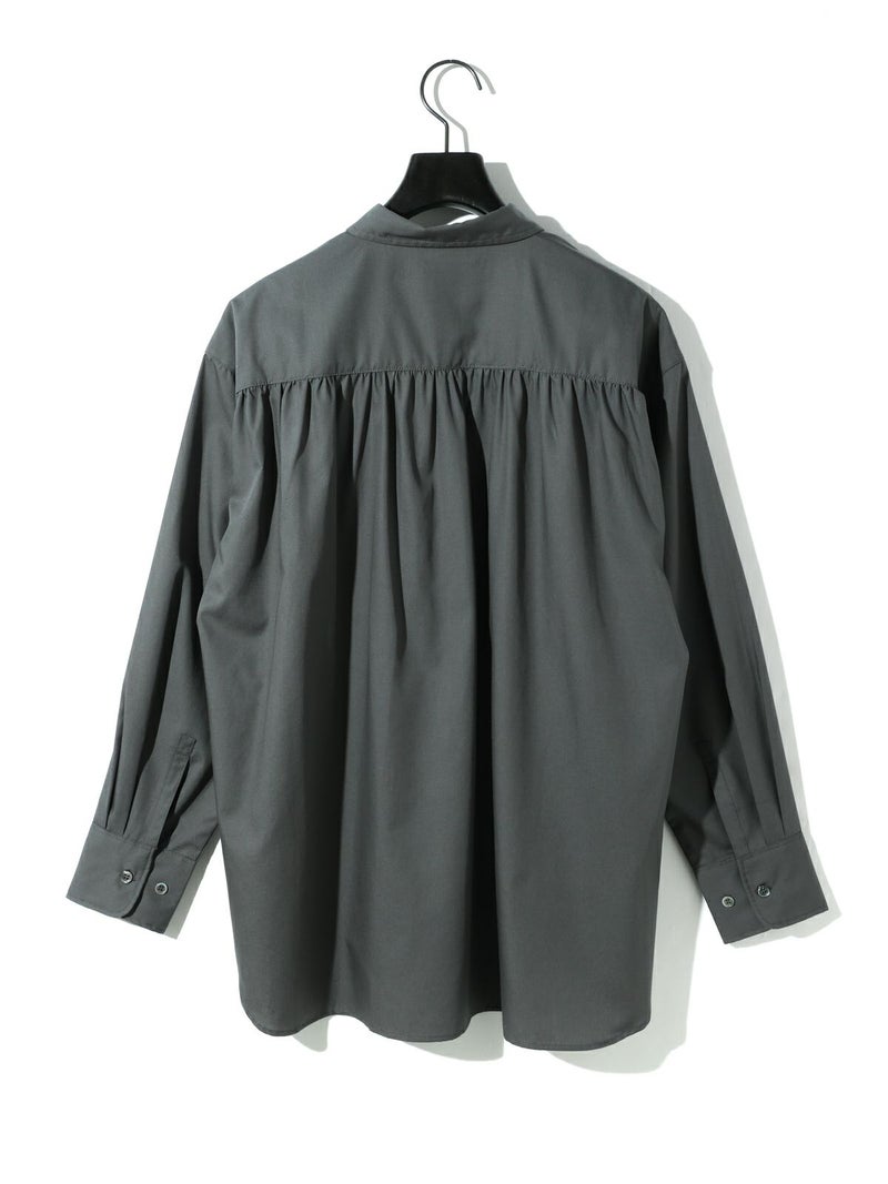 長いシーズンで愛用していただきやすい、ベーシックバックギャザーシャツです。ワイドな身幅でゆったりと着用していただきやすいデザインです。フロント面はベーシックなデザイン、バックはギャザーが入っていることでふんわりとしたシルエットを演出します。若干の前後差が付いています。落ち着きのある色合いなのでシックに決まる1枚です。