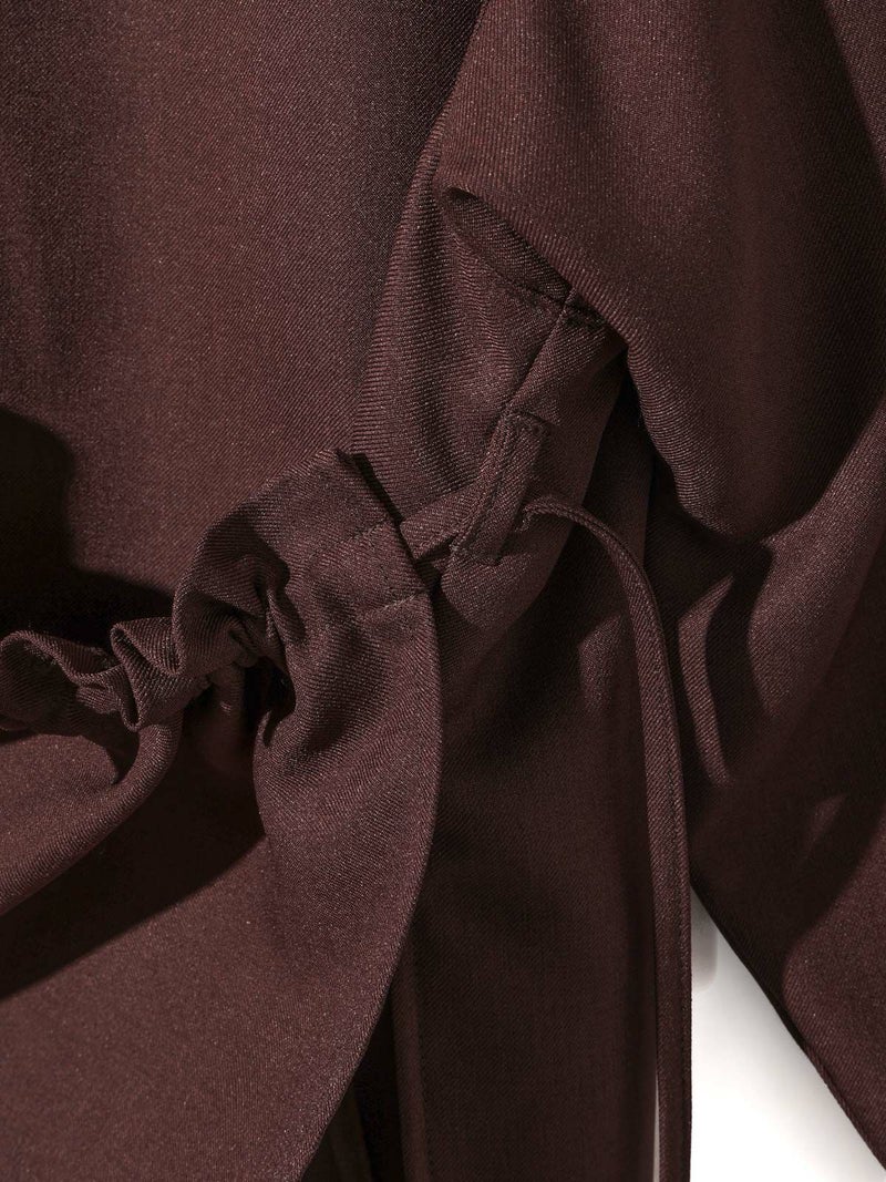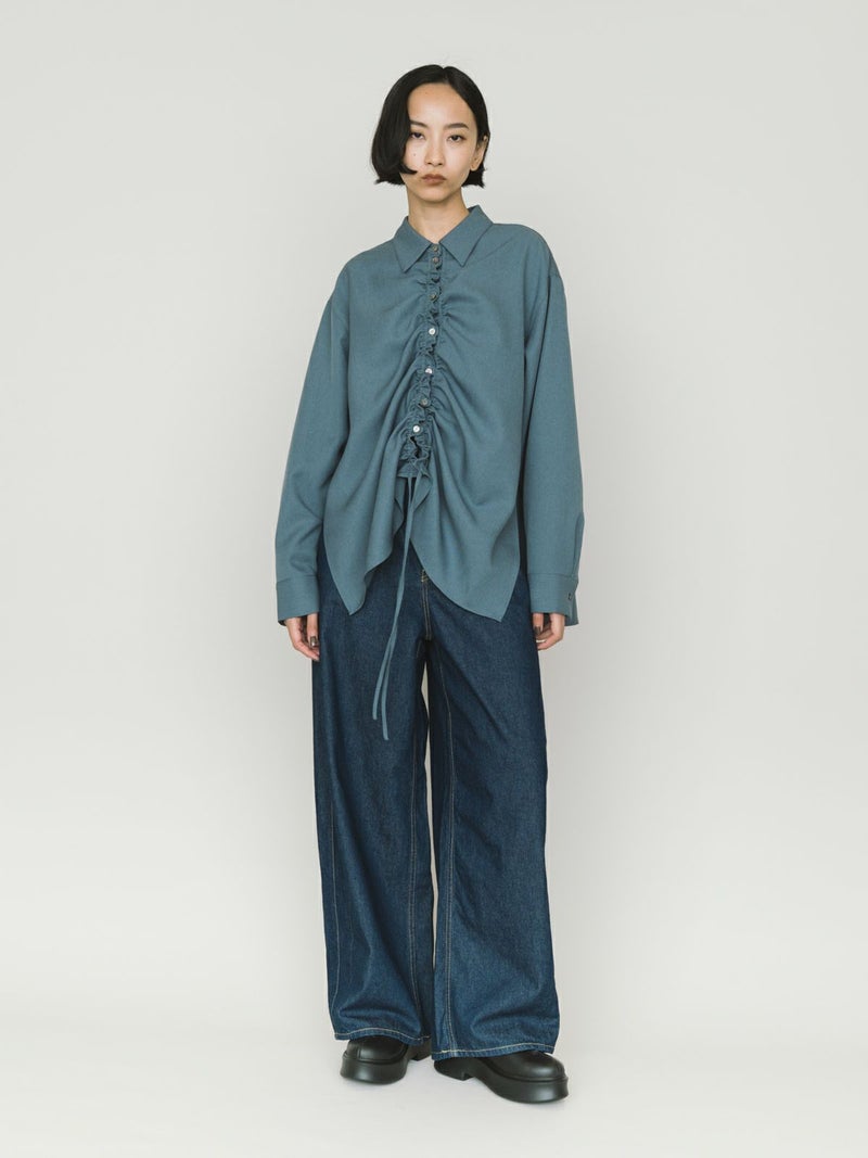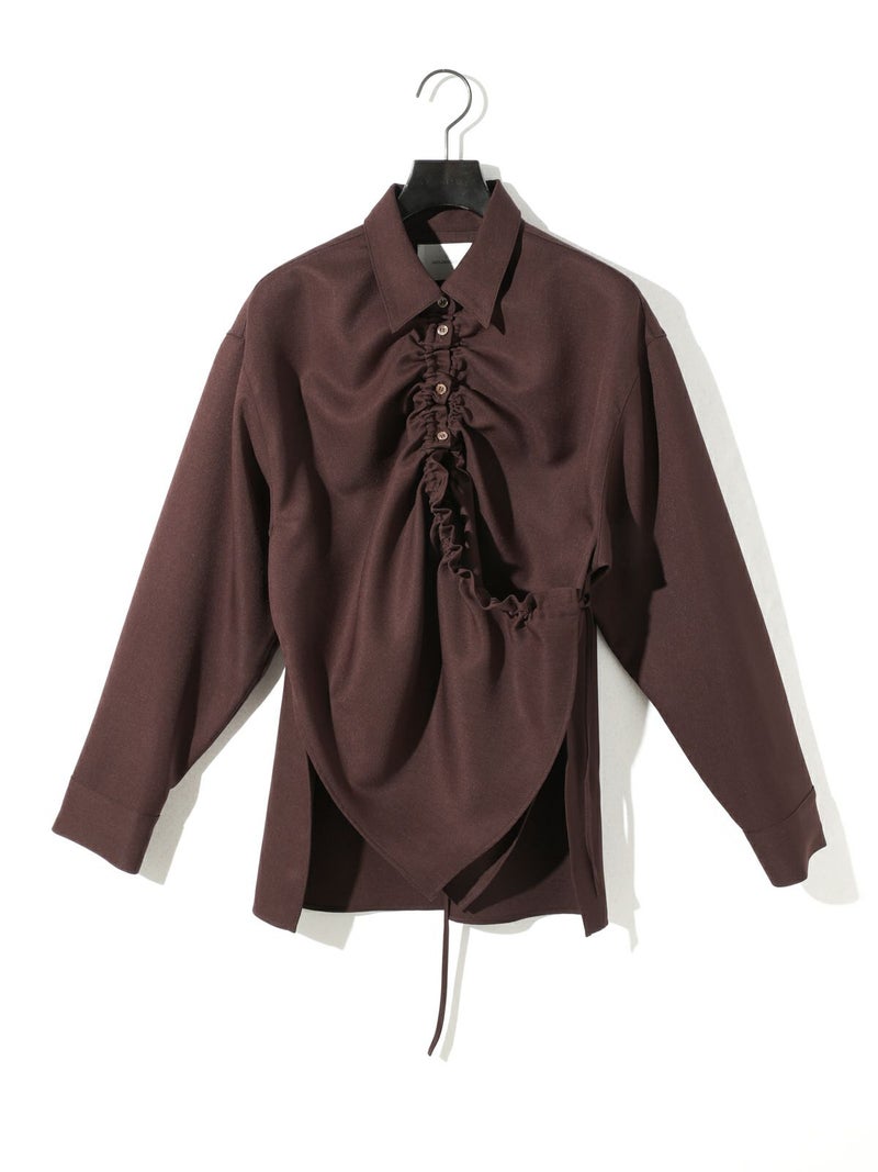 春夏で好調だったドローストリングシャツが秋冬でも新登場したドローストリングシャツです。パウダリータッチで防シワ加工、冷感接触生地が特徴。春夏より少しタイト目にシルエット変更しています。ユニセックスで着用可能。清楚で上品な着こなしにお勧めで、ドロストのアレンジを楽しんでいただけるアイテムになっています。片方だけあげてもOK、両方上げてもOK。ボトムとのバランスを考えてコーディネートを印象的にできる1枚です。