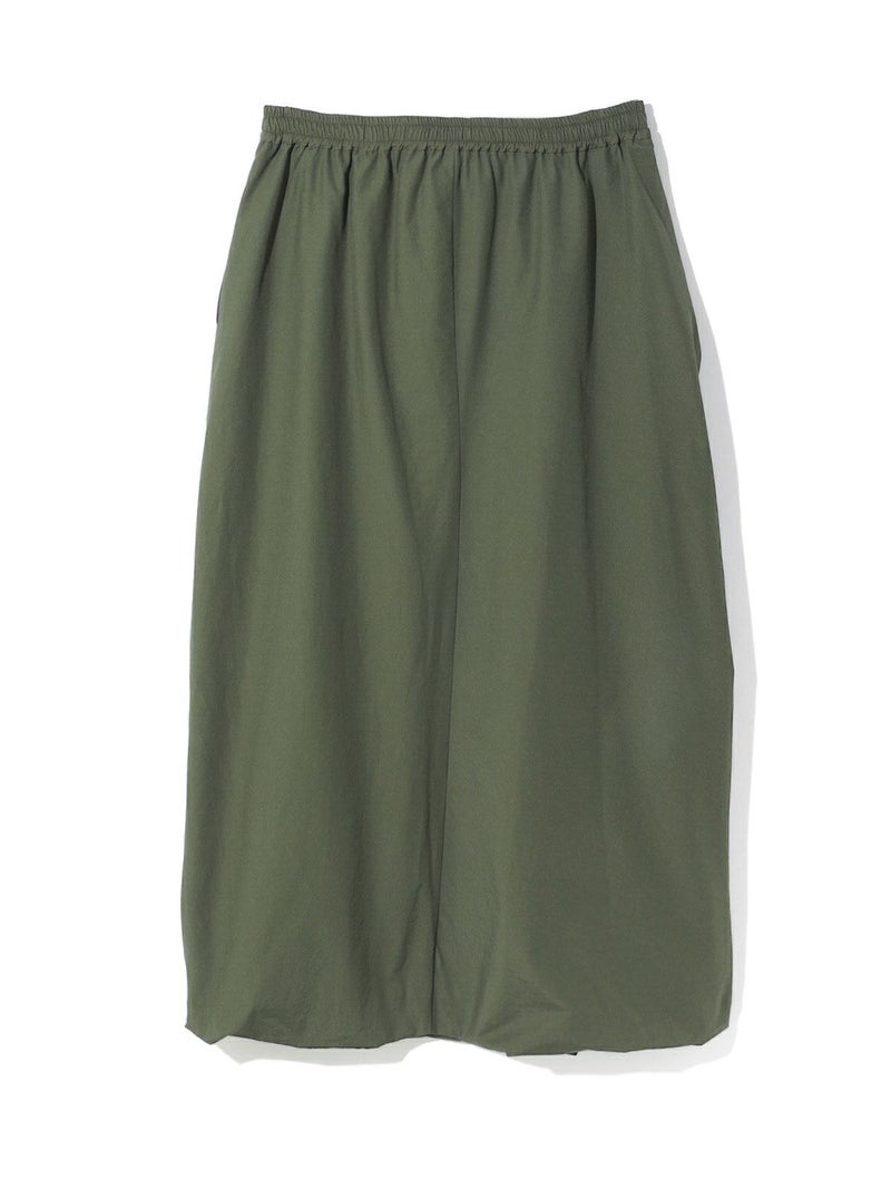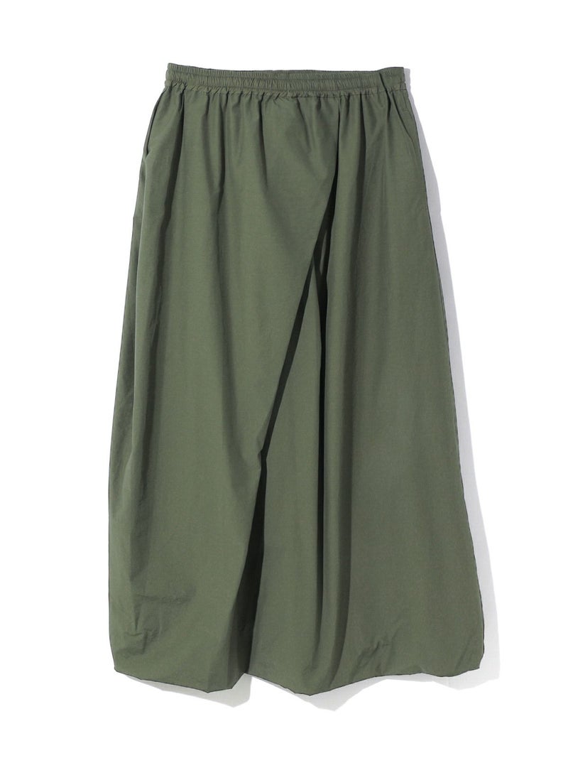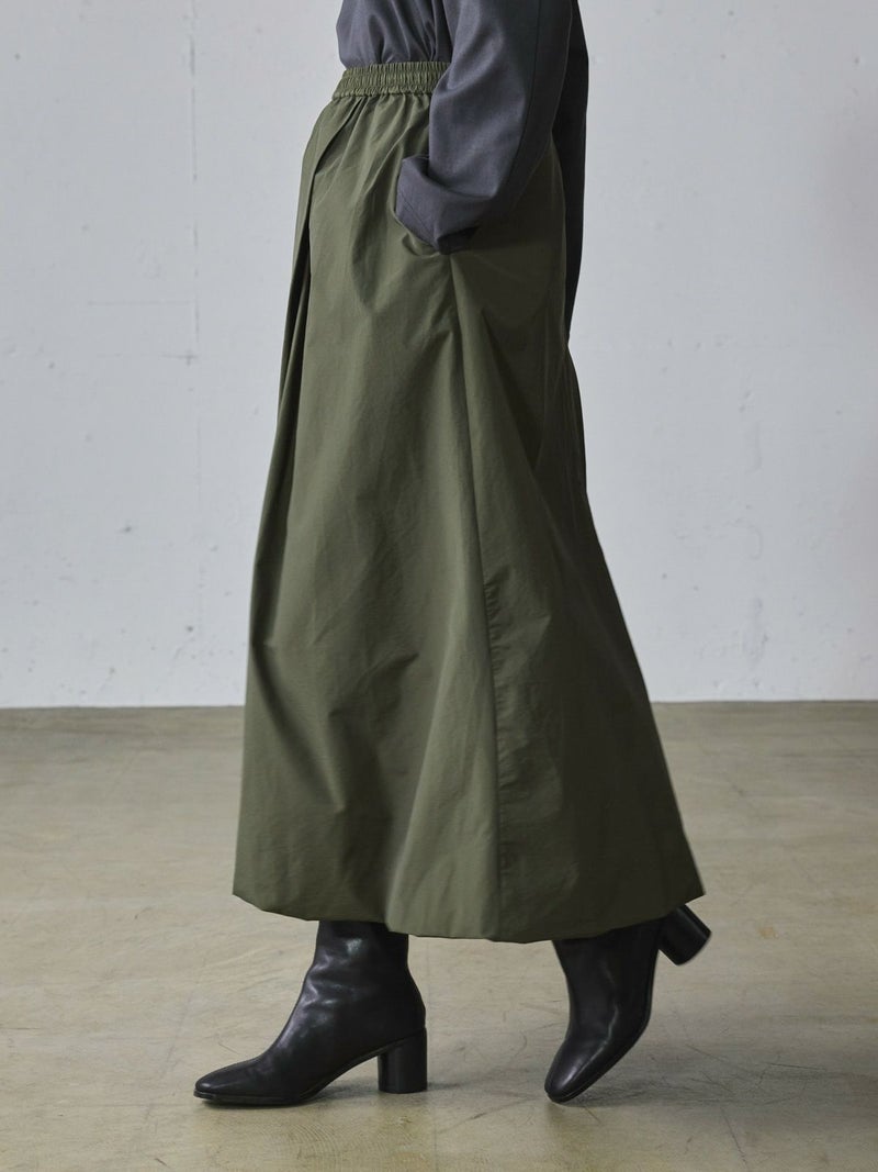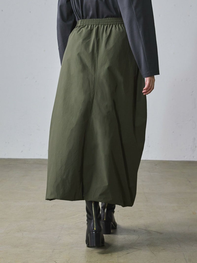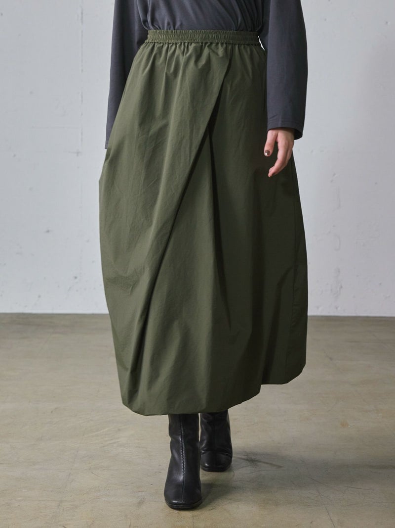 昨年人気だったロングスカートが今季も再登場しました。立体的シルエットが特徴のナイロンドレープアシンメトリースカートです。フロントタックを施した動きのあるデザインと裾はバルーン仕上げのふんわり感のあるシルエットを表現しました。ウエストはゴム使用。左ポケット付。女性らしい丸みを演出したロングスカートでシーズンも長く愛用できるのもポイント。今季もお勧めの1枚となっています。