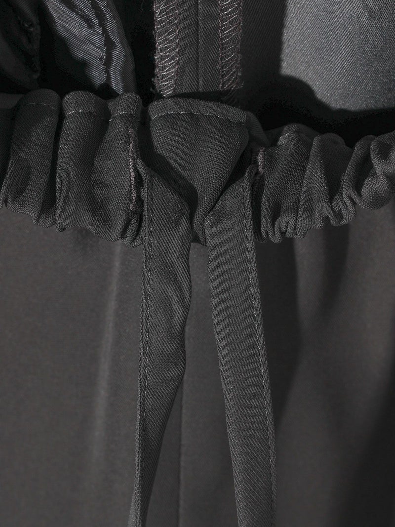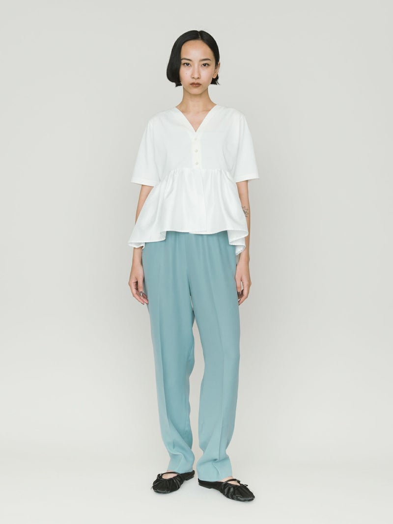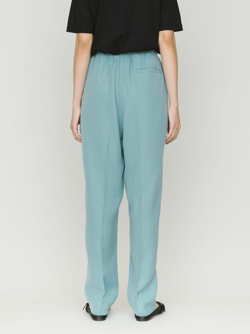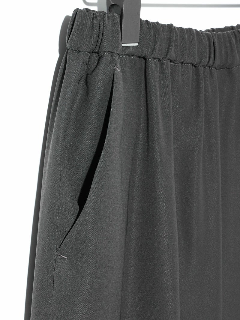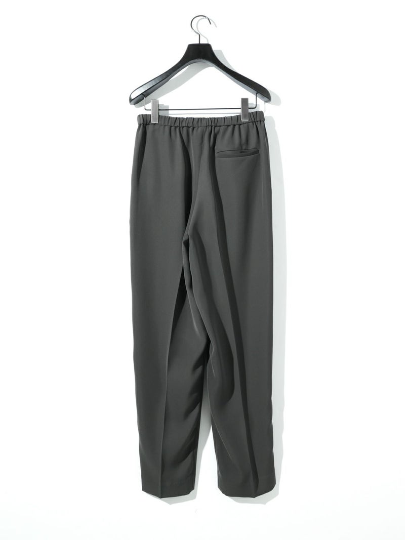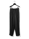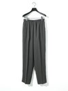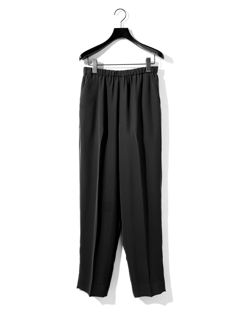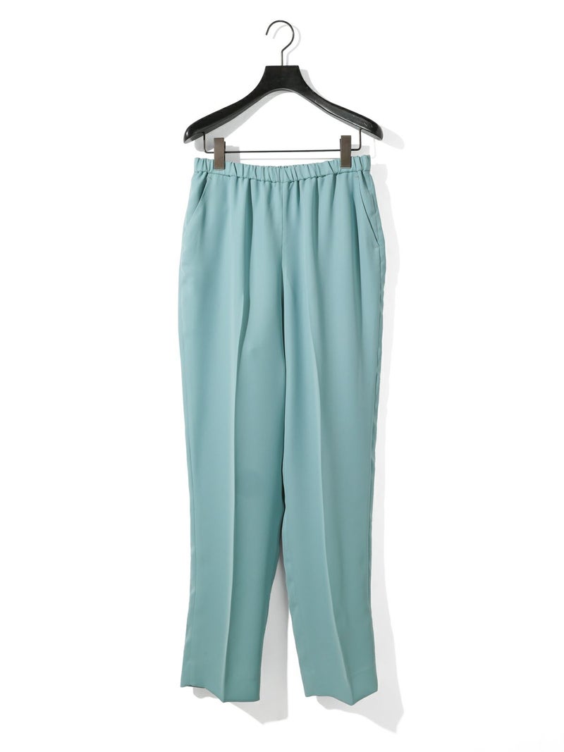 身長152cmで裾が約10cmほど余る丈感。裾カーブ設計で踏むことなく靴の上にくしゅっとたるませて穿くこともできますが、やや丈を詰めるとよりバランスよく着用いただけます。身長160cmで、靴の上に軽く乗るくらいの丈感です。ウエストは総ゴム仕様で、とても楽な穿き心地。股上を深く取ることでリラックス感を持たせながらも、センタープレスがきちんと感を添えています。ラクさと上品さを兼ね備えた、デイリーに活躍する一本です。