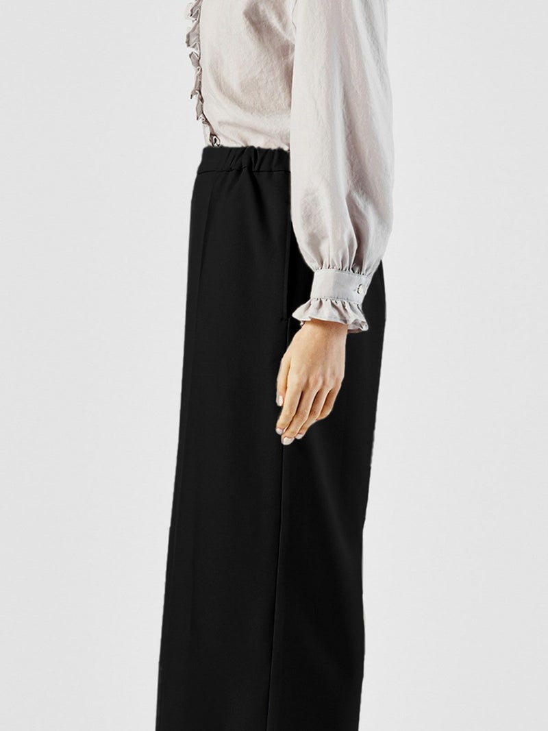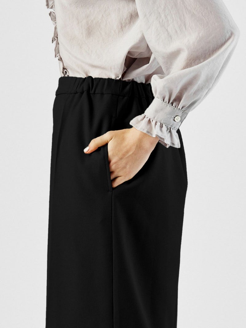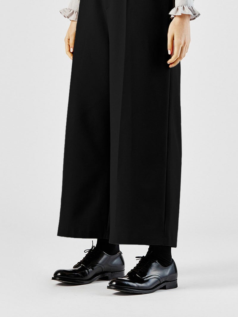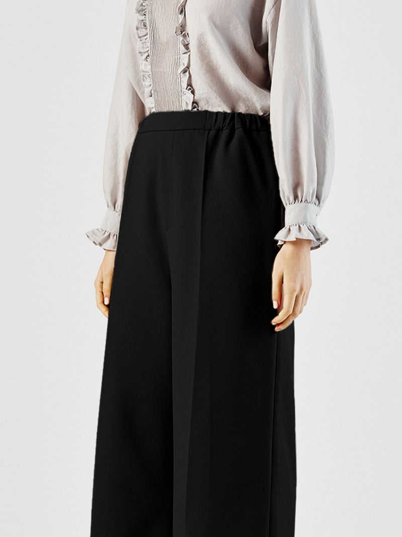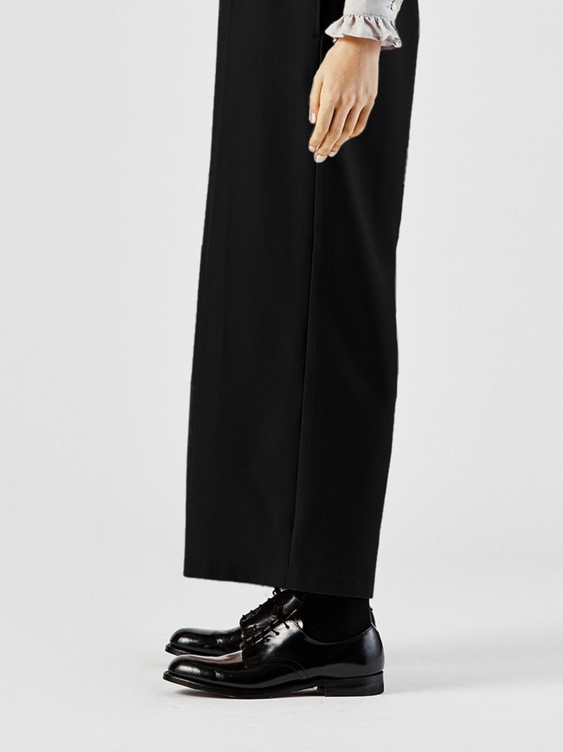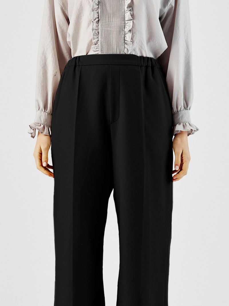 ハイウエストでの着こなしが可能なセンタープレスワイドパンツです。シワになりにくいウールタッチでお手入れがしやすい素材で仕上げました。ウールに比べて軽さがあり、ピリングしにくいのが特長。シャツインしやすいようフロント面はフラットなデザインですが、バックにかけゴム使用でとてもラクに穿いて頂けます。ワイド感が印象的で清楚に落ち付きのあるコーディネートにお勧めの1枚です。