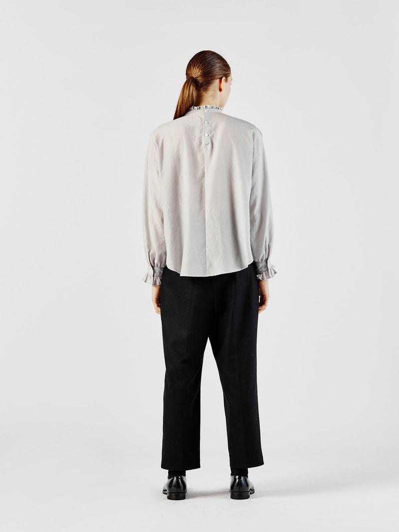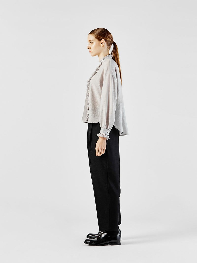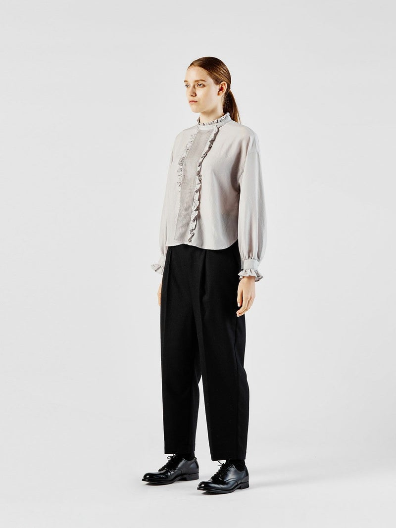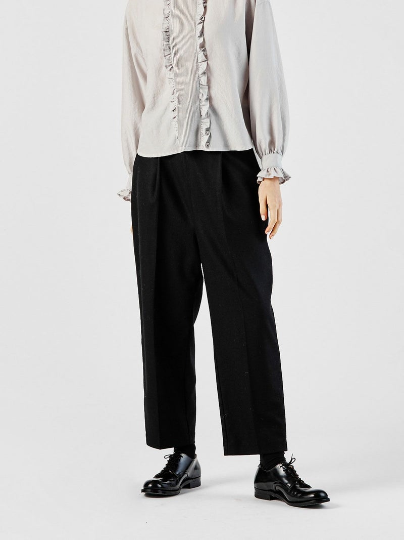 ウール混の無地と千鳥柄(4-163601A)の2型で展開したハイウエストコクーンパンツです。ハイウエストでセンタープレスのきれい目なワイドパンツが大人のベーシックを表現します。シャツインもお勧めで広めにデザインしたウエスト幅はクラシックな雰囲気でベルト使いもできる清楚な着こなしを演出。千鳥柄はシックなカラー展開でトラッド感のある着こなしにもお勧め。裏地付。冬の定番柄なので長く愛用できるパンツです。