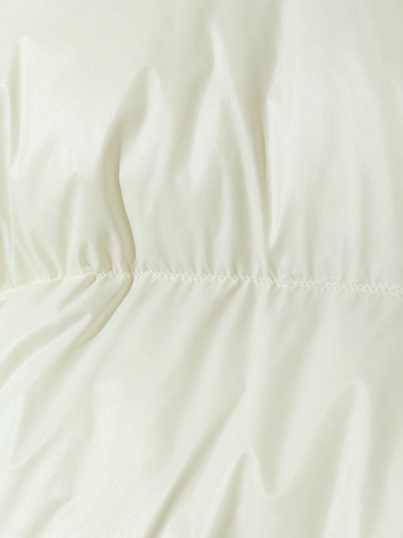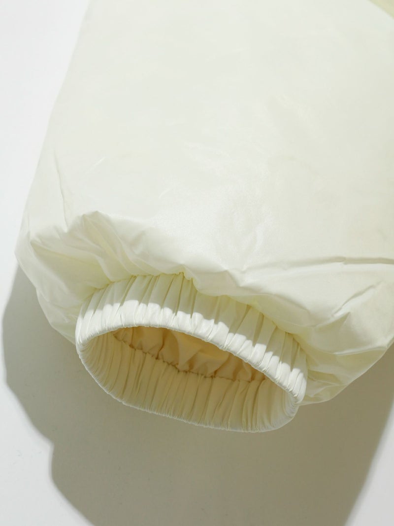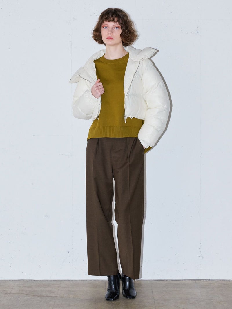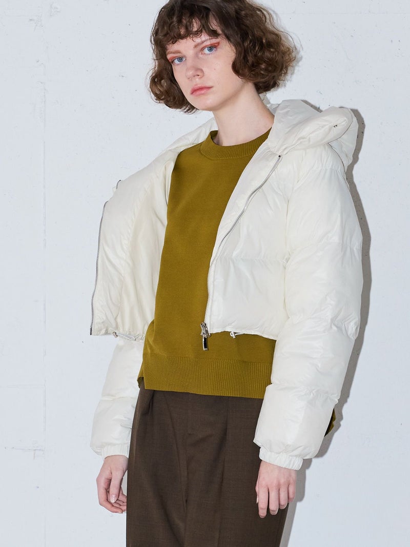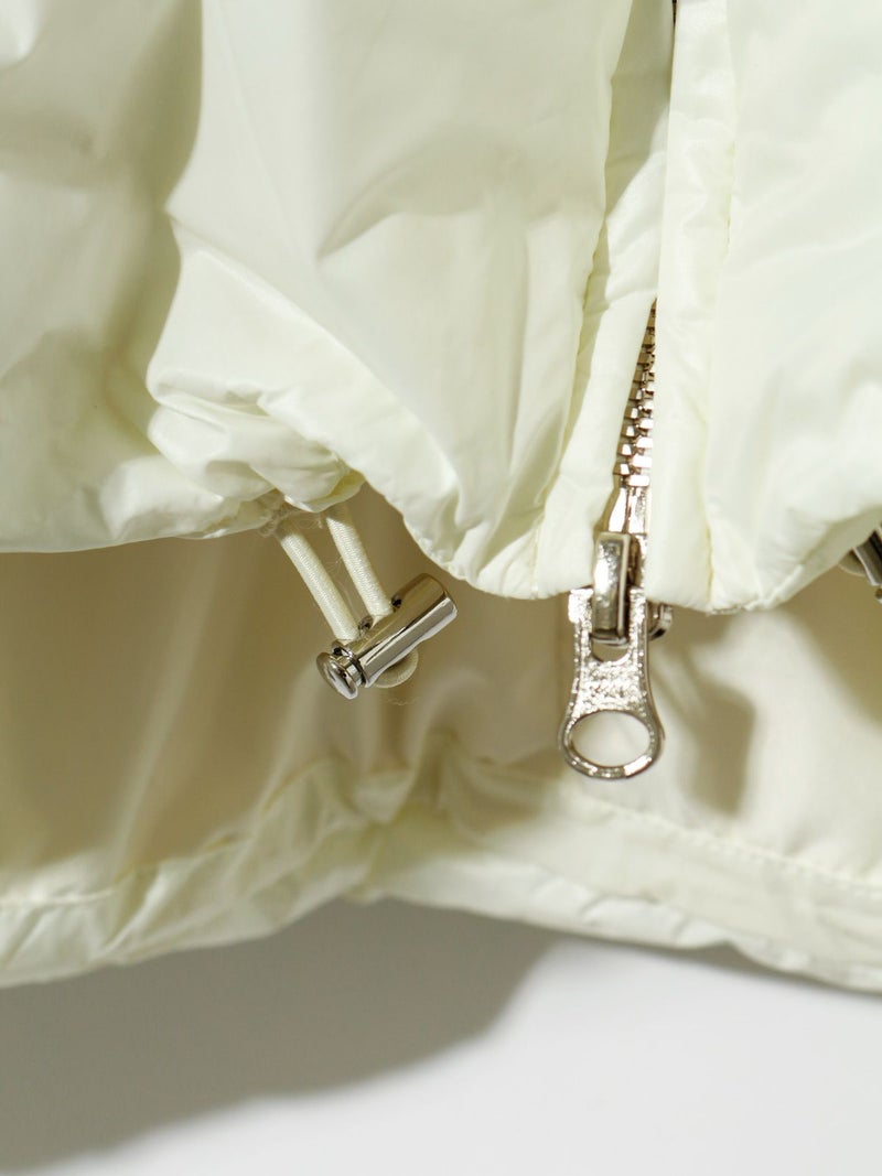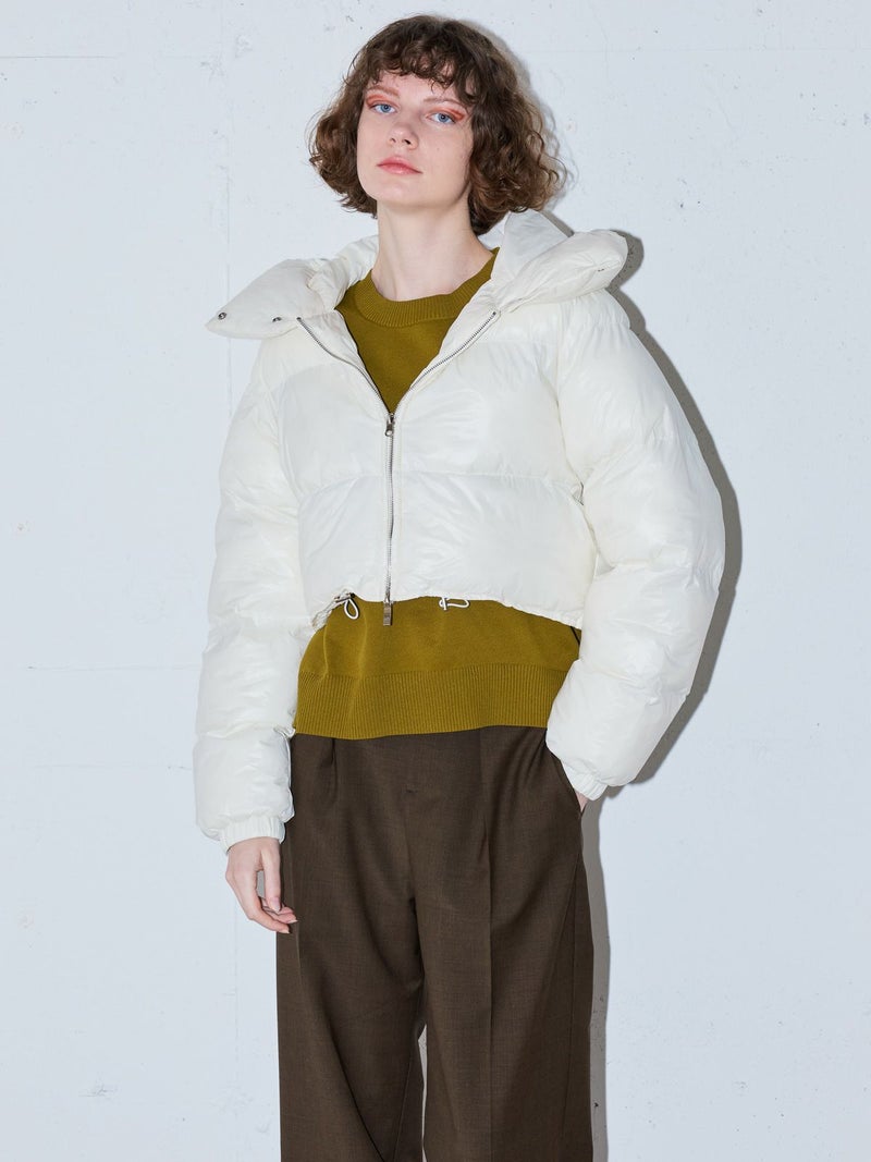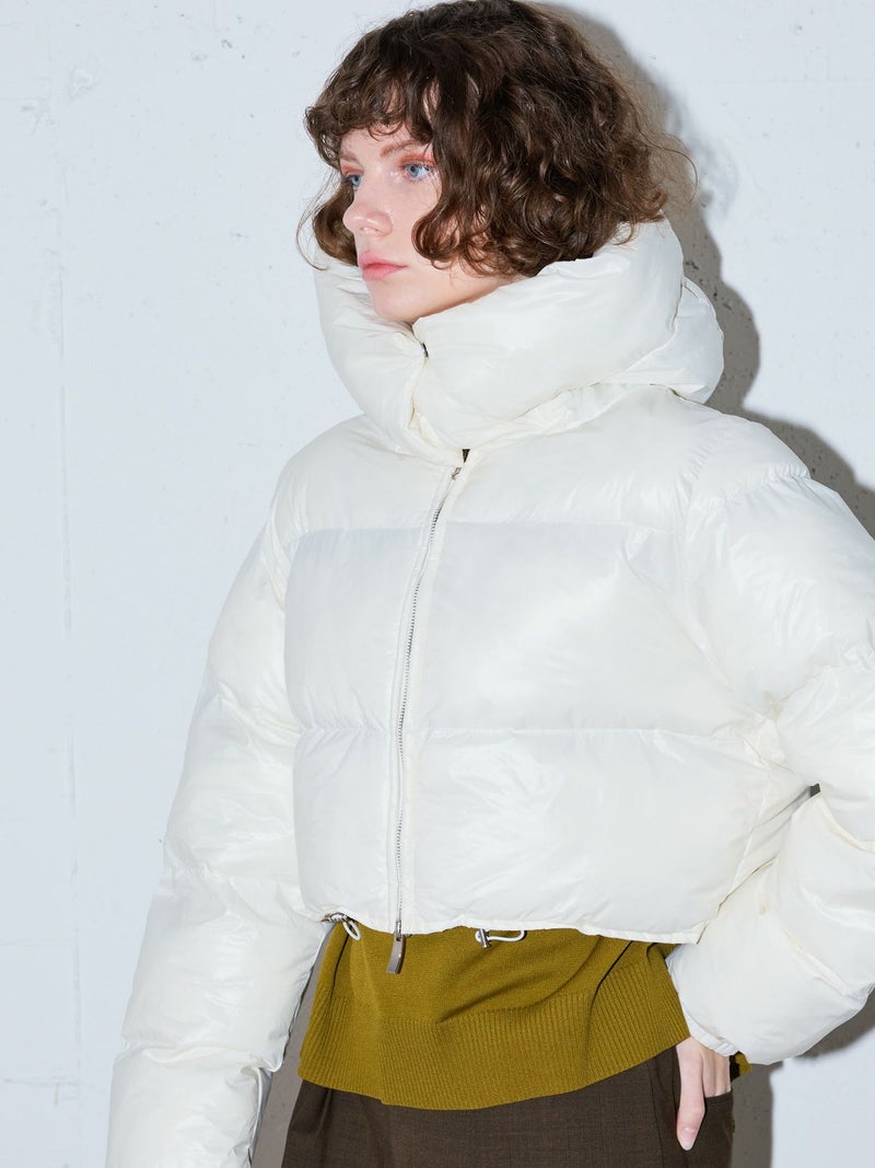 MIDIUMISOLIDの冬のオススメアウターが入荷しました。フーデッドパディングブルゾンです。粒状の綿を詰め込むことで、ダウンのようなボリューム感と軽さを兼ね備えた中綿を使用。ショート丈のコンパクトなサイズ感と程よくボリューム感のあるデザインが特長。小柄な方にもスッキリと着ていただけるサイズ感となっています。首をしっかりと包んでくれるハイネックと袖口のゴムは風通し防止になり暖かさを保ってくれます。上下稼働式のフロントジップ使用。裾はドロスト付き、表面はナイロン生地で光沢感のあるカジュアルなブルゾンを演出。薄着でも大変暖かな1枚です。