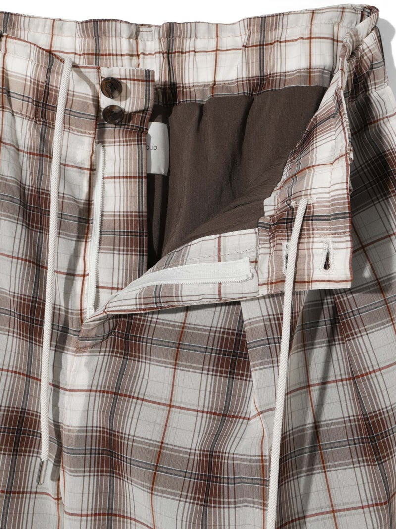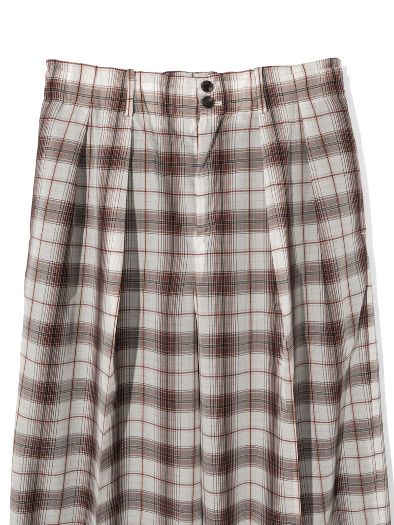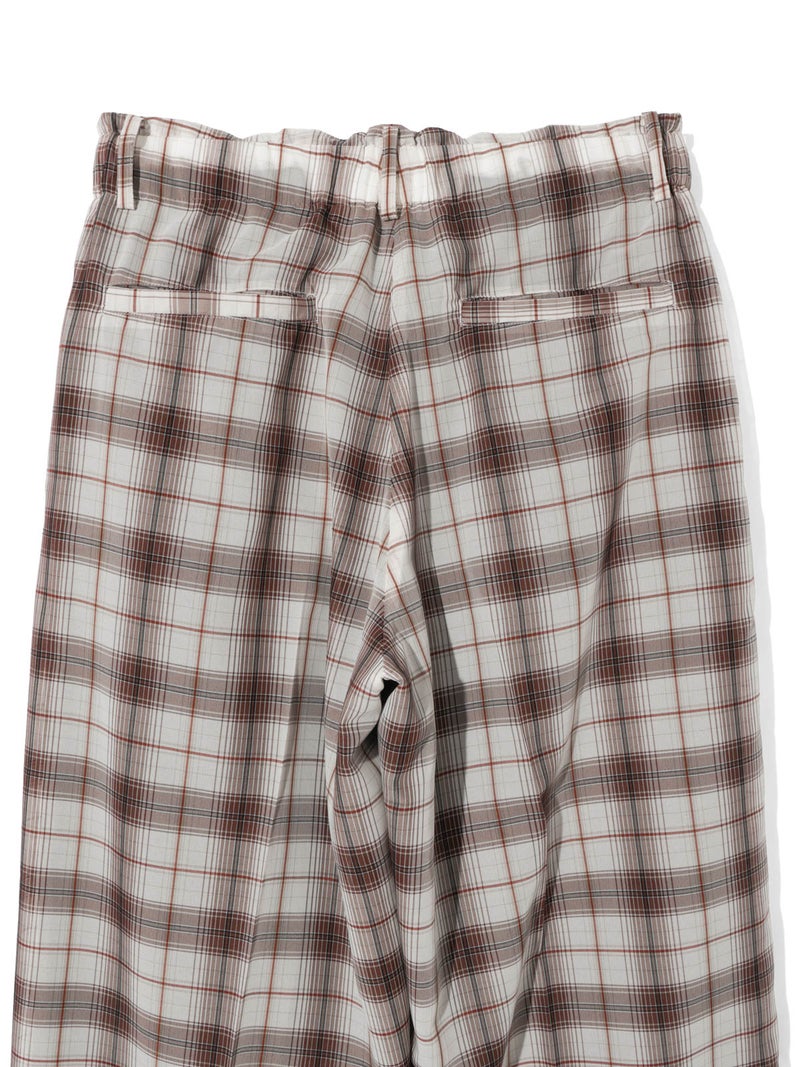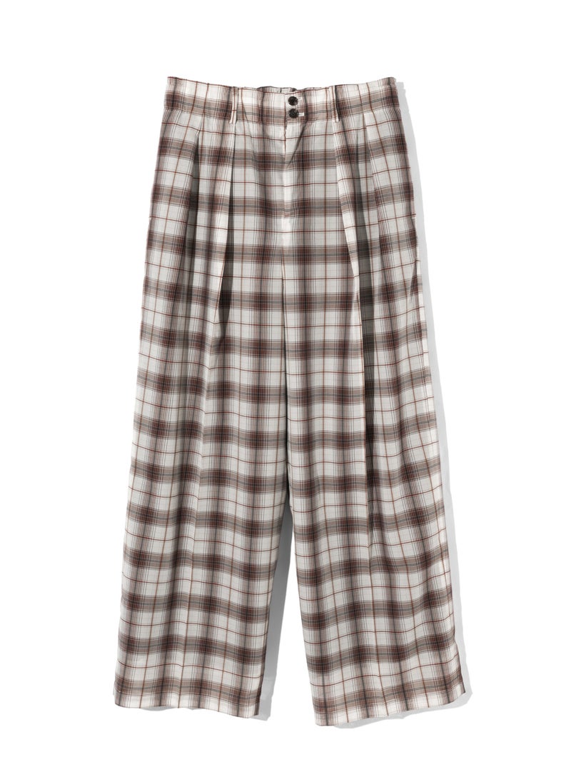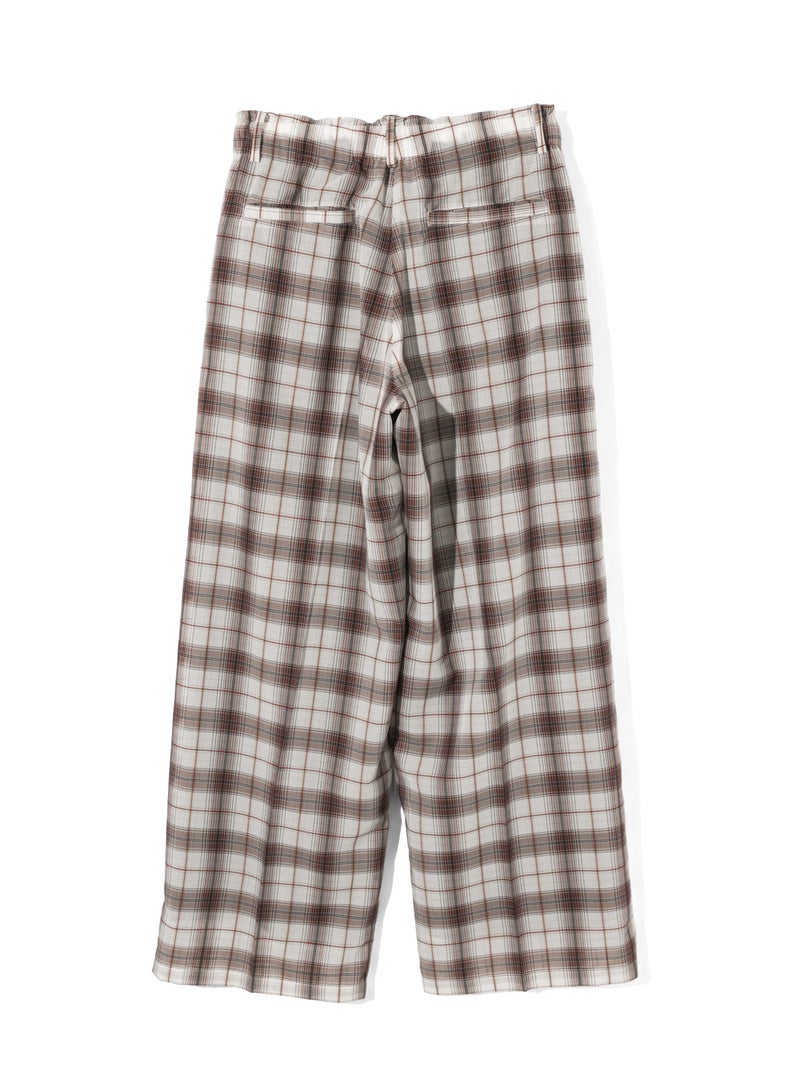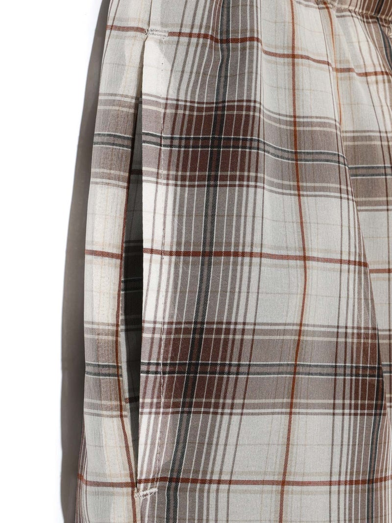 サラッとした冷感シアーチェック素材で仕上げたシアーチェックテーパードパンツです。24AWで展開したものと同型のデザインパンツで、MIDIUMISOLIDらしい優しい落ち感とボリュームのあるシルエットを表現した1枚。インタックが入った動きのあるデザインが特徴。ウエストはフロントボタンを二つ使用しており、中紐の付いたウエスト調整可能のデザインで、更にしっかりとウエストキープもできるベルト使いも楽しめるデザインに仕上げています。シアーチェック生地は透け感がありますが、総裏地が付いているので透け感は気にすることなく着用していただけます。軽くて清涼感のあるパンツなので、暑い夏場も快適に着こなすことができます。落ち着きのあるチェック柄なので大人のカジュアルにお勧めです。同シリーズ1-131027/シアーチェックコーチジャケットも展開。