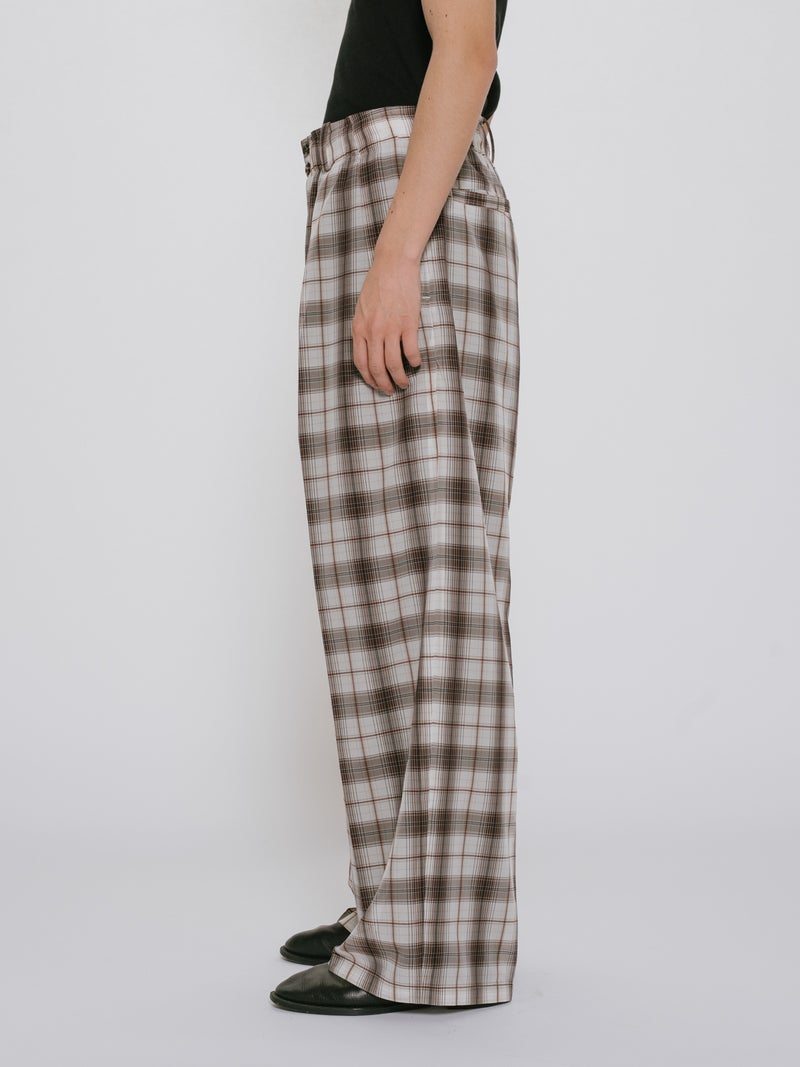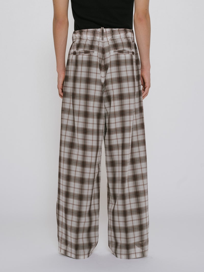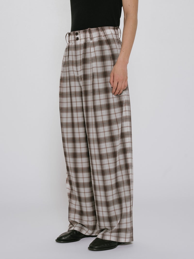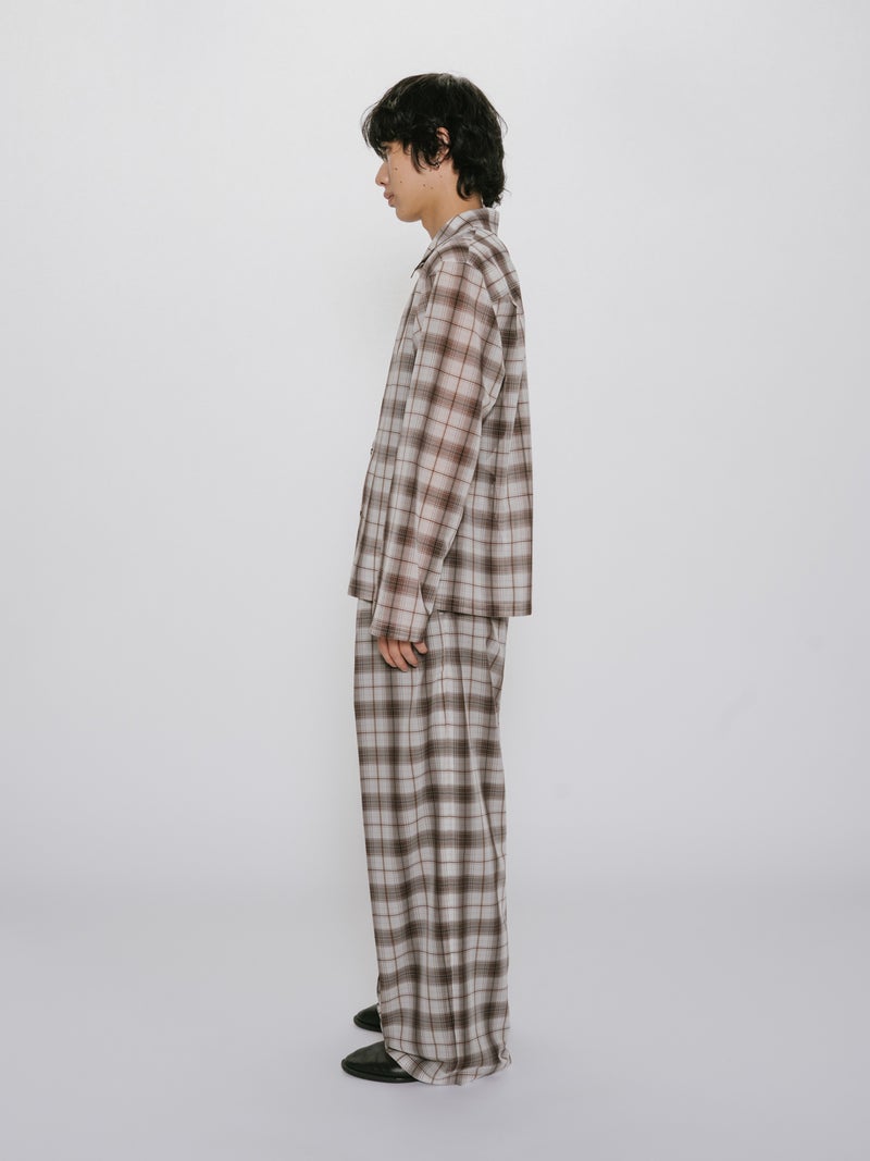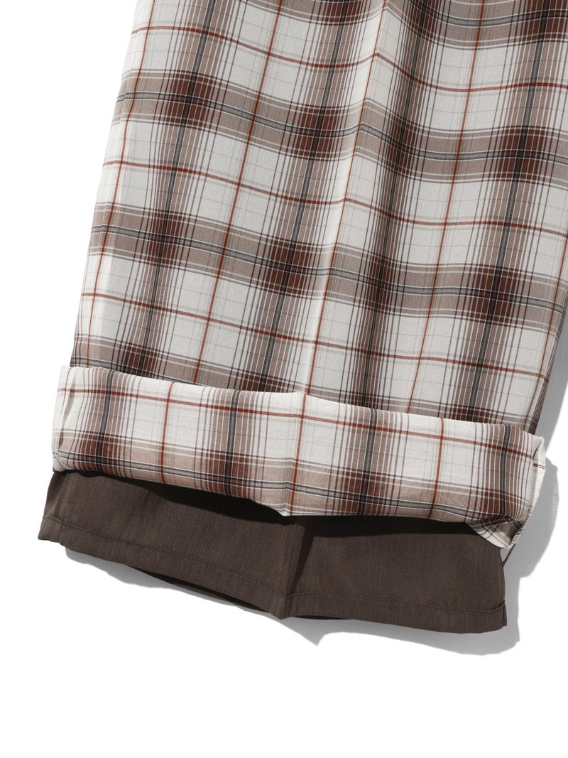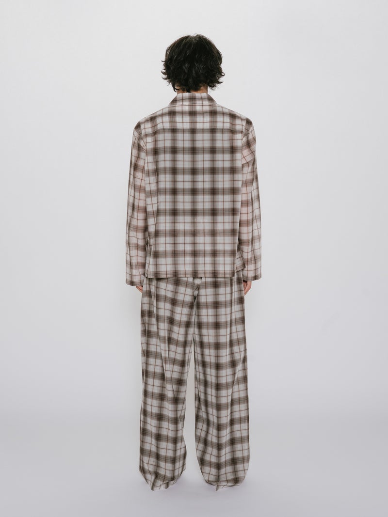 サラッとした冷感シアーチェック素材で仕上げたシアーチェックテーパードパンツです。24AWで展開したものと同型のデザインパンツで、MIDIUMISOLIDらしい優しい落ち感とボリュームのあるシルエットを表現した1枚。インタックが入った動きのあるデザインが特徴。ウエストはフロントボタンを二つ使用しており、中紐の付いたウエスト調整可能のデザインで、更にしっかりとウエストキープもできるベルト使いも楽しめるデザインに仕上げています。シアーチェック生地は透け感がありますが、総裏地が付いているので透け感は気にすることなく着用していただけます。軽くて清涼感のあるパンツなので、暑い夏場も快適に着こなすことができます。落ち着きのあるチェック柄なので大人のカジュアルにお勧めです。同シリーズ1-131027/シアーチェックコーチジャケットも展開。