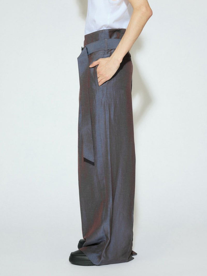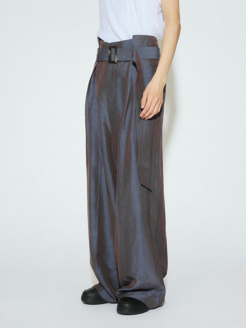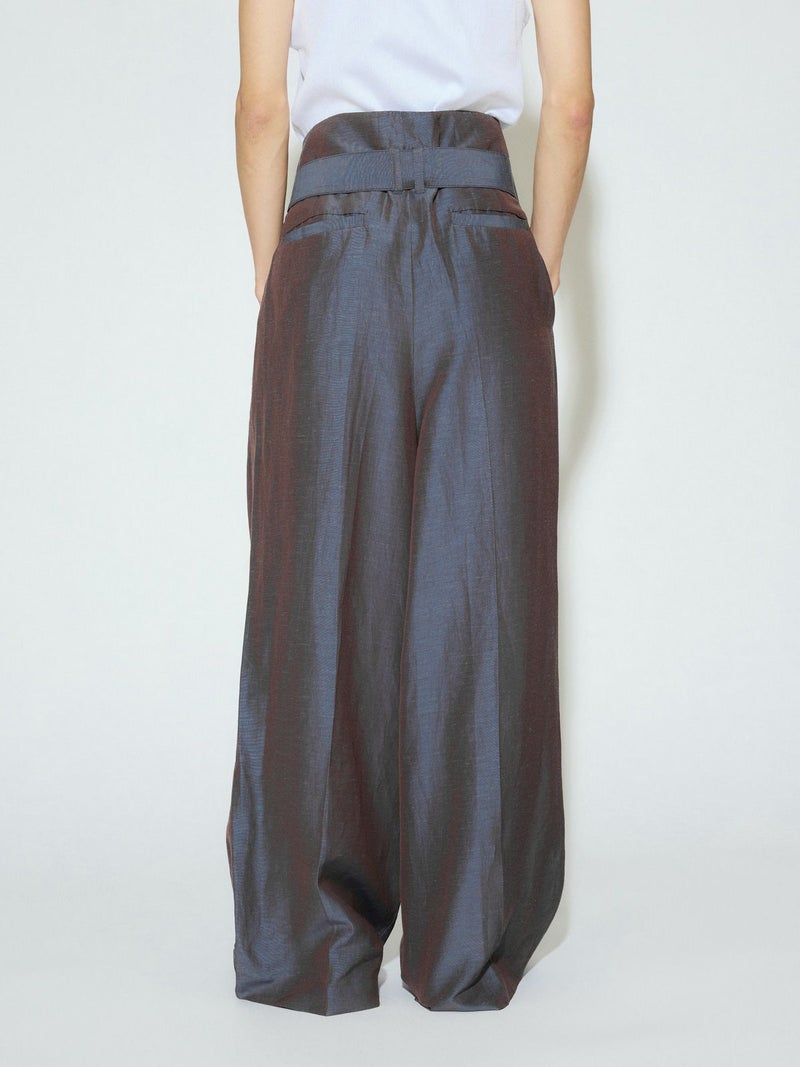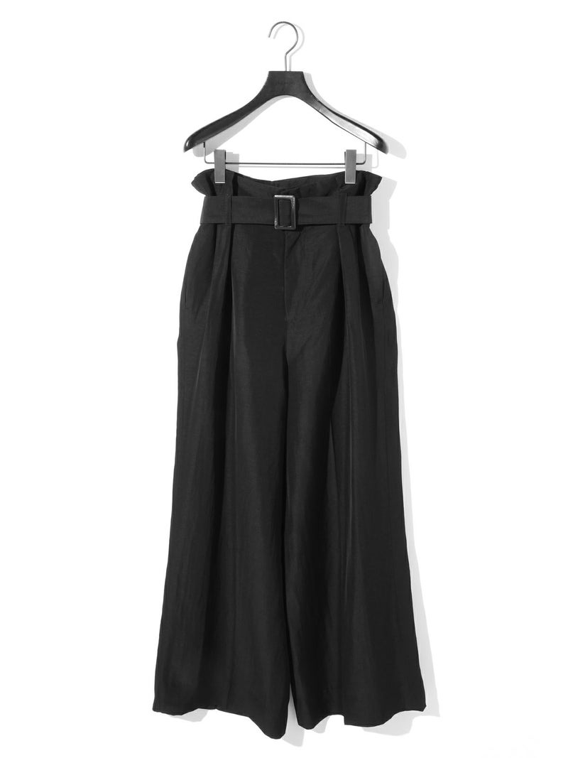 リネン×リサイクルポリエステル混でデザインしたベルト付きワイドスラックスです。ナチュラル感を出しつつ玉虫カラーのインパクトのあるデザインを表現しました。ハイウエストベルトのインタックがポイント。ベルトで絞って袴のような独特なシルエットが特徴。体型を問わず着用していただける1枚です。2-170007/テーラードロングジャケット、2-160021/ワイドショートスラックスとセットアップ対応可能。