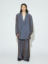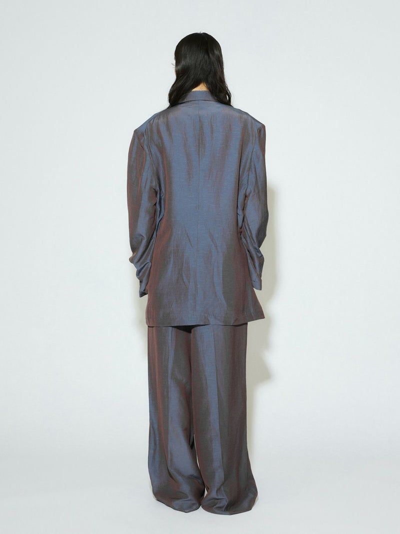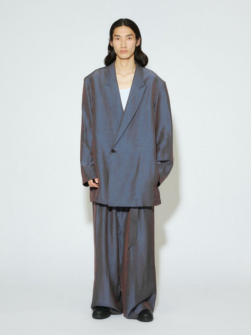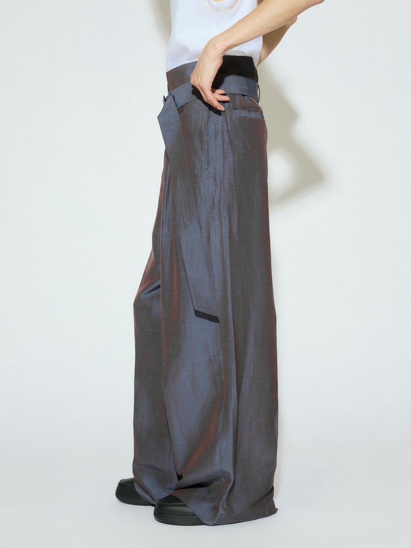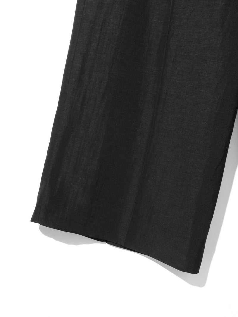 リネン×リサイクルポリエステル混でデザインしたベルト付きワイドスラックスです。ナチュラル感を出しつつ玉虫カラーのインパクトのあるデザインを表現しました。ハイウエストベルトのインタックがポイント。ベルトで絞って袴のような独特なシルエットが特徴。体型を問わず着用していただける1枚です。2-170007/テーラードロングジャケット、2-160021/ワイドショートスラックスとセットアップ対応可能。