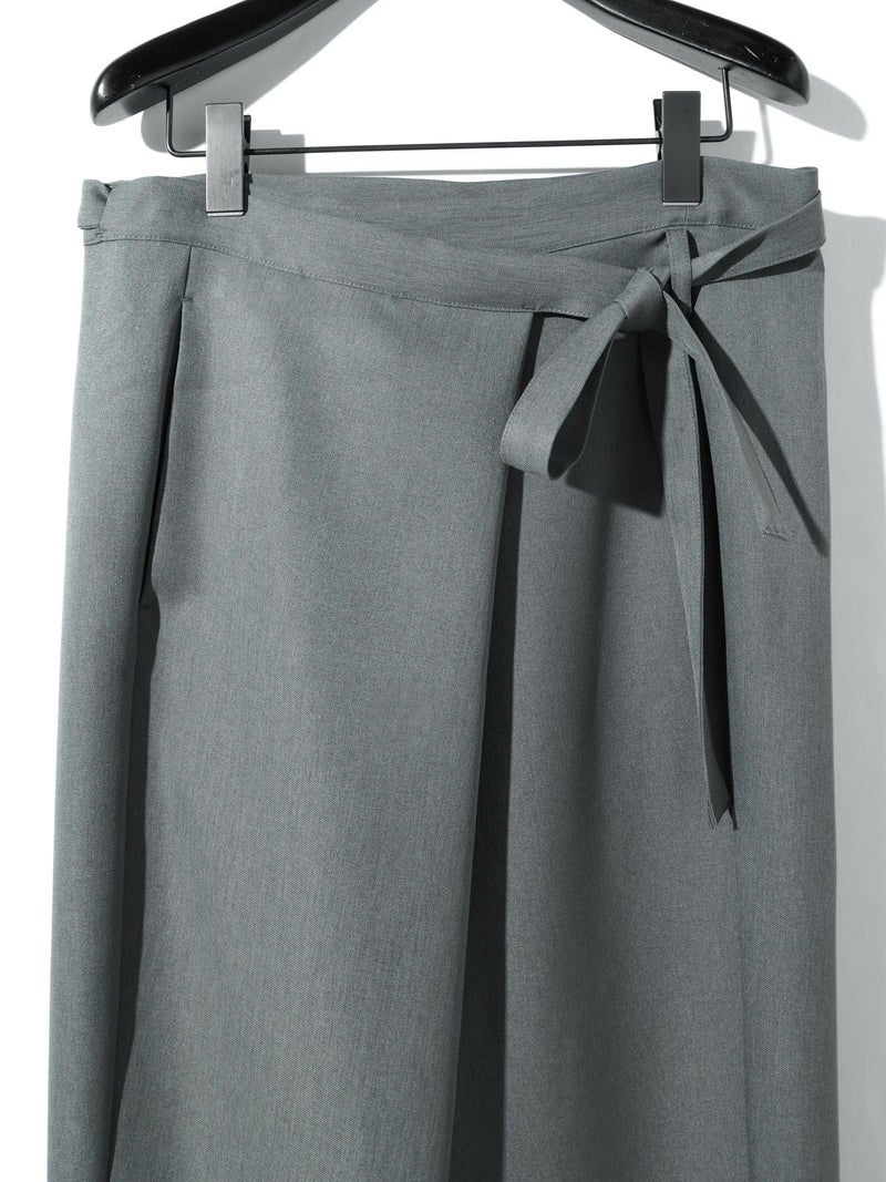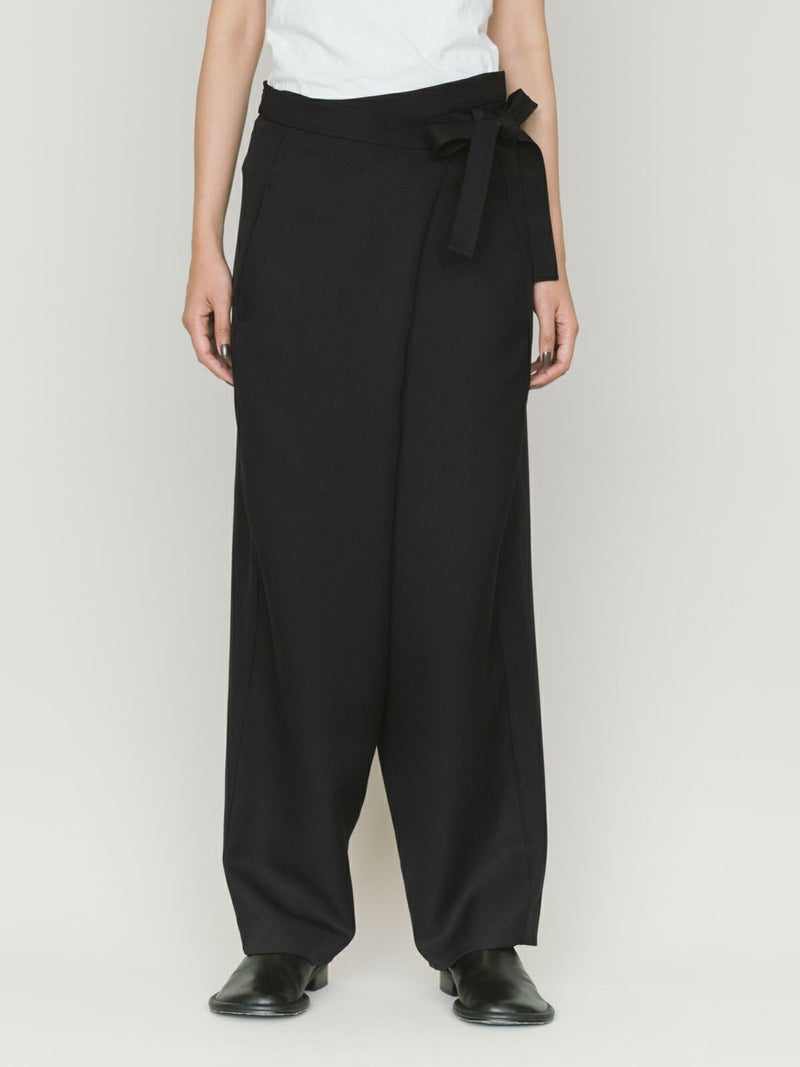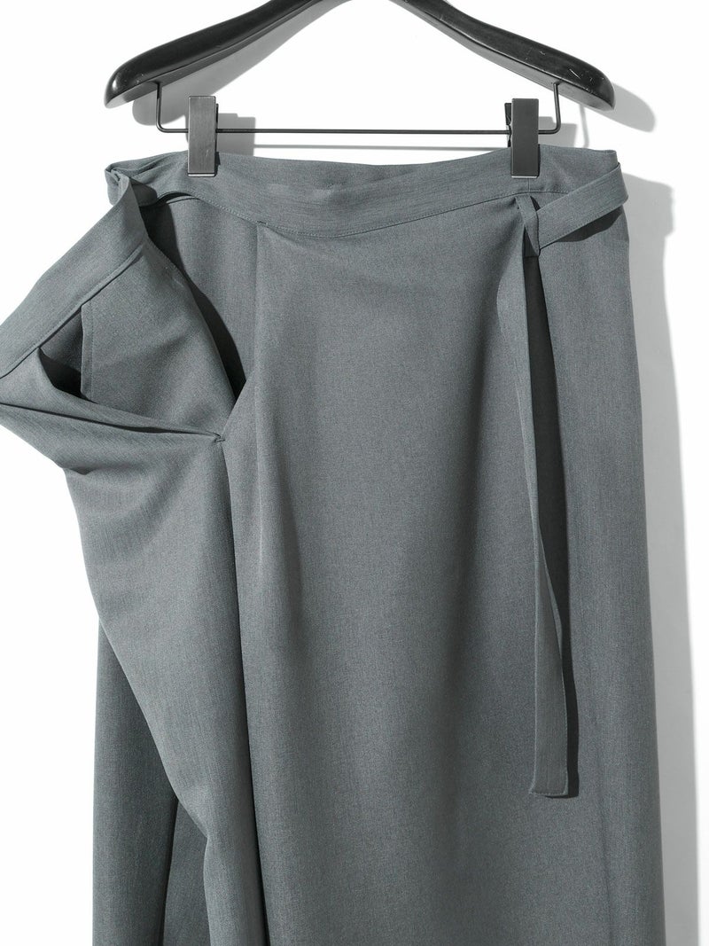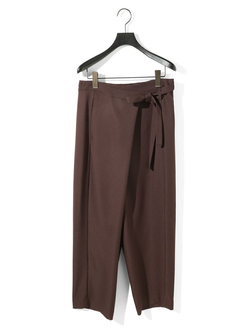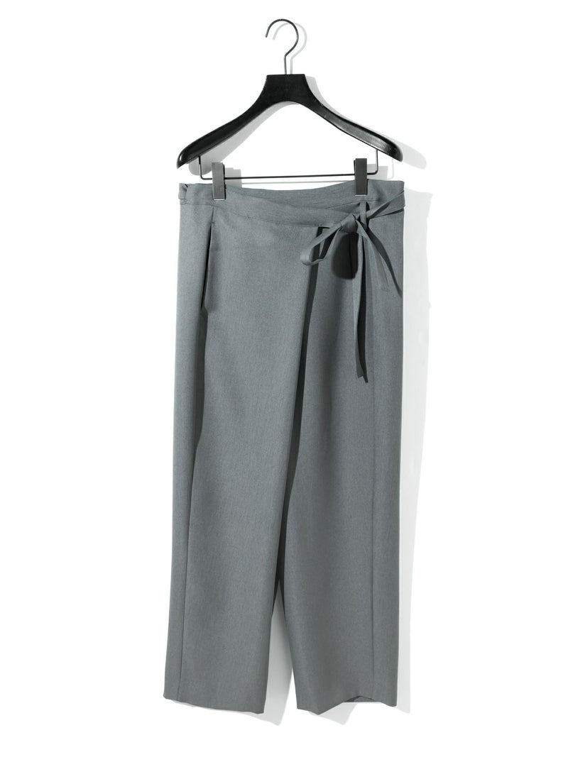 ワイドなウエストとドレープのきいたシルエットを表現したドレープラップパンツです。左サイドをベルトで絞ってウエストキープできる特徴的なデザインパンツ。サイズは自由自在。ユニセックスで着用可能。ボリューム感がありますが落ち感があるのですっきりとしたシルエット見えしてくれます。右側のみポケットが付いています。防シワ加工を施し日常使いしやすい生地を使用。印象的な着こなしを演出してくれるボトムアイテムです。4-135234/ドローストリングシャツとセットアップもおすすめです。