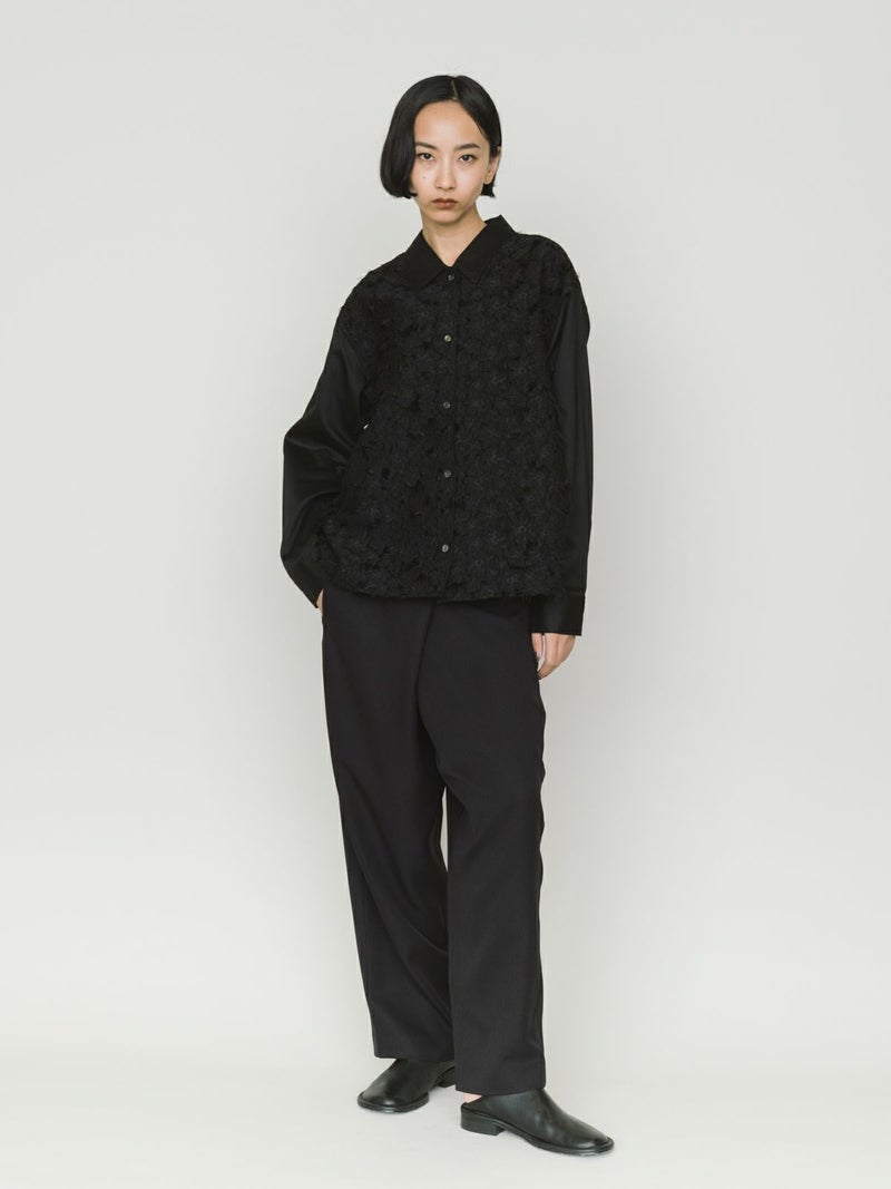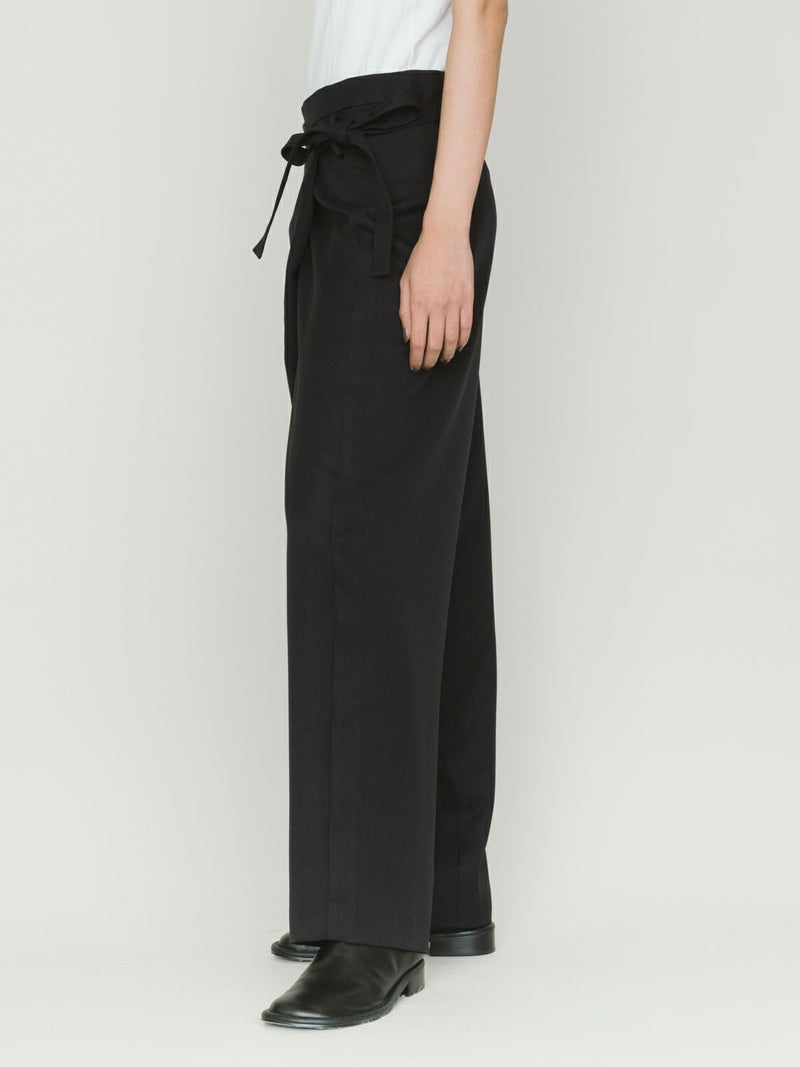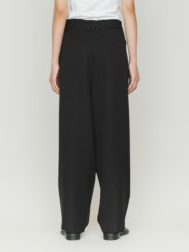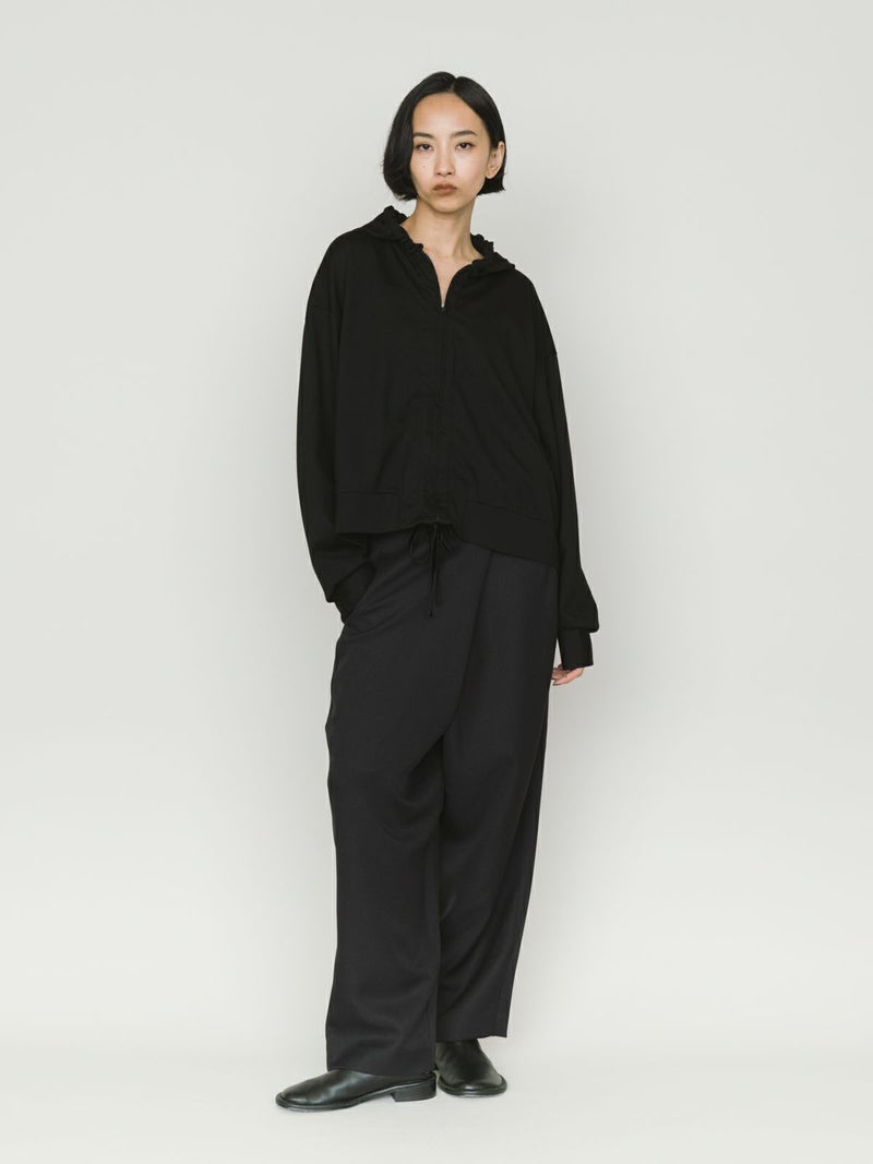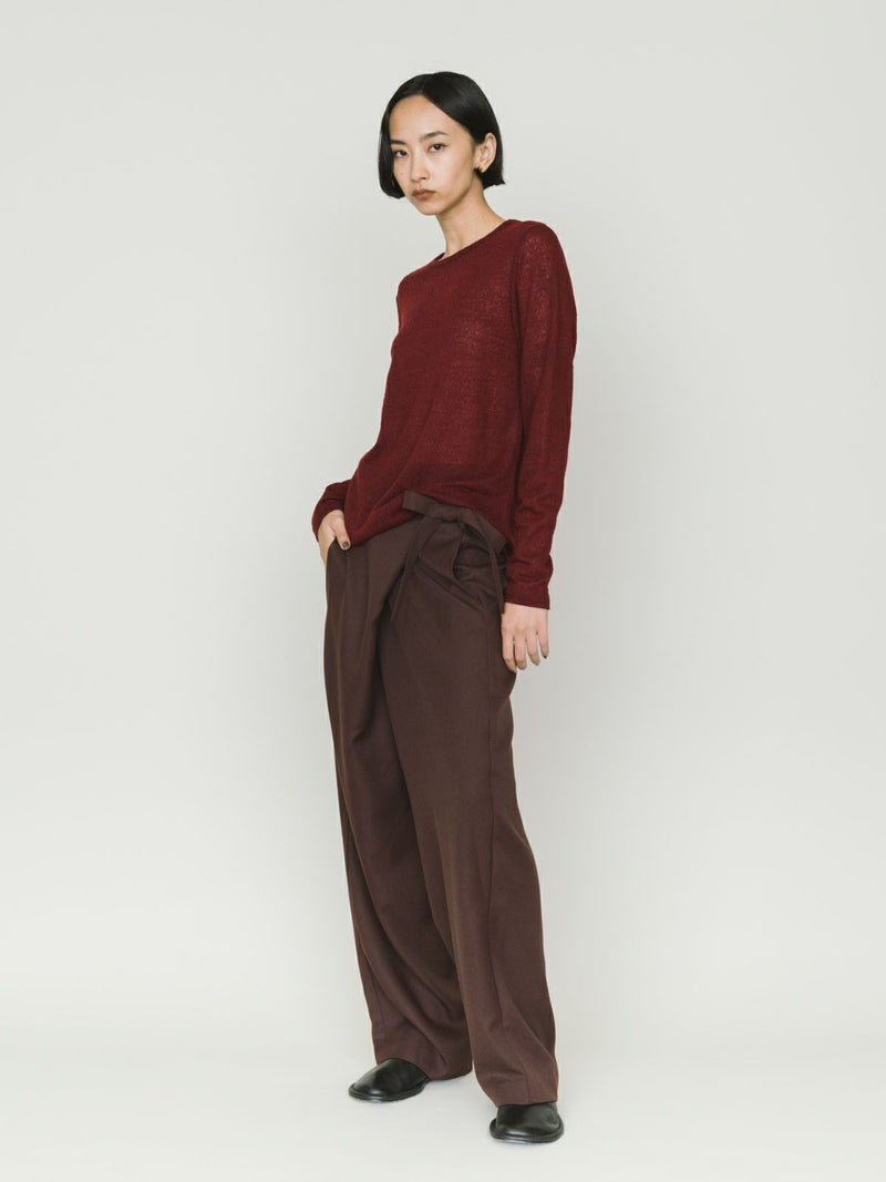 ワイドなウエストとドレープのきいたシルエットを表現したドレープラップパンツです。左サイドをベルトで絞ってウエストキープできる特徴的なデザインパンツ。サイズは自由自在。ユニセックスで着用可能。ボリューム感がありますが落ち感があるのですっきりとしたシルエット見えしてくれます。右側のみポケットが付いています。防シワ加工を施し日常使いしやすい生地を使用。印象的な着こなしを演出してくれるボトムアイテムです。4-135234/ドローストリングシャツとセットアップもおすすめです。