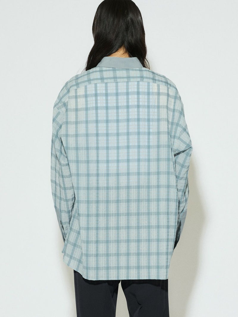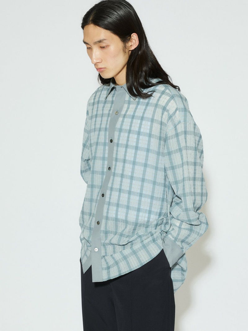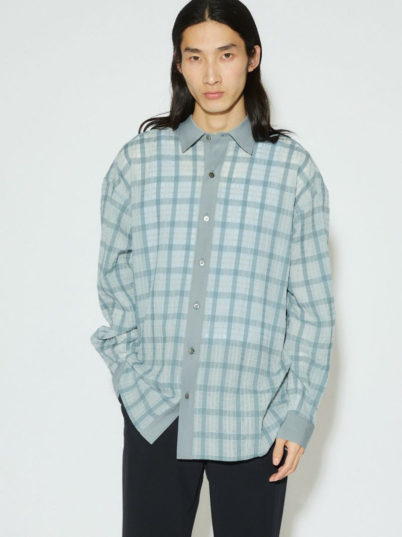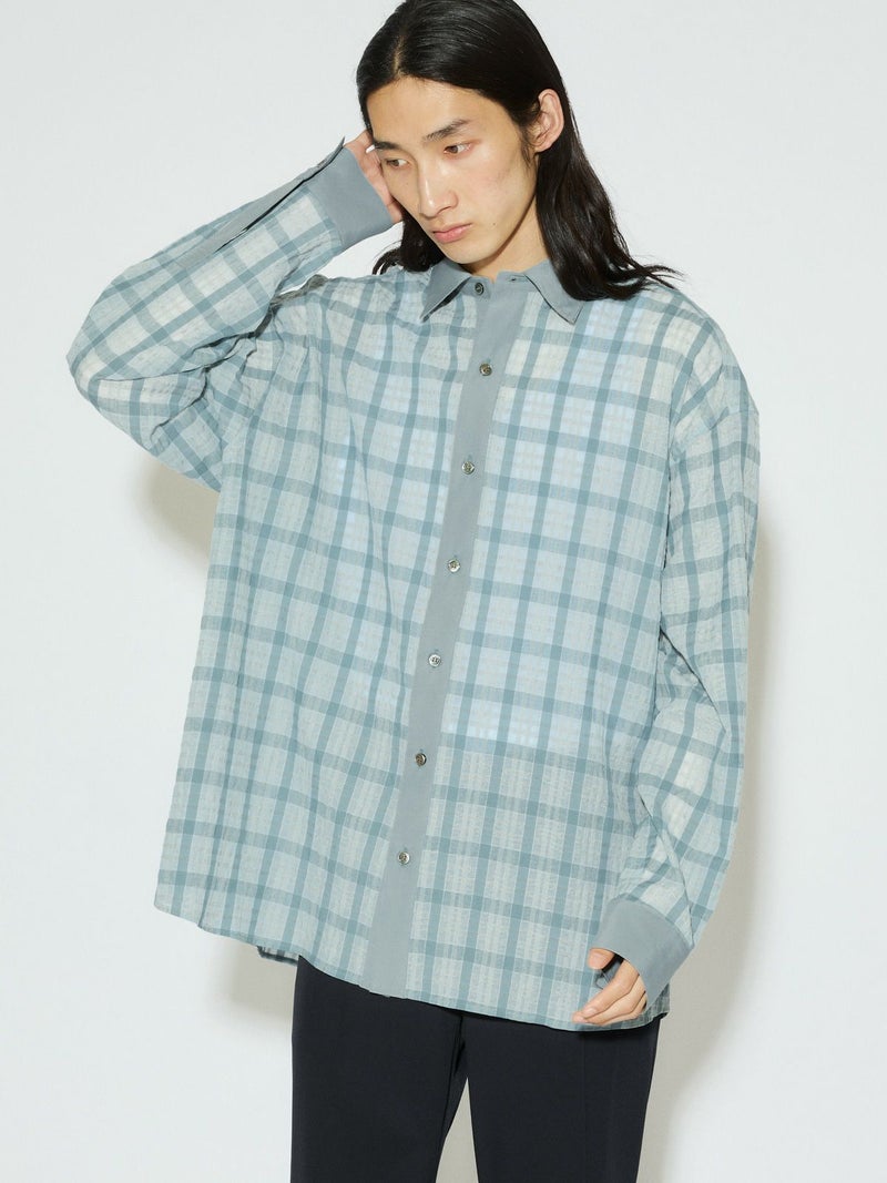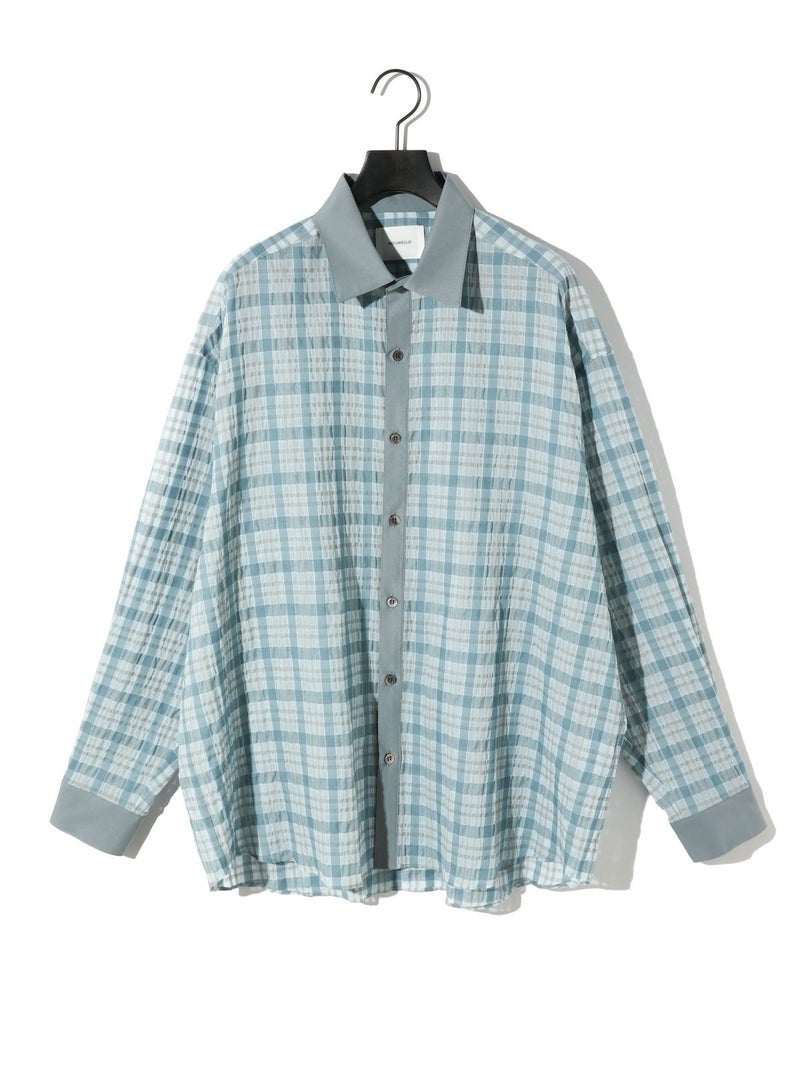 シアーサッカー調のチェック柄が印象的なシアーチェックシャツです。清涼感のある生地感と色合いがポイント。袖口・襟・前立てをブロード素材を使用。ゆったりとしたオーバーサイズでラフに着用していただける1枚です。羽織ってもOK。配色の異なる2色のカラー展開となっています。
