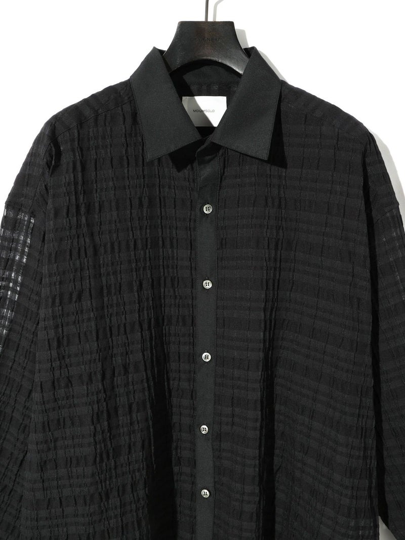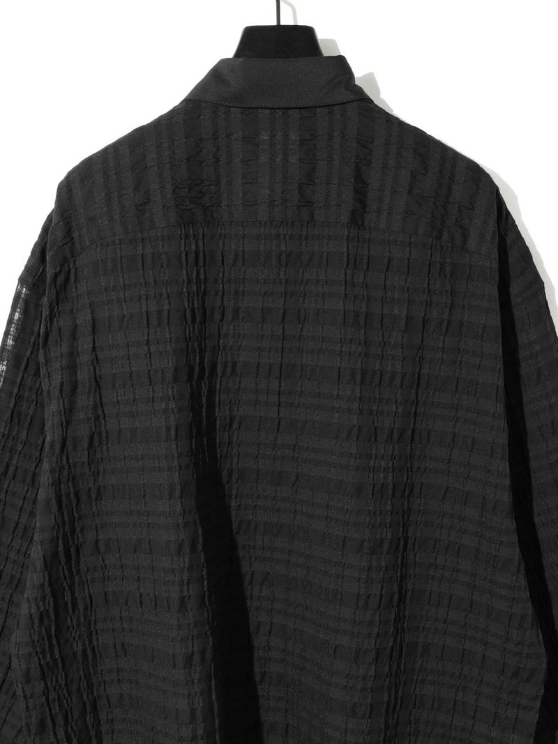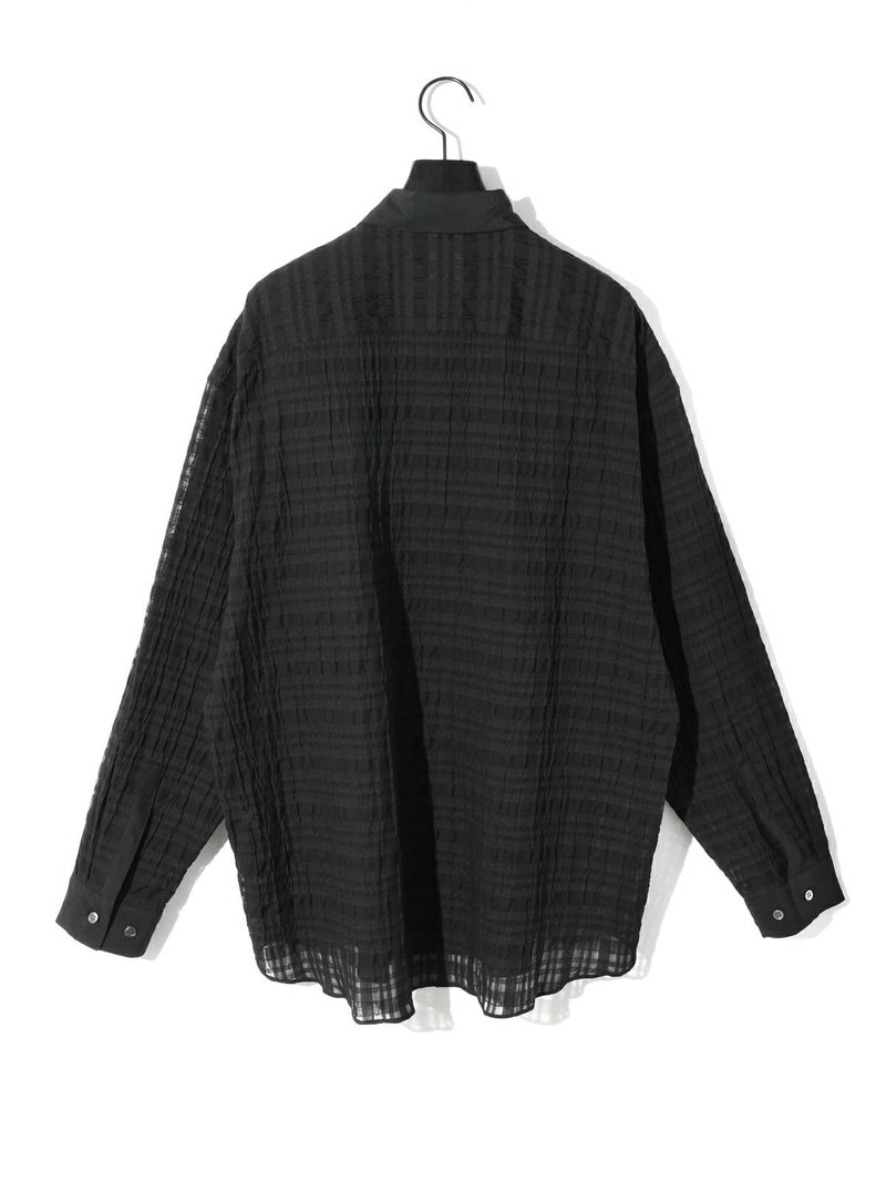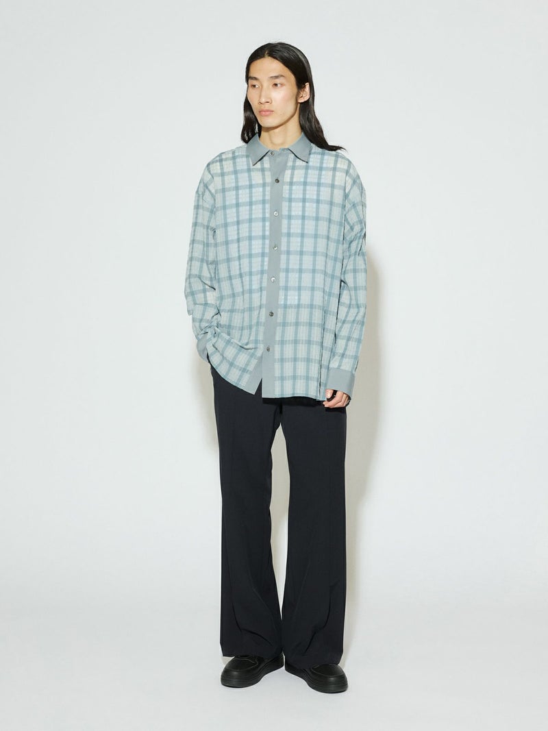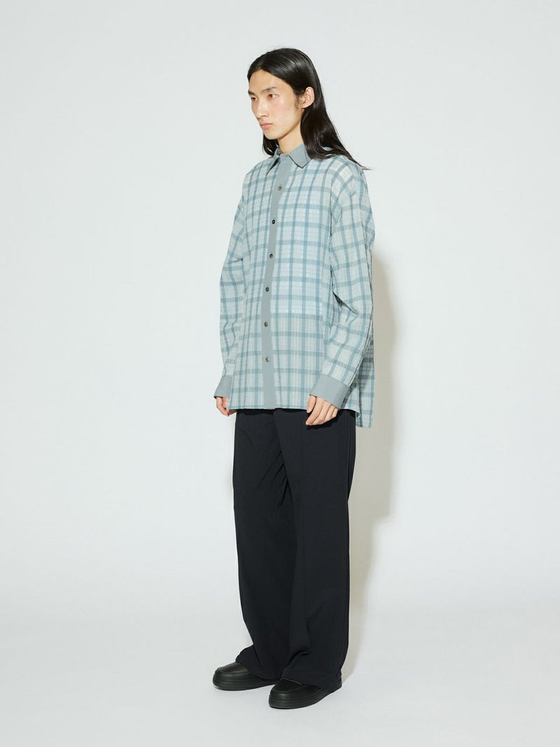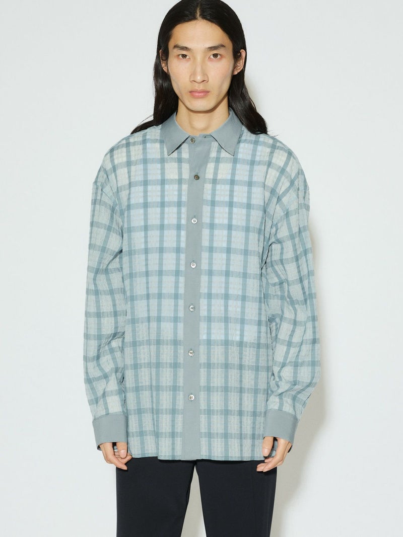 シアーサッカー調のチェック柄が印象的なシアーチェックシャツです。清涼感のある生地感と色合いがポイント。袖口・襟・前立てをブロード素材を使用。ゆったりとしたオーバーサイズでラフに着用していただける1枚です。羽織ってもOK。配色の異なる2色のカラー展開となっています。