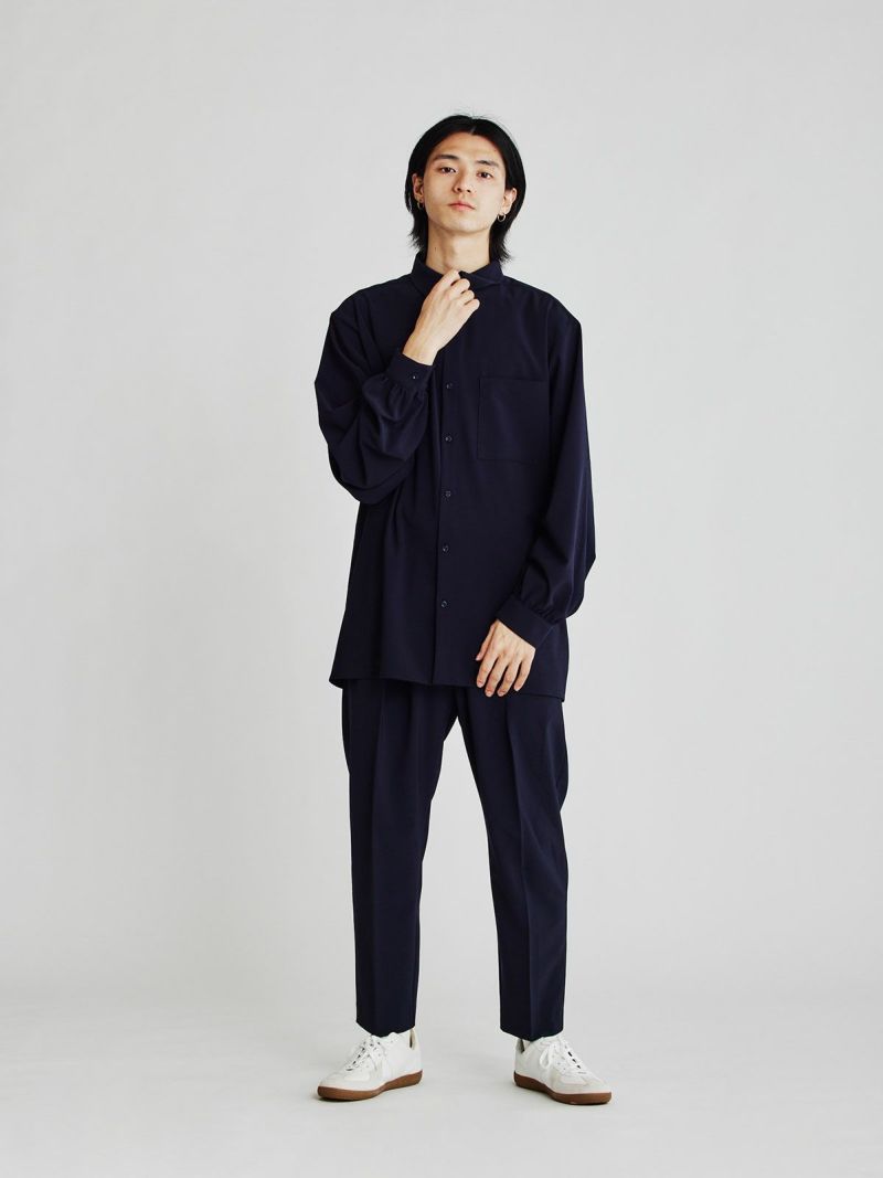 アームホールを広く取り、ボリュームのあるギャザースリーブが特長。テロンとした光沢感のある上品な素材です。