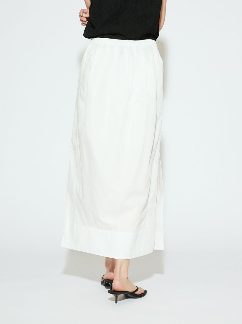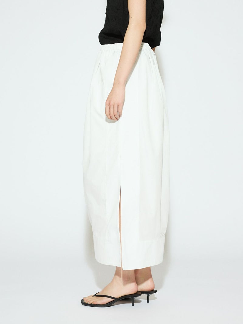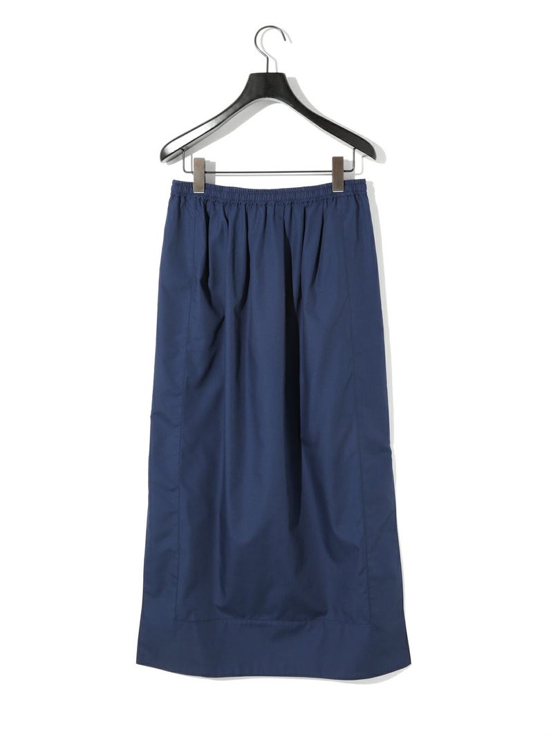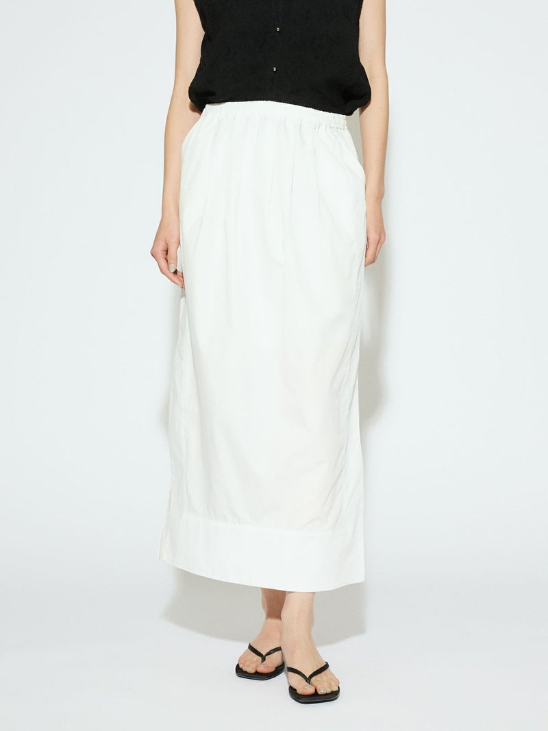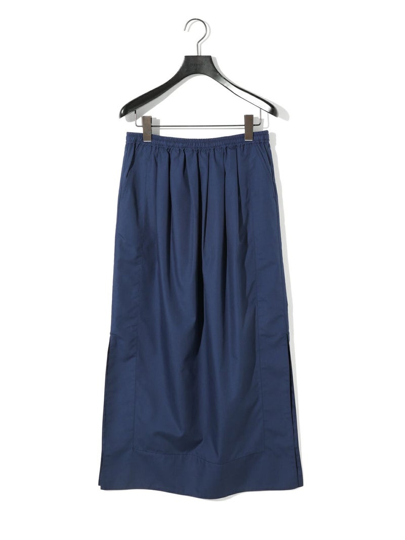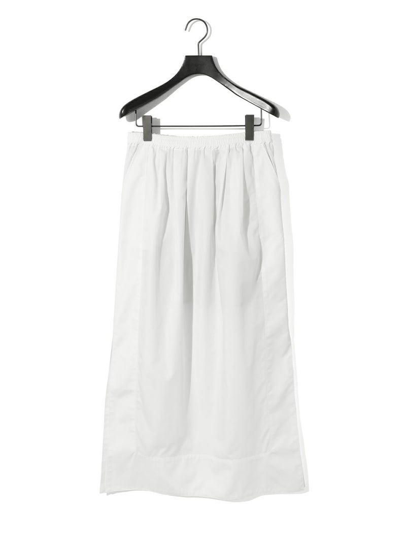 深めのサイドスリットがポイントのロングスカート。前後に入ったタックが、ほどよいゆとりと動きをプラス。ストレートなシルエットで、すっきりと大人っぽく着こなせます。ウエストの内側にはドローストリングコード付きで、サイズ調整可能。ハリのあるTCブロード素材を使用、シワになりにくくデイリー使いにもぴったりです。オフホワイトのみ短めのペチコートが付いています。