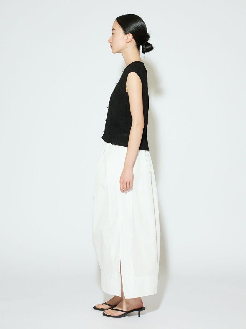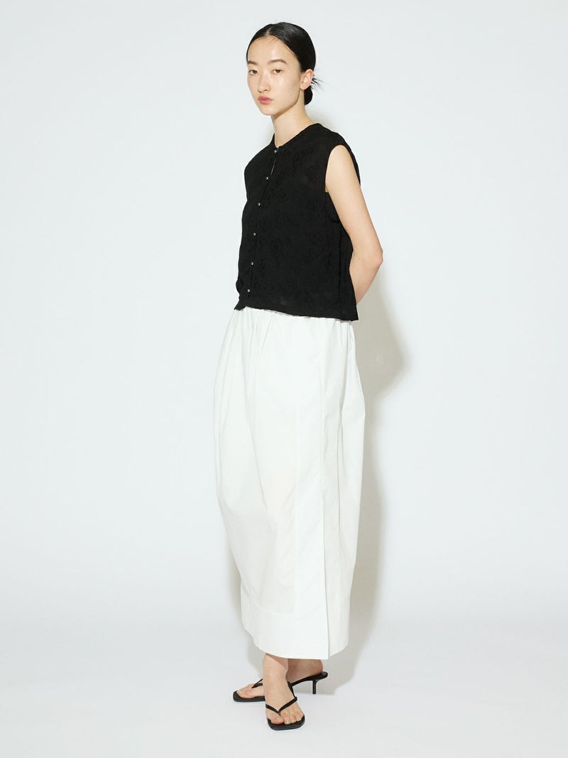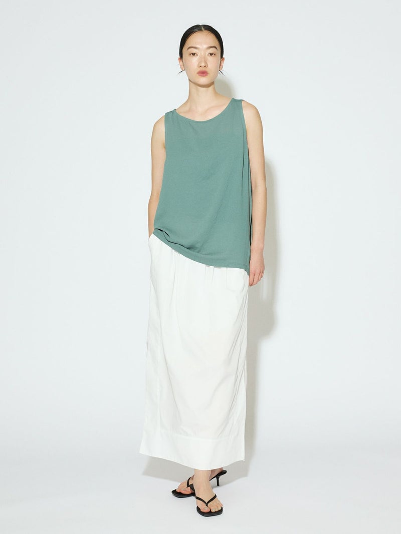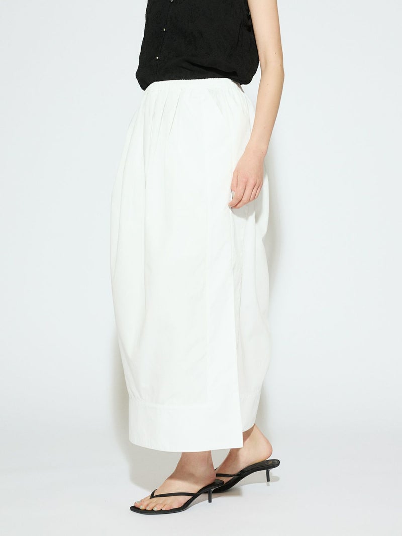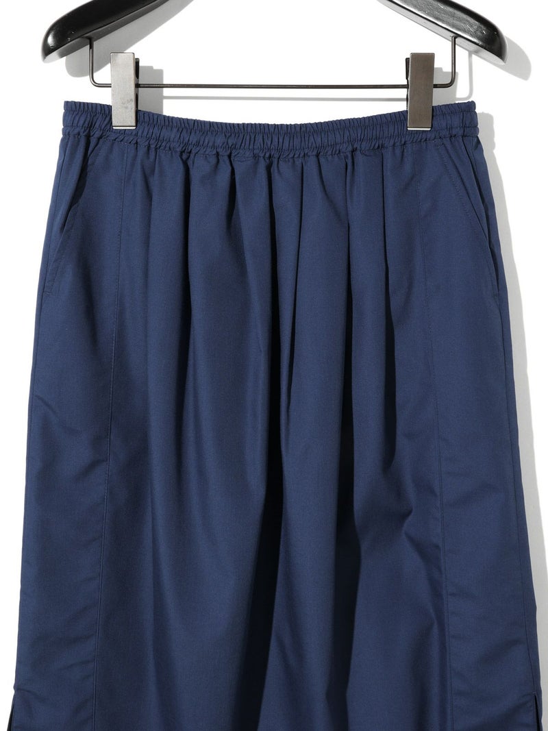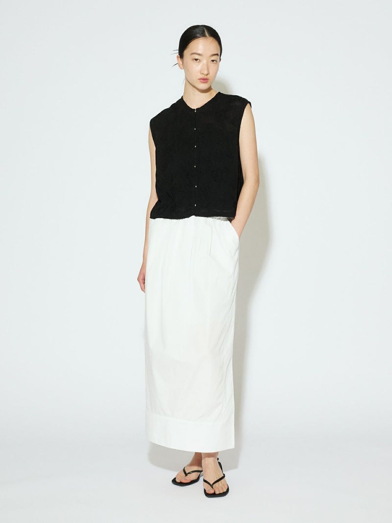 深めのサイドスリットがポイントのロングスカート。前後に入ったタックが、ほどよいゆとりと動きをプラス。ストレートなシルエットで、すっきりと大人っぽく着こなせます。ウエストの内側にはドローストリングコード付きで、サイズ調整可能。ハリのあるTCブロード素材を使用、シワになりにくくデイリー使いにもぴったりです。オフホワイトのみ短めのペチコートが付いています。