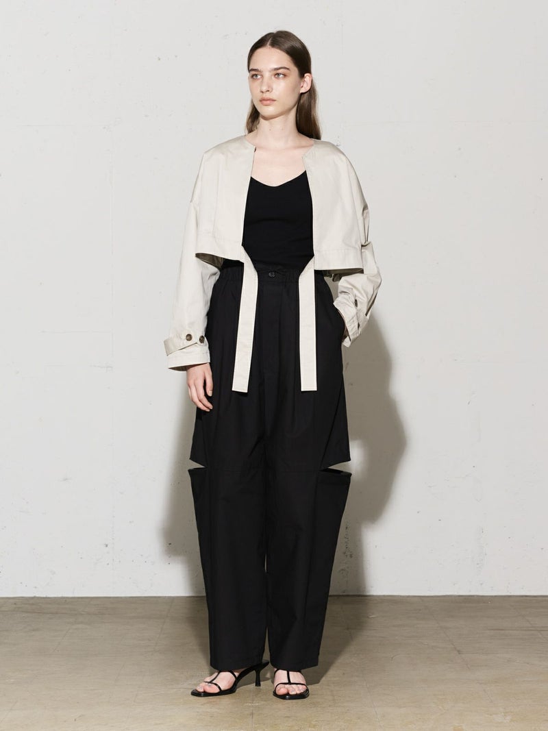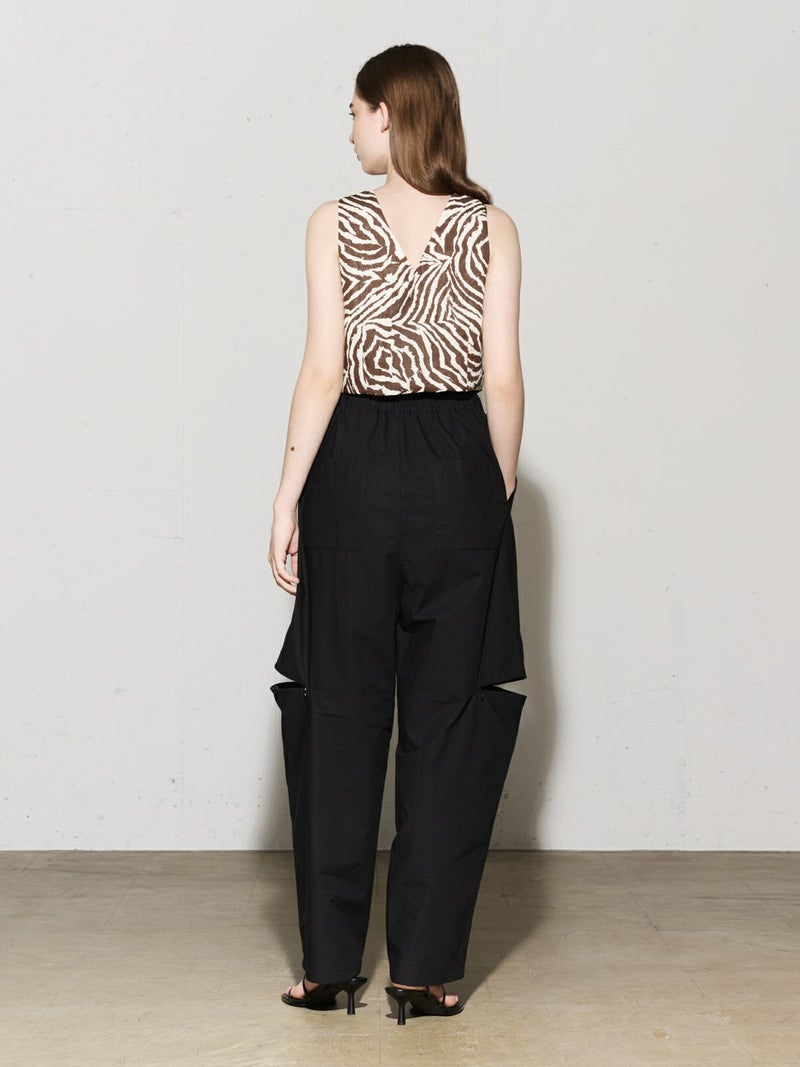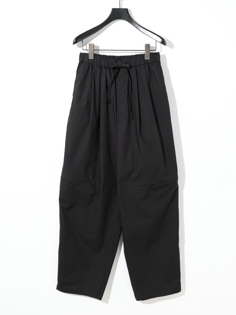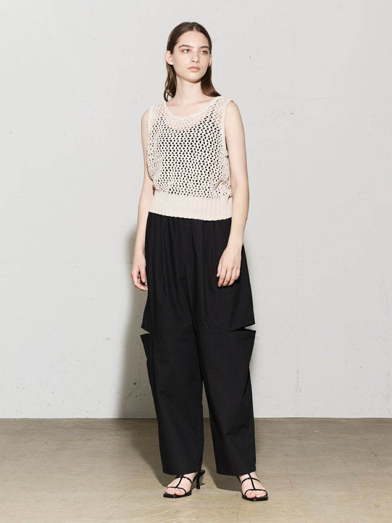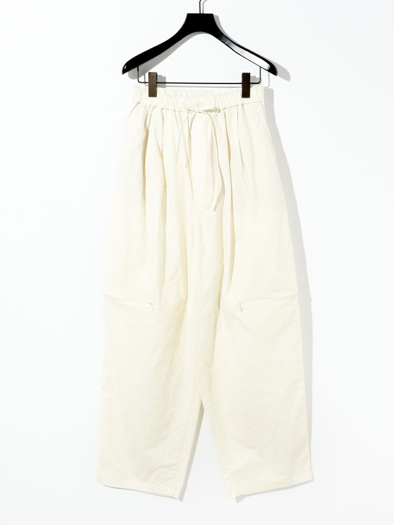 シャリ感のあるヴィンテージワッシャー素材を使用したニーホールボトム。サイドにニーホールを施したデザインでジップを留めてストレートラインにもできる特徴的なデザイン仕上げです。ワイルドでカジュアルな着こなしを印象付けます。ゆったり感があり軽さのあるコットン生地を使用。ウエストはゴム使用に加え調整紐付き。夏場でも涼しい穿き心地を体感していただけます。