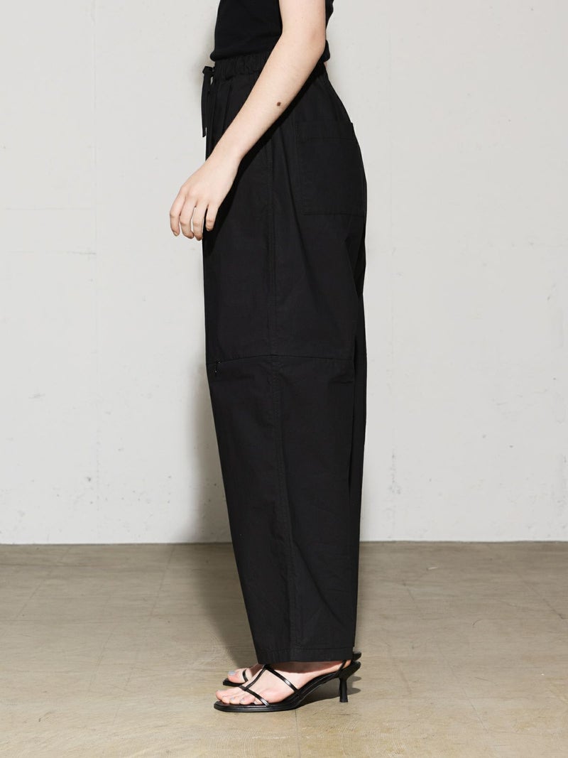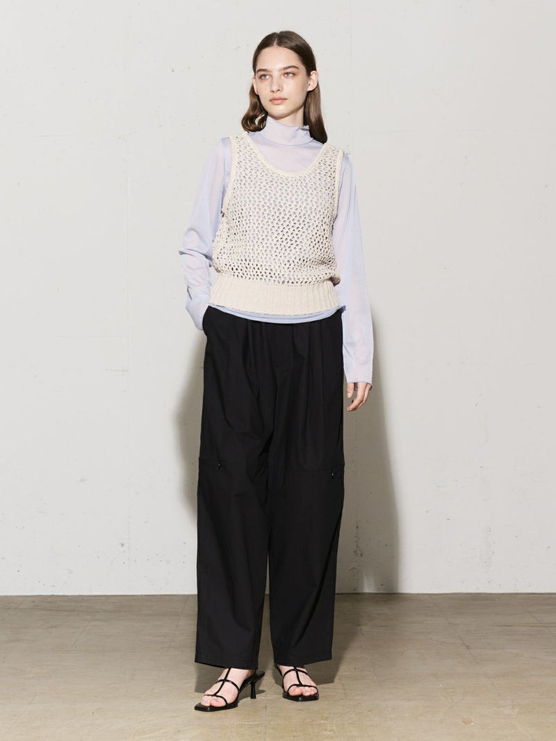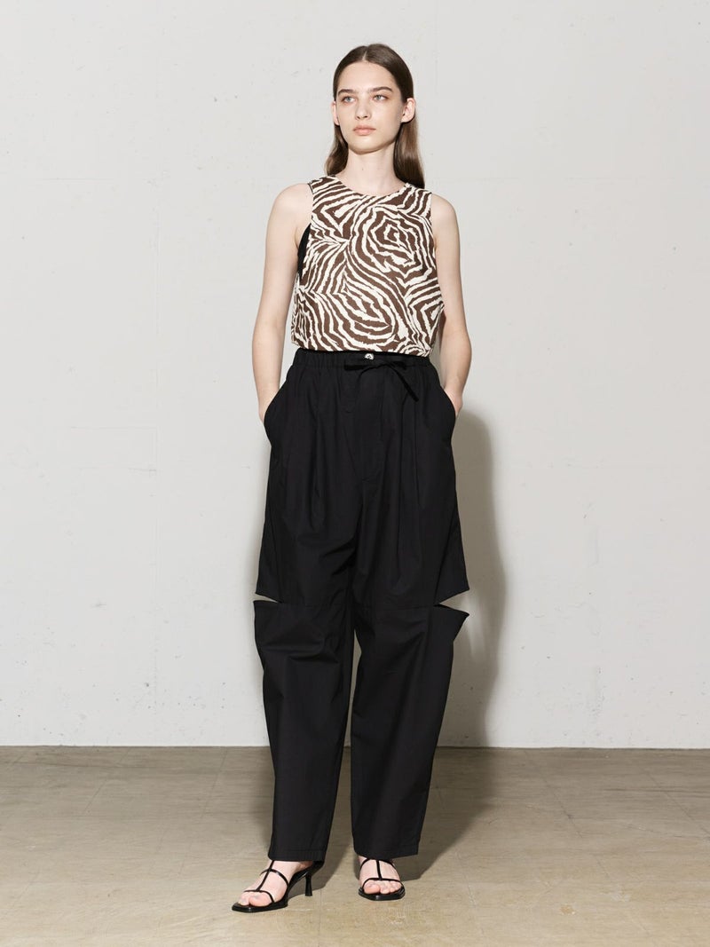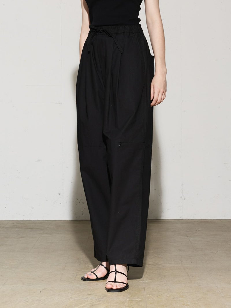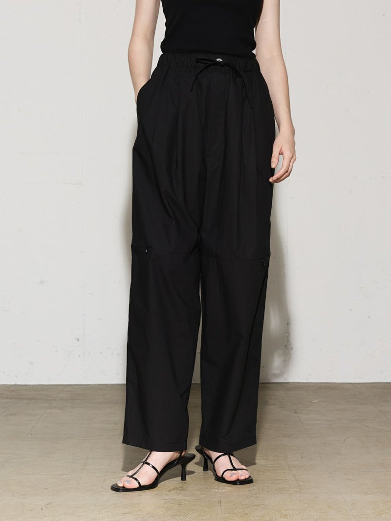シャリ感のあるヴィンテージワッシャー素材を使用したニーホールボトム。サイドにニーホールを施したデザインでジップを留めてストレートラインにもできる特徴的なデザイン仕上げです。ワイルドでカジュアルな着こなしを印象付けます。ゆったり感があり軽さのあるコットン生地を使用。ウエストはゴム使用に加え調整紐付き。夏場でも涼しい穿き心地を体感していただけます。