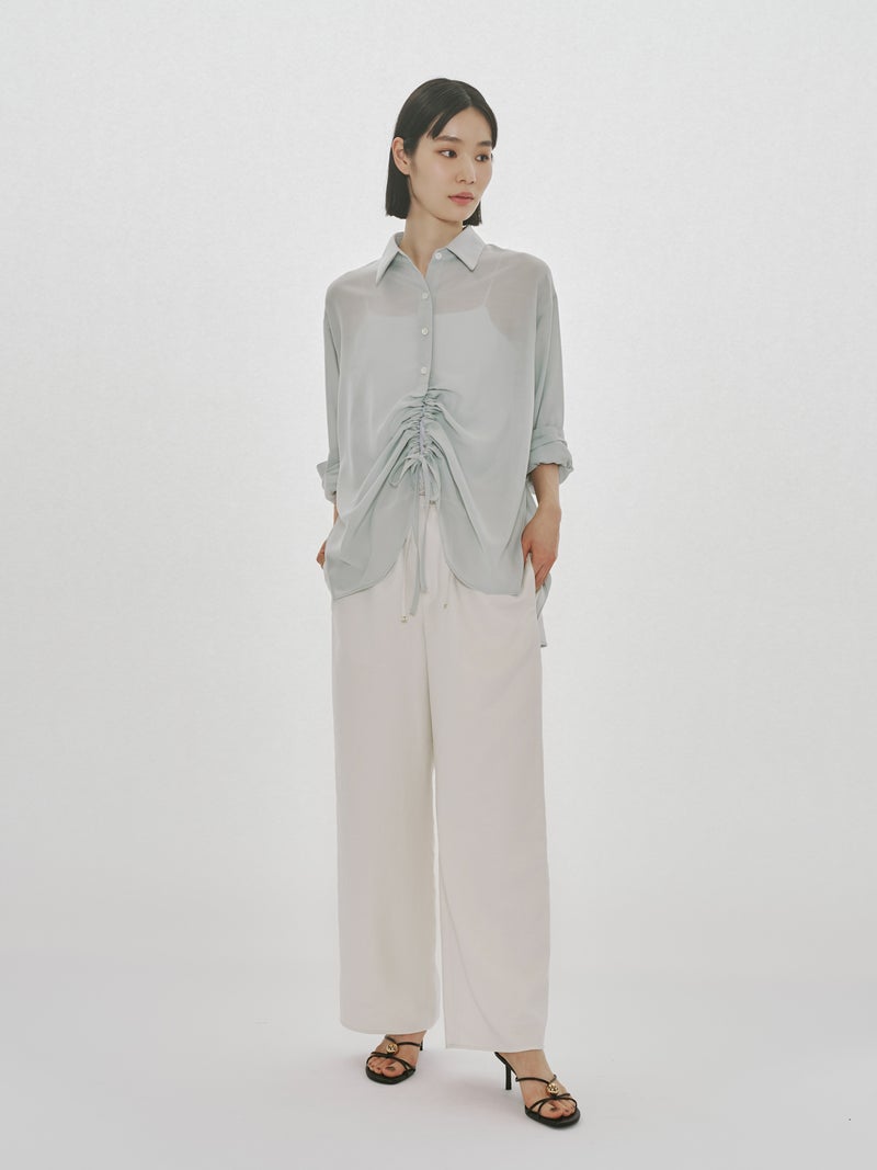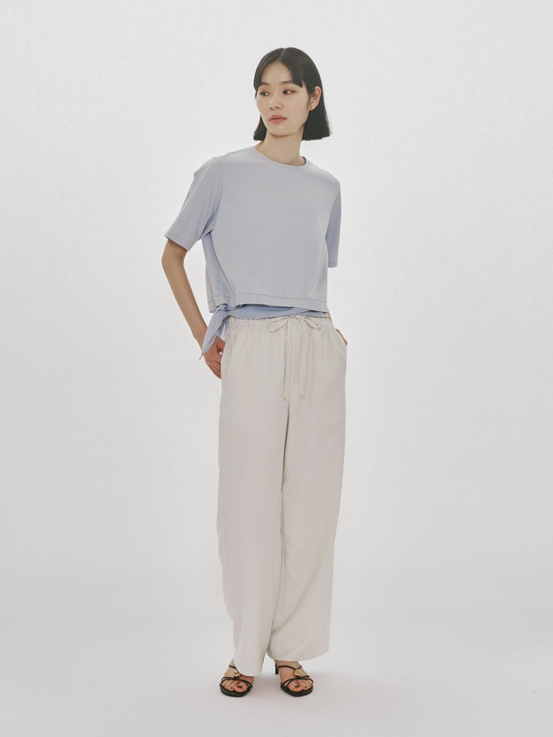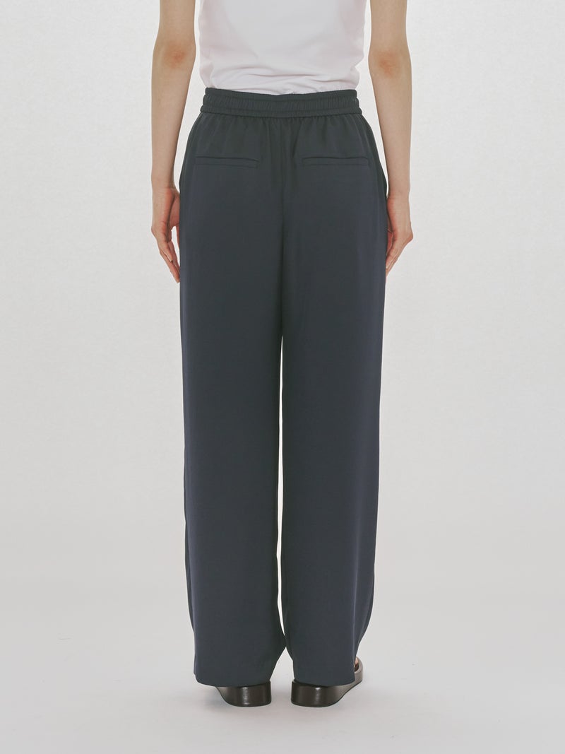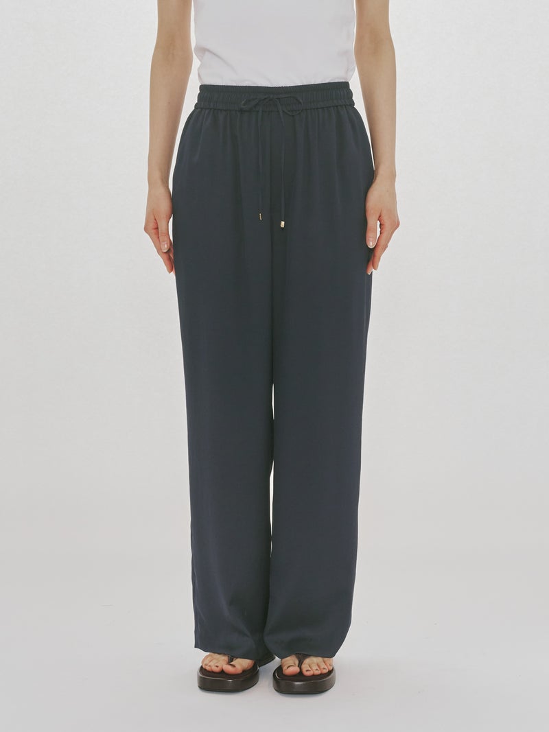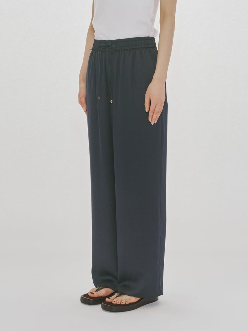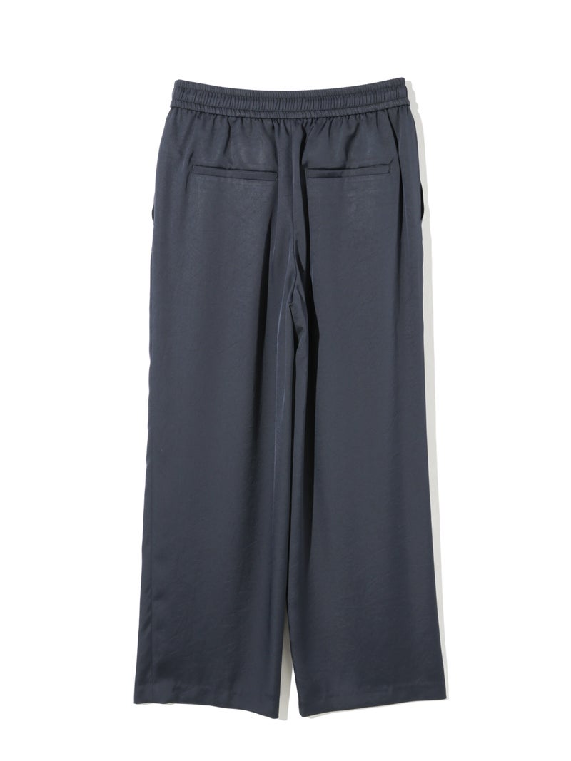 しなやかで上品な生地感が特徴のイージーパンツです。サラッとした艶のある生地感は軽くて着心地がよく、暑い時期でも快適に着用していただけます。着用感は広がりはなく足元まで程よいワイドシルエットを表現しており足長効果のある1枚。透け感はなく安心して着用できます。ウエストゴムに加え調整紐が付いたデザインなのでキープしやすく、リラックス感のあるところもポイント。今季人気のピンクを差し色にしており、落ち着きのある女性らしいパンツスタイルを印象付けたボトムアイテムです。