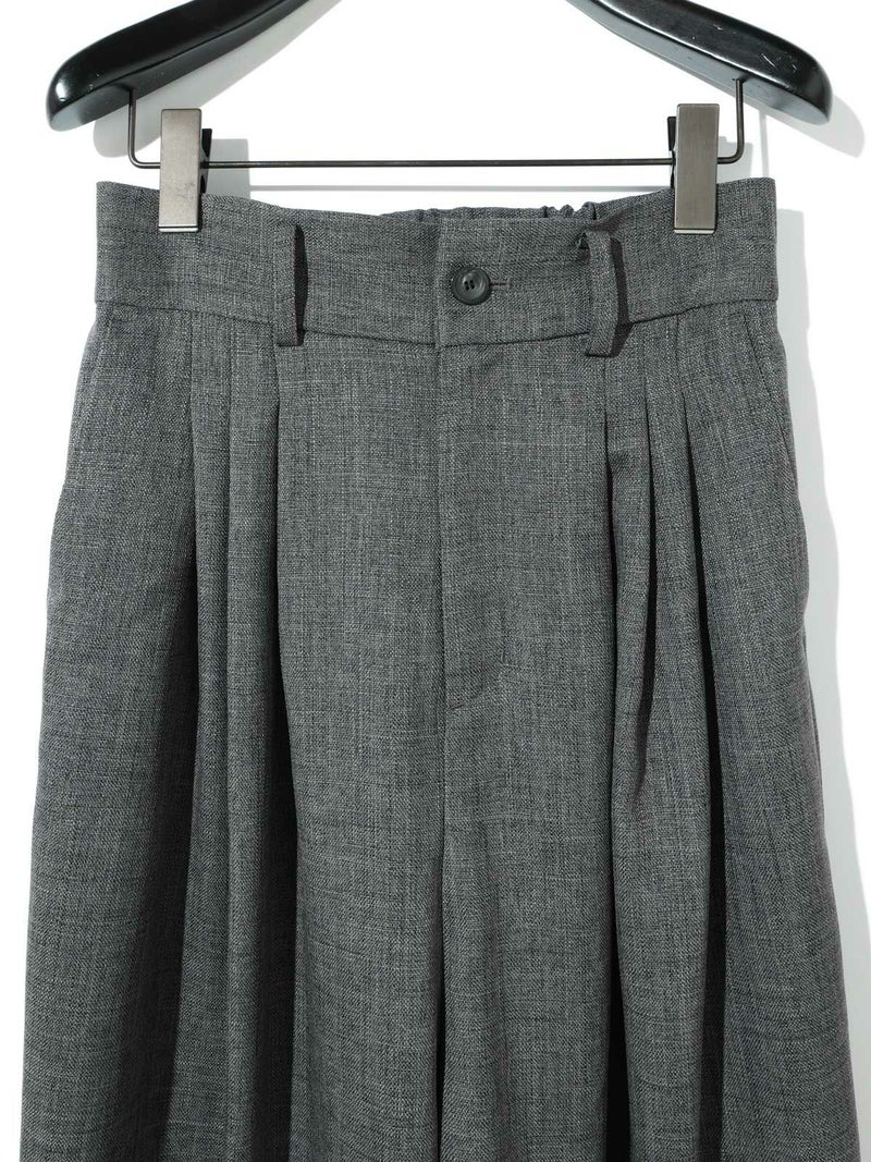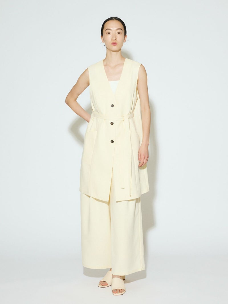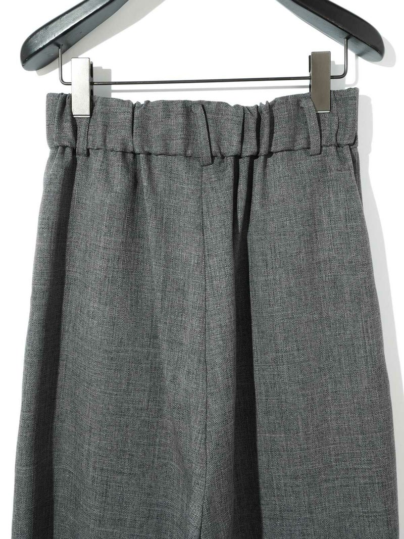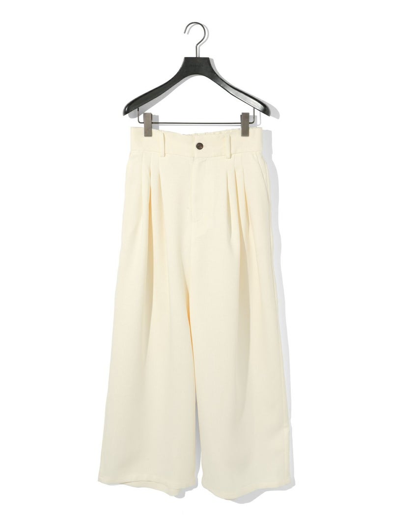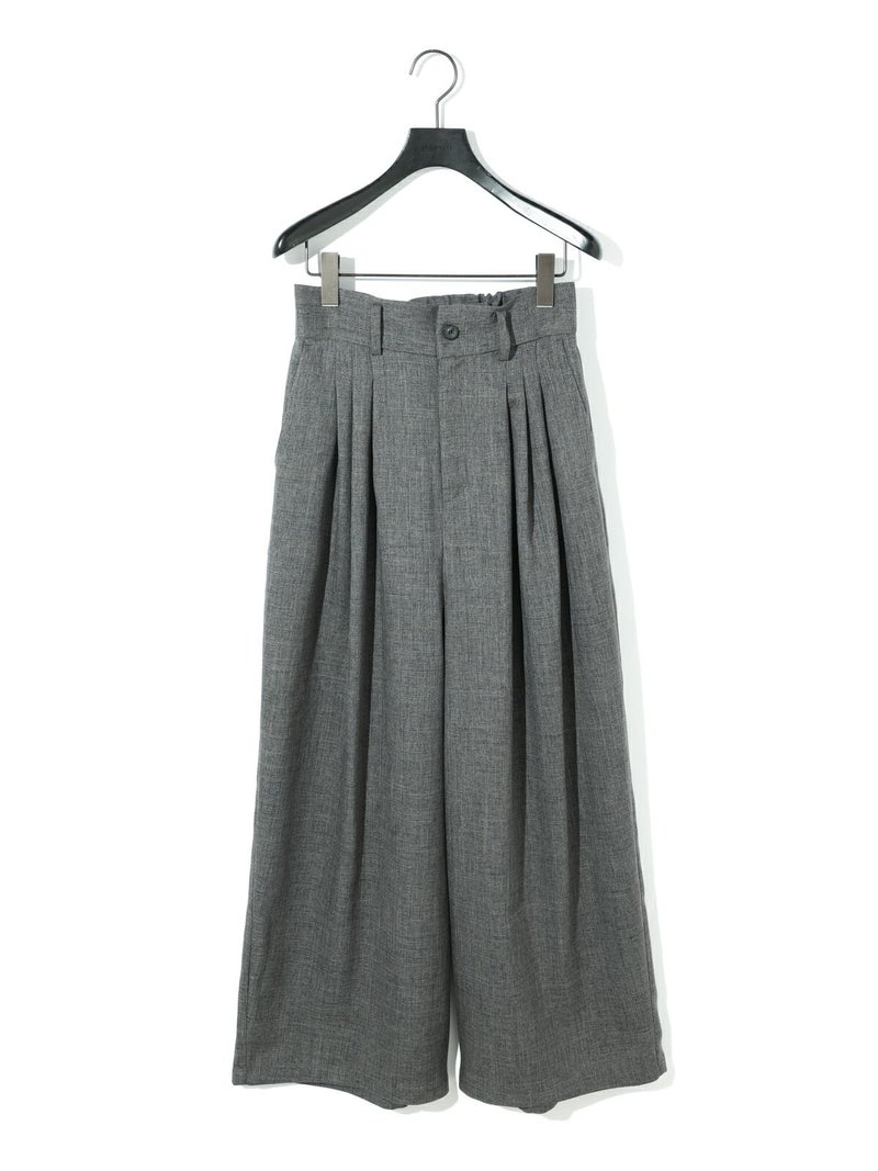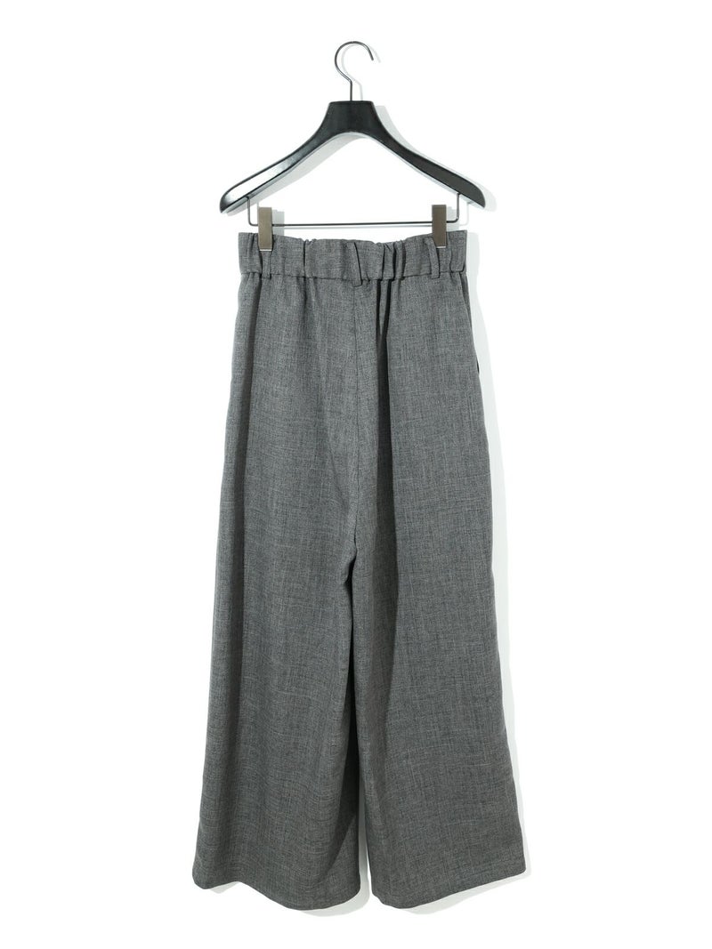 清楚にかっこよく穿きこなせるタックスラックスです。ワイド感が印象的なフロントタックを施しました。メランジ調ツイード風の表情のある素材感で上品な雰囲気と肌離れがよく軽やかな着心地を体感していただけます。ウエストはバック部分をゴムを使用しており、更にベルトループ使いなのでシャツインで腰回りをすっきりとさせた着こなしもおすすめ。ベルト使いでオシャレを楽しんでいただけます。アイボリーのみ裏地付き。同シリーズの2-132202/Aラインノーカラーロングジレも展開しておりジャケットとのセットアップで正装着にもおすすめです。