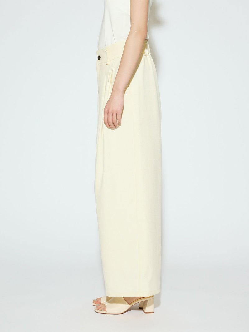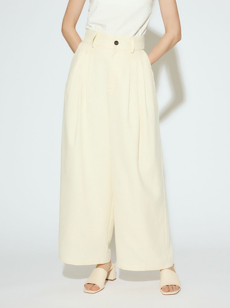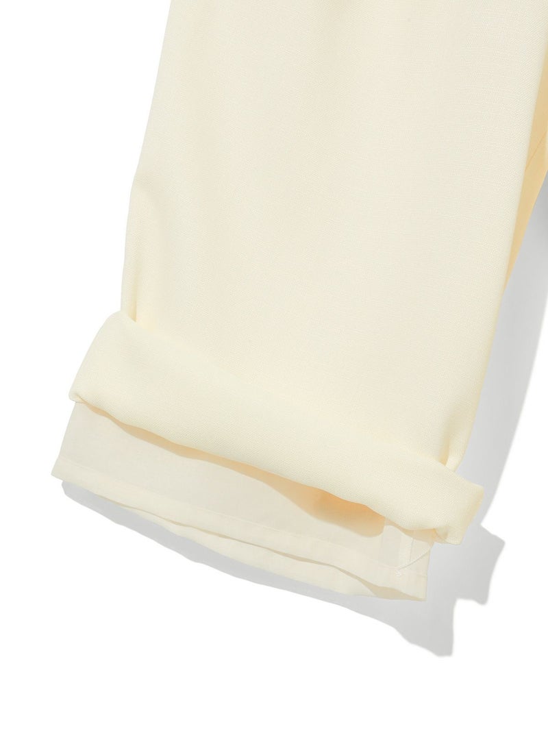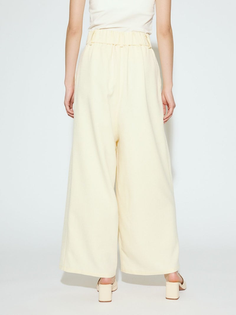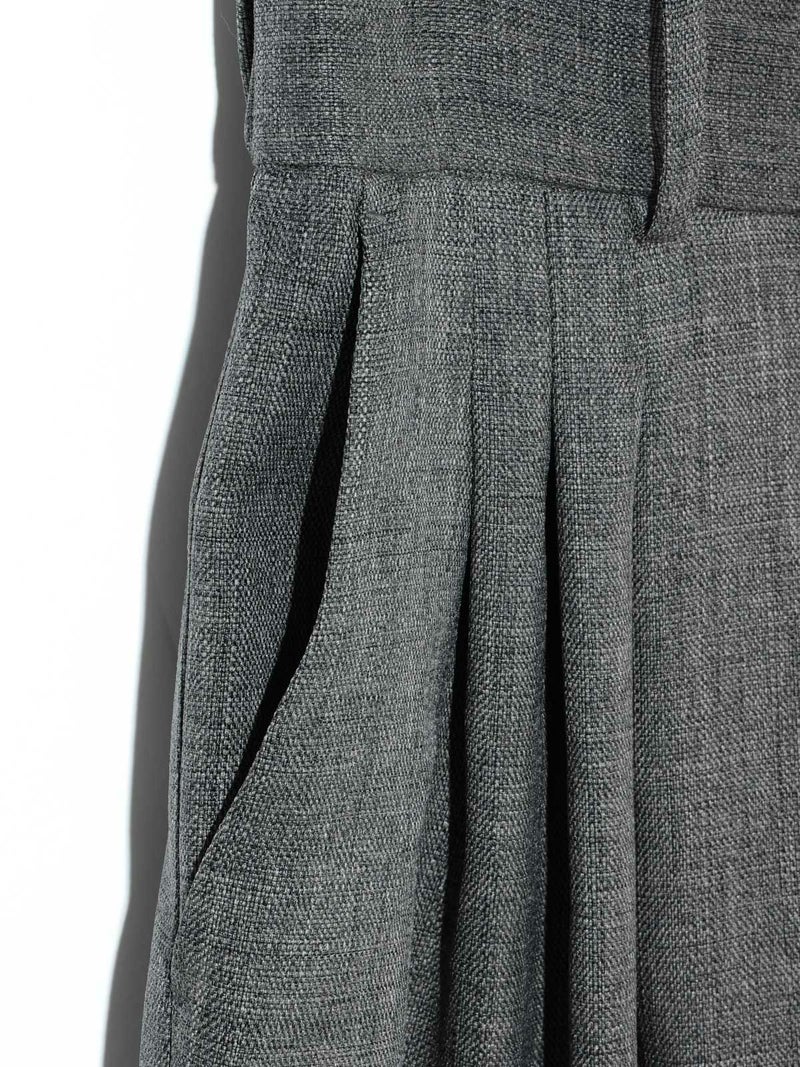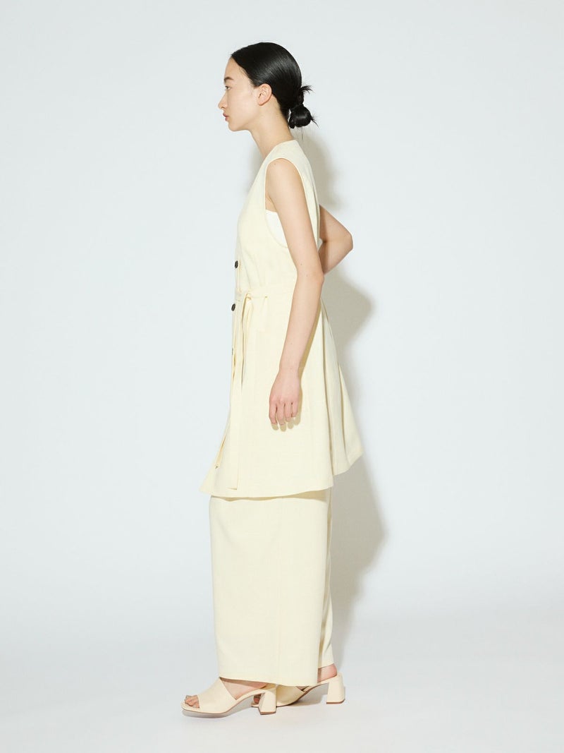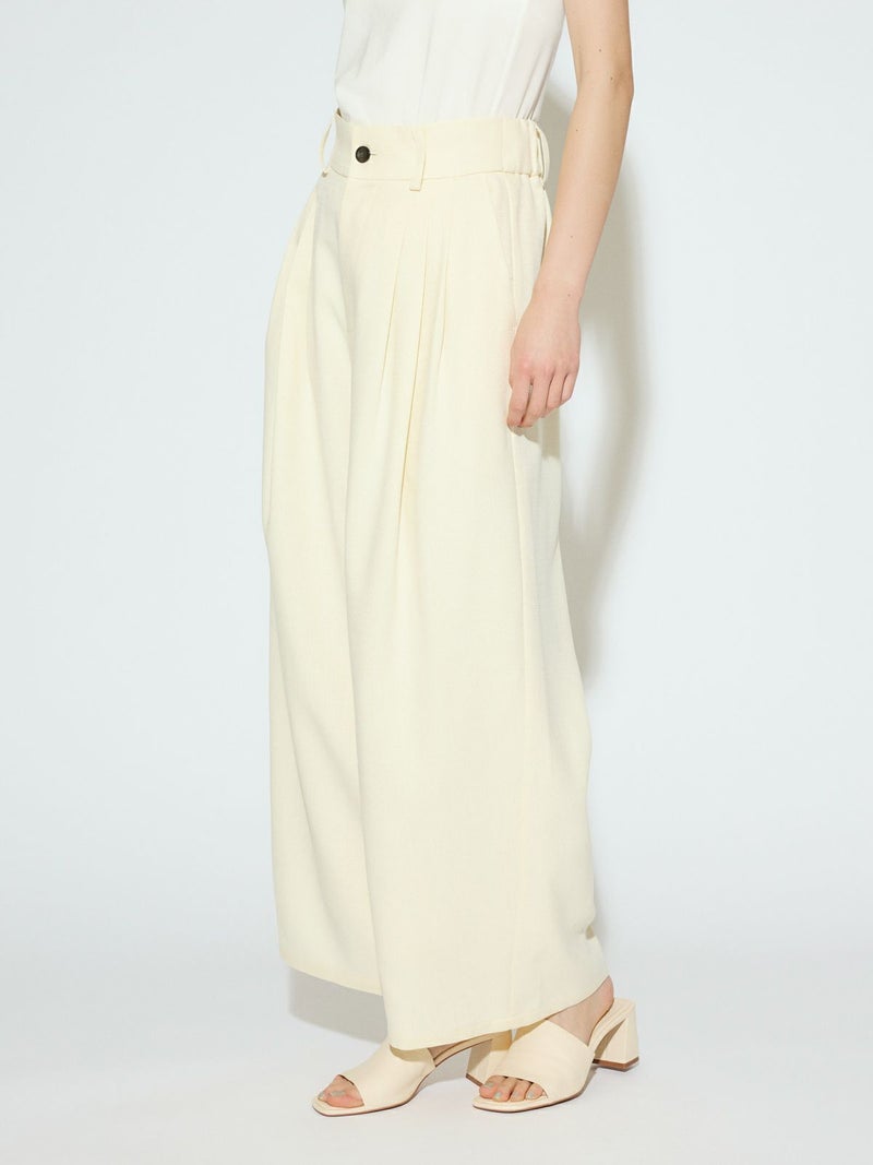 清楚にかっこよく穿きこなせるタックスラックスです。ワイド感が印象的なフロントタックを施しました。メランジ調ツイード風の表情のある素材感で上品な雰囲気と肌離れがよく軽やかな着心地を体感していただけます。ウエストはバック部分をゴムを使用しており、更にベルトループ使いなのでシャツインで腰回りをすっきりとさせた着こなしもおすすめ。ベルト使いでオシャレを楽しんでいただけます。アイボリーのみ裏地付き。同シリーズの2-132202/Aラインノーカラーロングジレも展開しておりジャケットとのセットアップで正装着にもおすすめです。