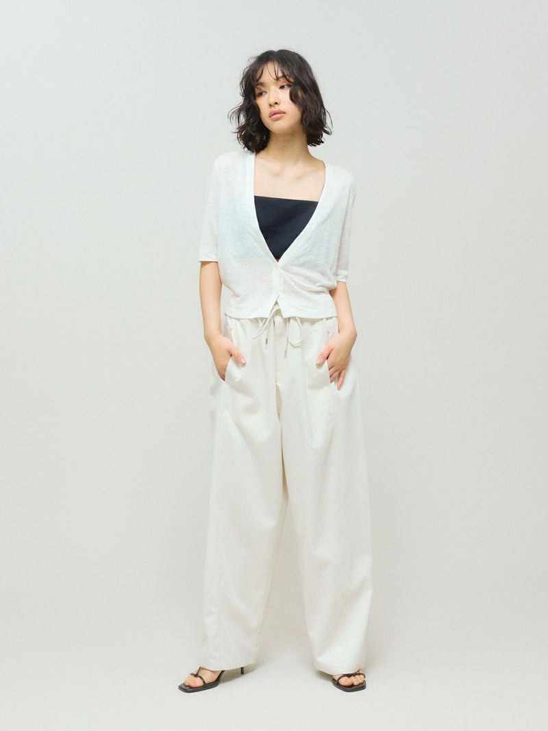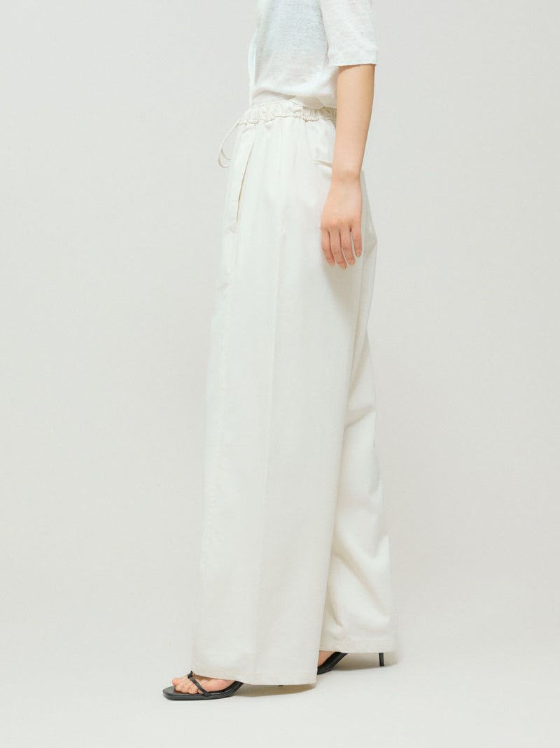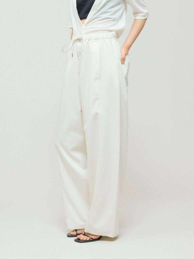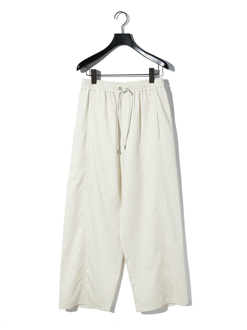 メンズライクでワークテイストなデザインに仕上げたリラックスイージーパンツです。カーブしたコクーンシルエットが特徴的。毛羽立ちの少ないツイル素材を使用。コットン生地ですが合繊ぽく上品な質感を感じていただける1枚です。ウエストはリラックス感のあるゴム使用に加え中紐調整付き。アイボリーも透けにくく着用しやすい色合いです。