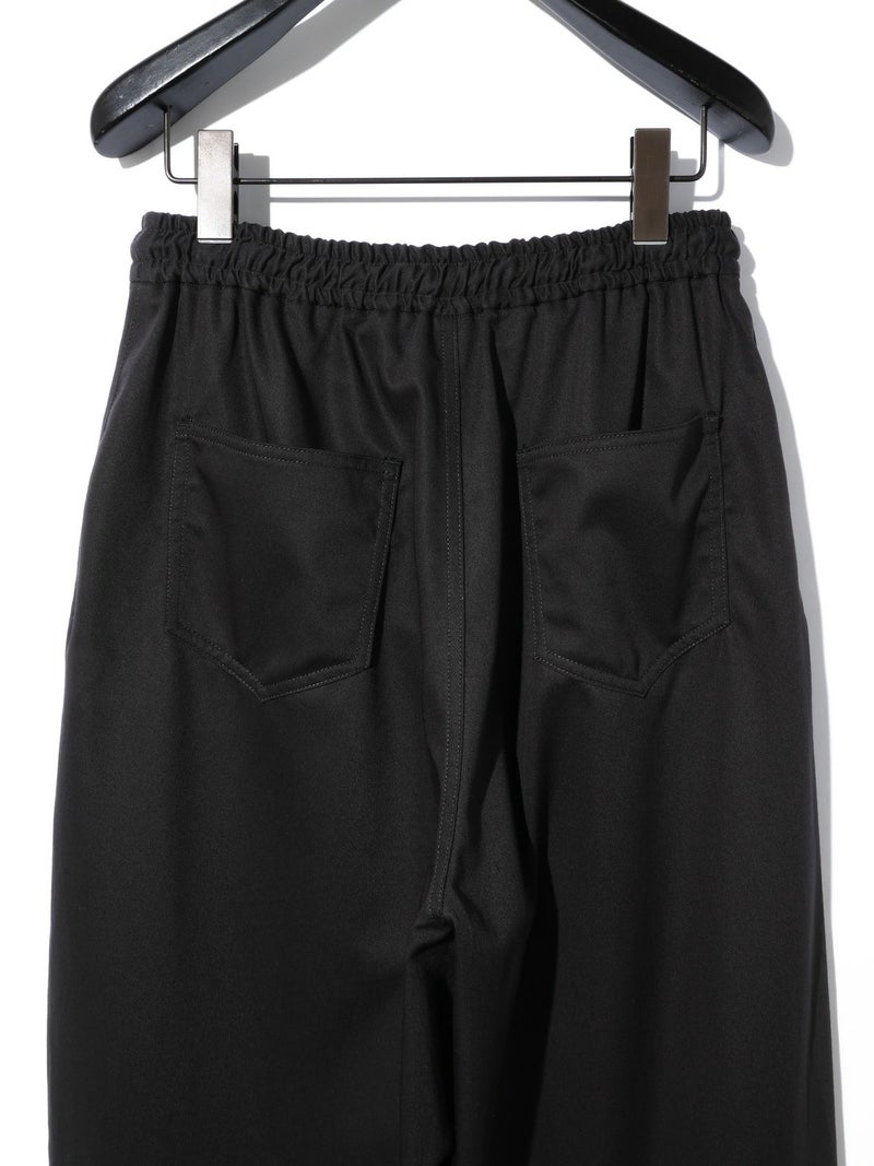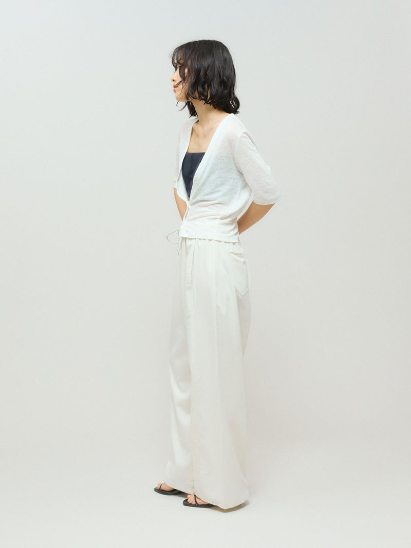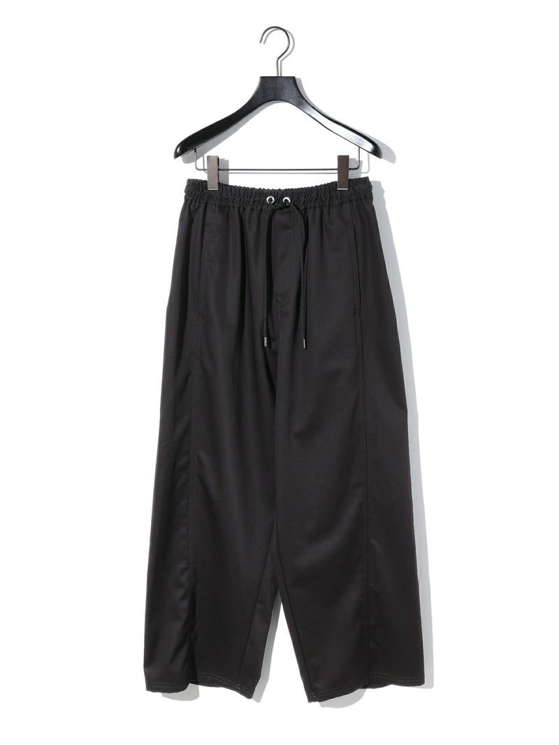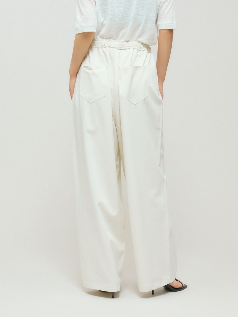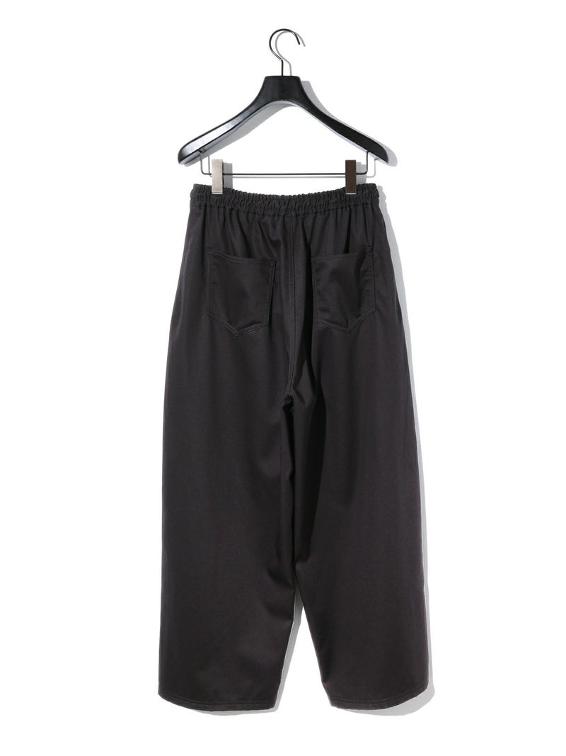 メンズライクでワークテイストなデザインに仕上げたリラックスイージーパンツです。カーブしたコクーンシルエットが特徴的。毛羽立ちの少ないツイル素材を使用。コットン生地ですが合繊ぽく上品な質感を感じていただける1枚です。ウエストはリラックス感のあるゴム使用に加え中紐調整付き。アイボリーも透けにくく着用しやすい色合いです。