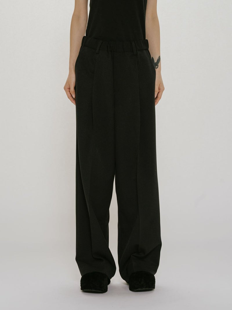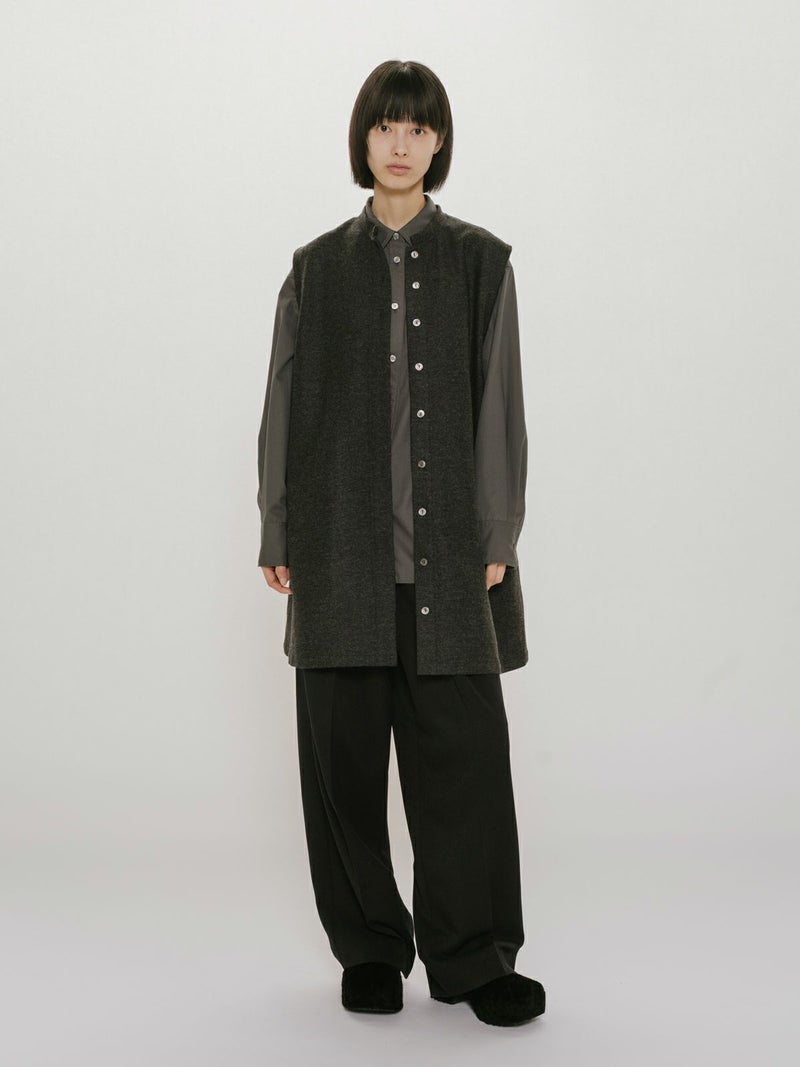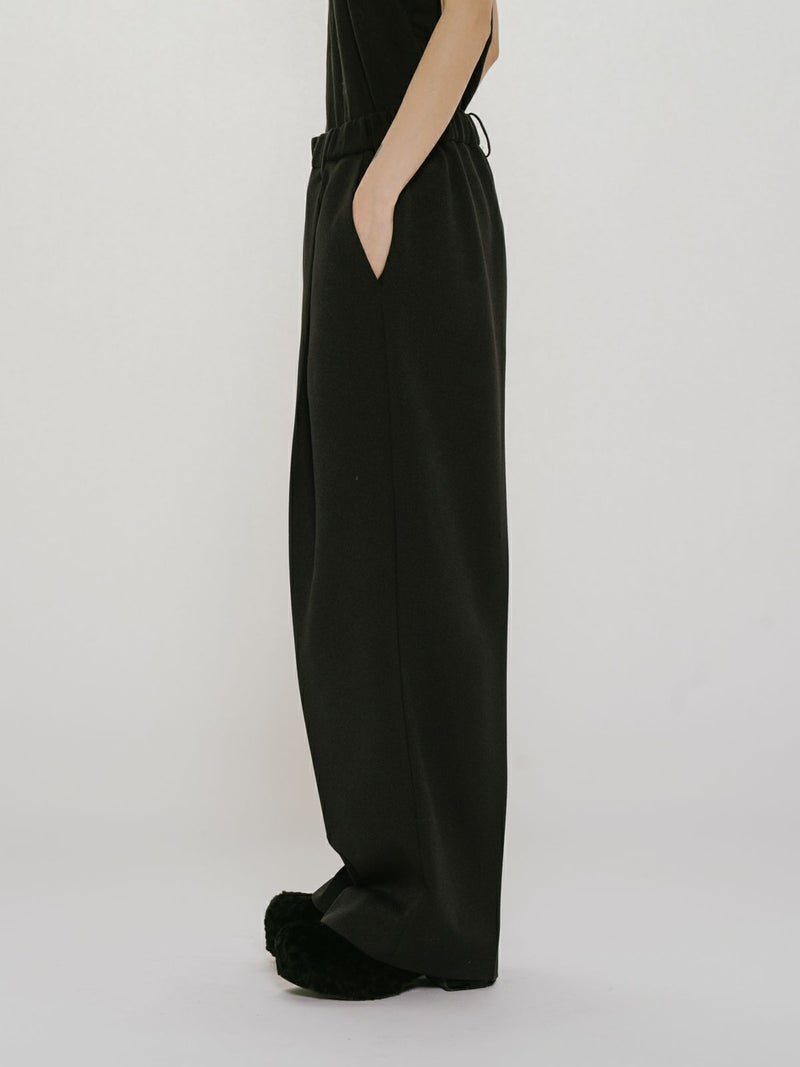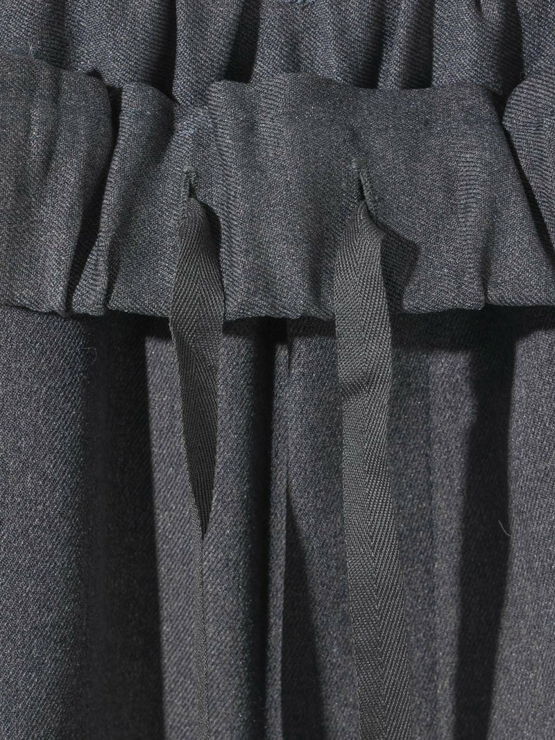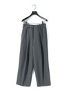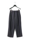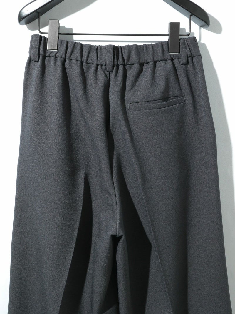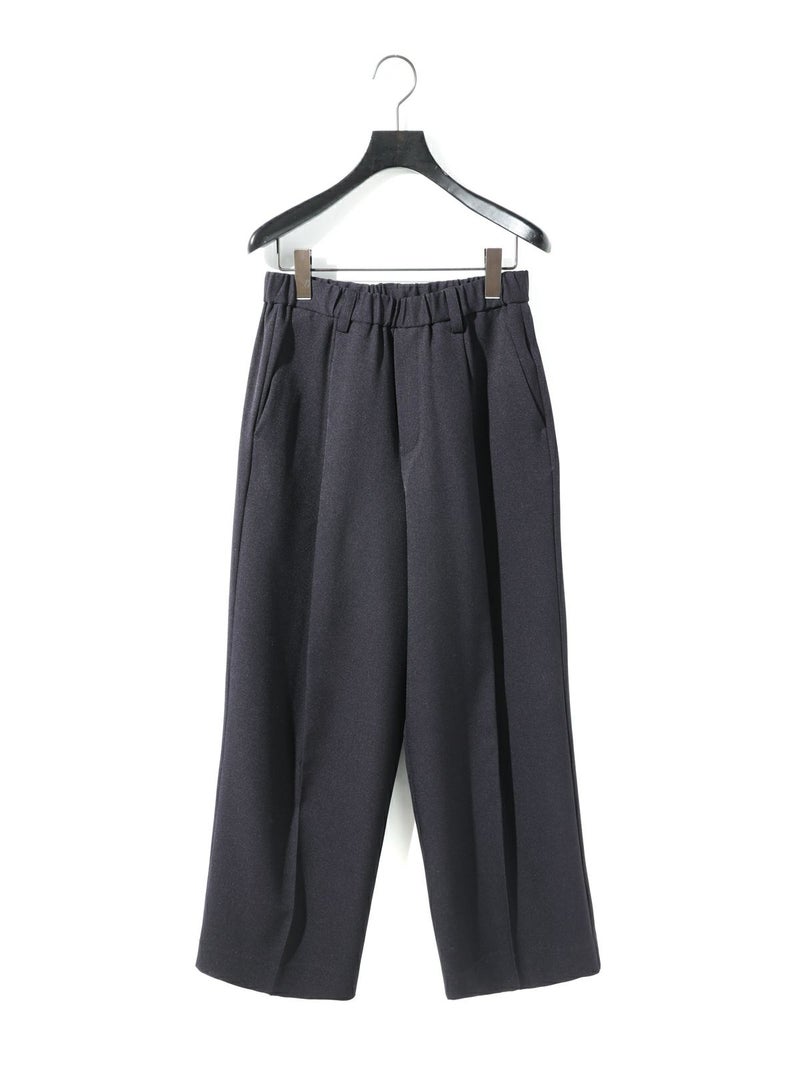 ハイウエスト気味で穿いても長く、厚みのある靴に乗せるようなスタイルもしくはヒールと合わせて穿ける丈感です。フラットなシューズと合わせるときは丈感調整がおすすめです。センタープレスのすっきりとしたシルエットでスタイル問わず合わせやすい1枚です。