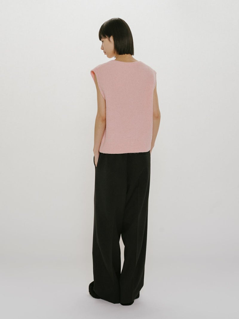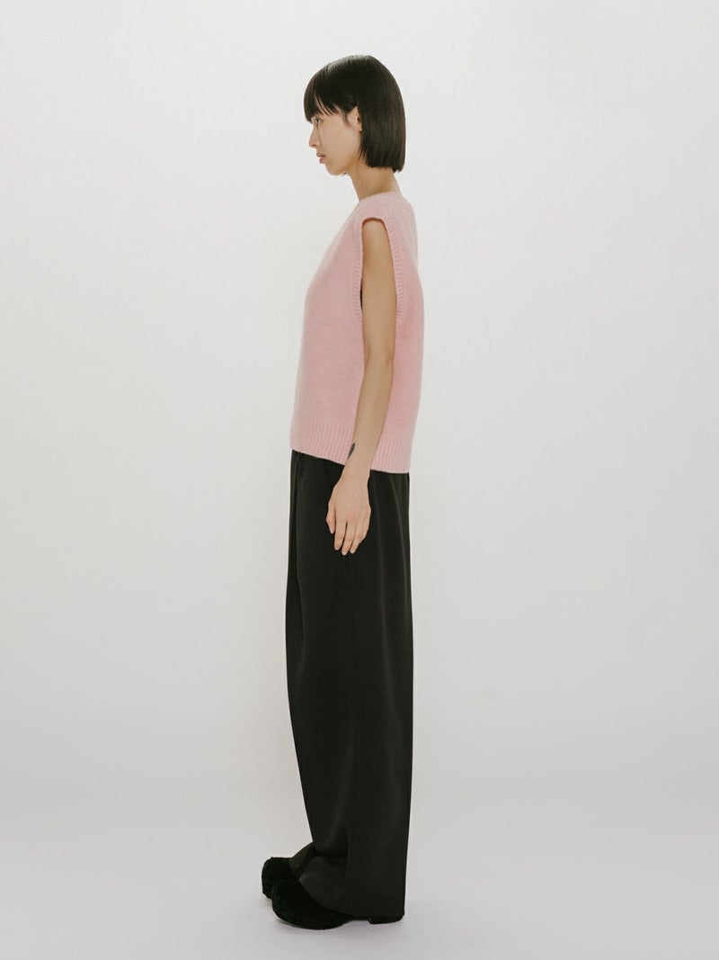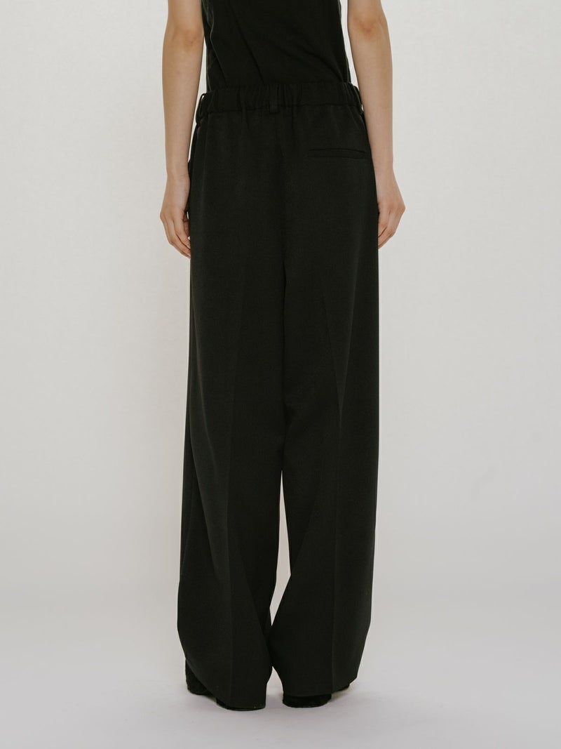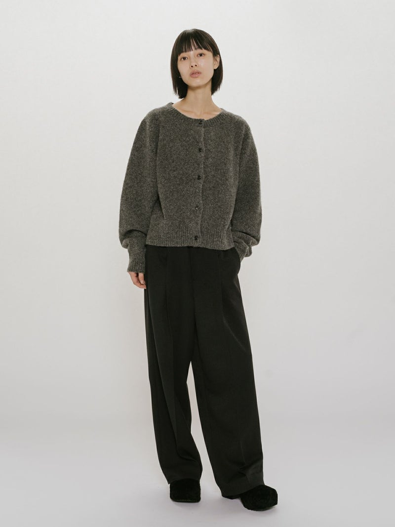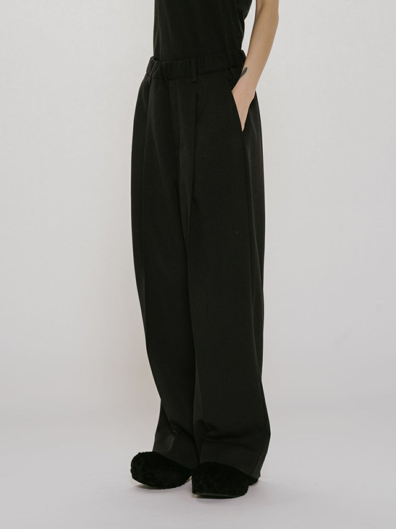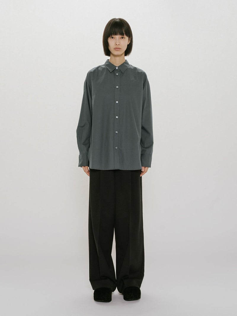 ハイウエスト気味で穿いても長く、厚みのある靴に乗せるようなスタイルもしくはヒールと合わせて穿ける丈感です。フラットなシューズと合わせるときは丈感調整がおすすめです。センタープレスのすっきりとしたシルエットでスタイル問わず合わせやすい1枚です。