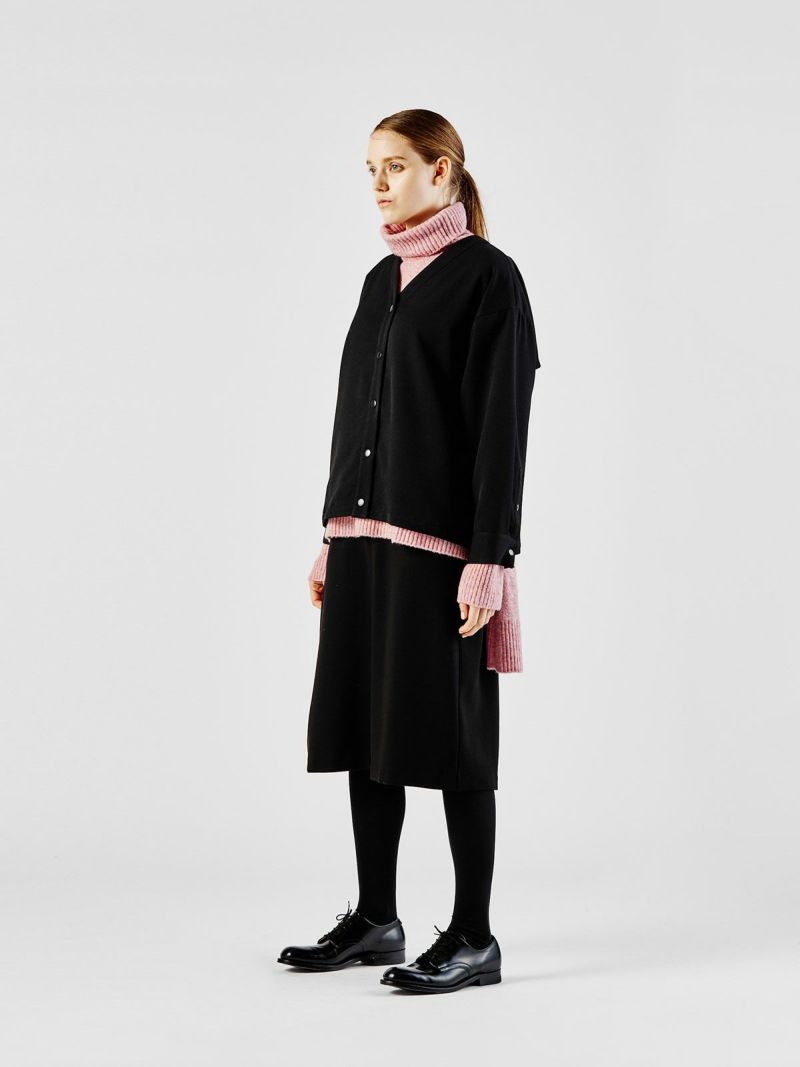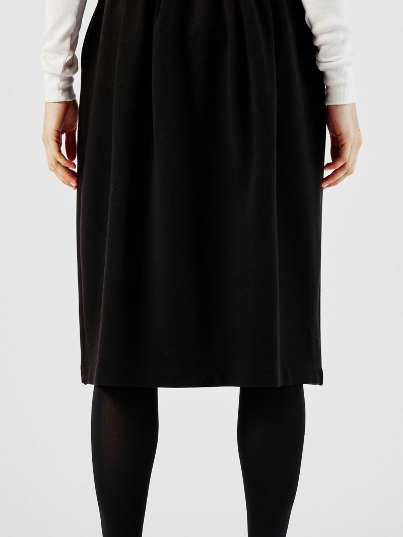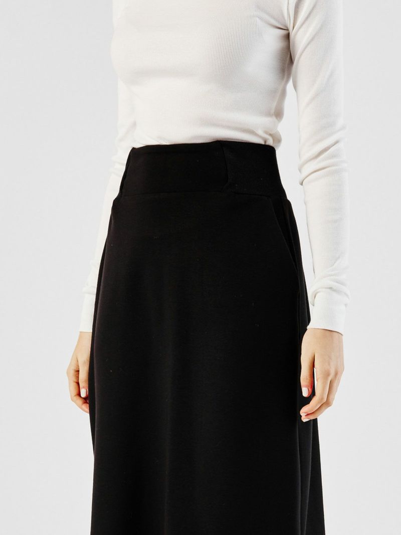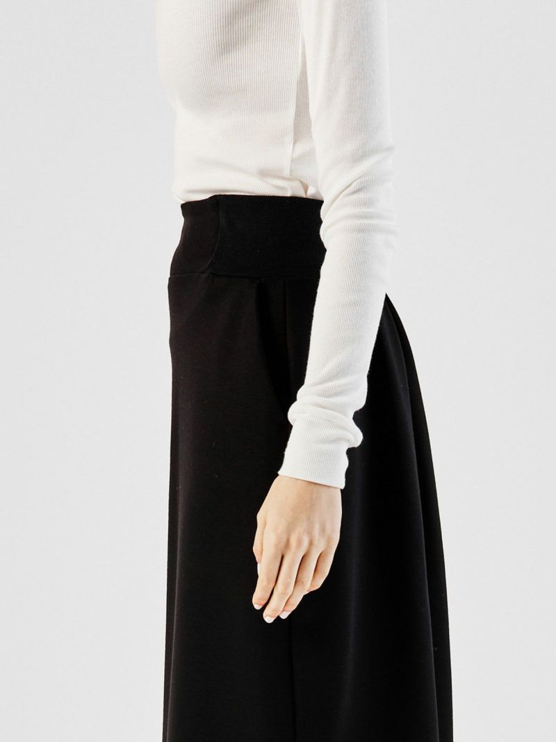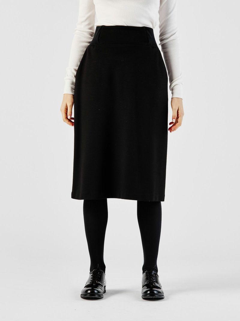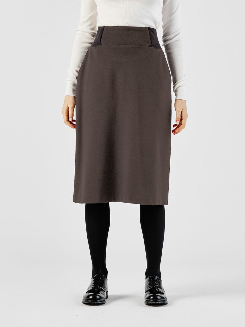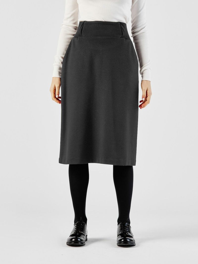 ウエストマークをしたようなハイウエストスカート。細身過ぎないシルエットで「I]ラインのスッキリとしたデザインが特長。動きやすいくコーディネートによっていろいろな着こなしを表現できる1枚。水分を吸収し発熱、保温する機能を持っているのでニットが苦手な方でも暖かく着心地よく着て頂けます。シャツインをしてウエストをスッキリ見せる着こなしも素敵です。ベーシックなスカートです。