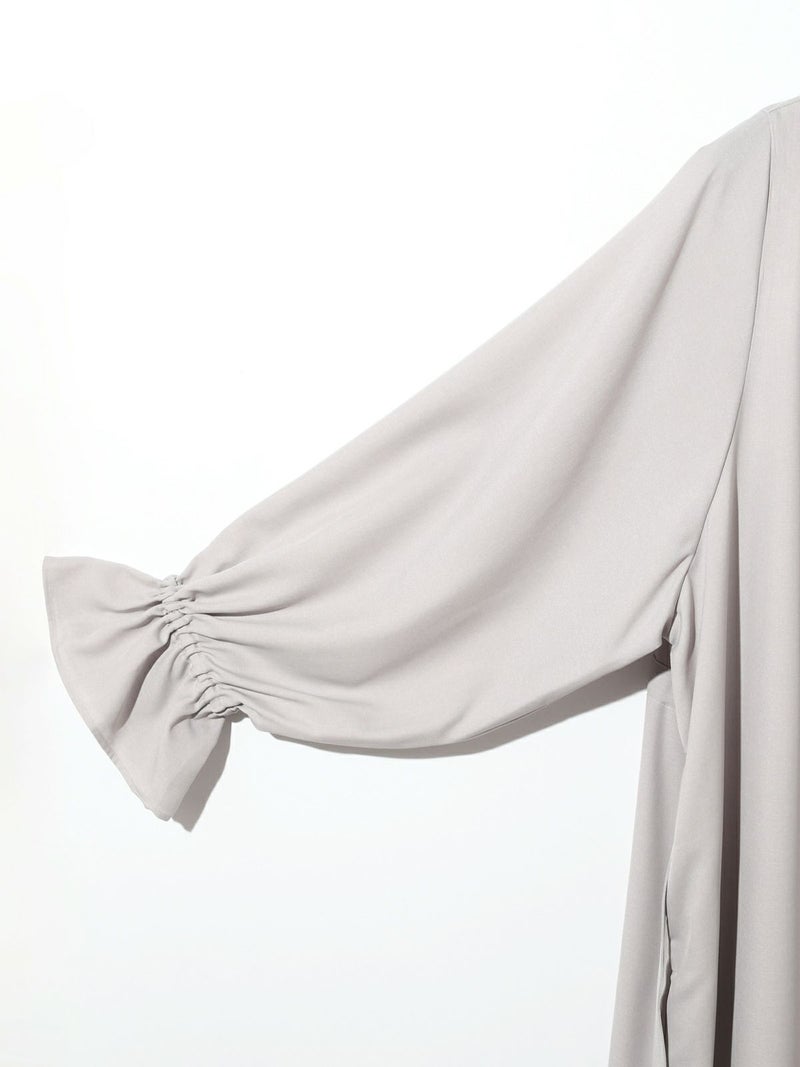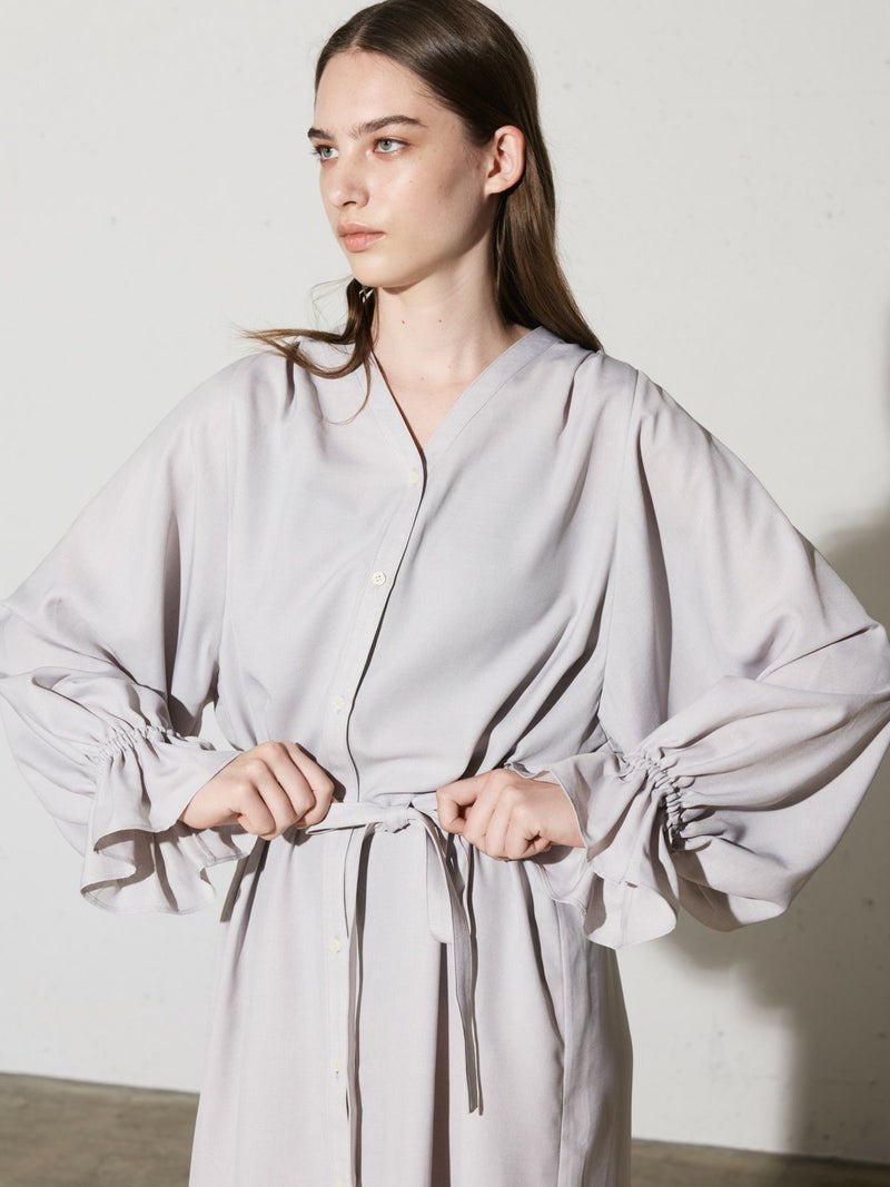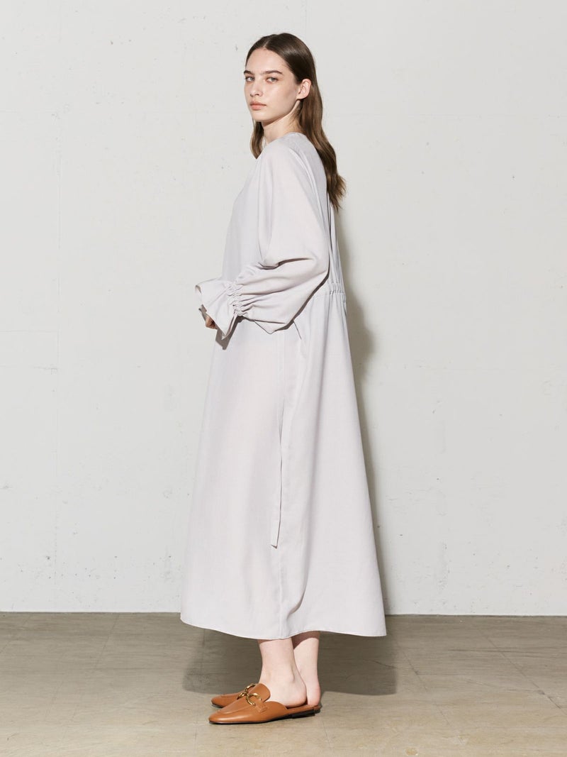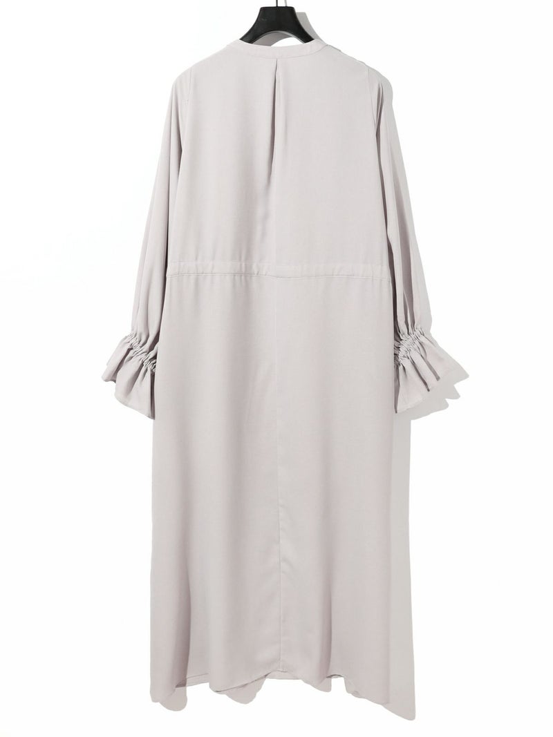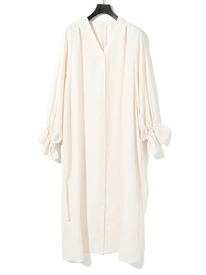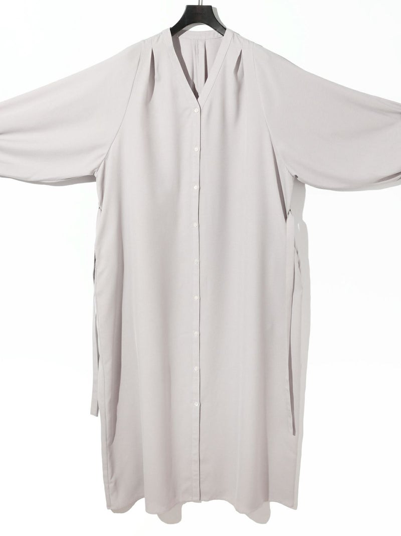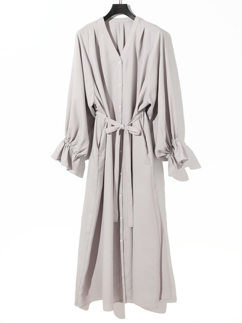 上品で女性らしい雰囲気を印象付けるベルスリーブワンピースです。ロング丈の落ち着きのある雰囲気のワンピースで袖にボリューム感を表現。袖先を絞れるデザイン仕上げとなっています。ウエスト紐ベルト付きで着こなしによってアレンジをきかせることができます。すっきりとしたVネックの首元が品を感じさせてくれる1枚。フロントはボタン使いなので羽織ってコーディネートしても素敵です。アイボリーやライトグレーの落ち着きのある淡い色合いが大人の魅力を引き立てたワンピースです。