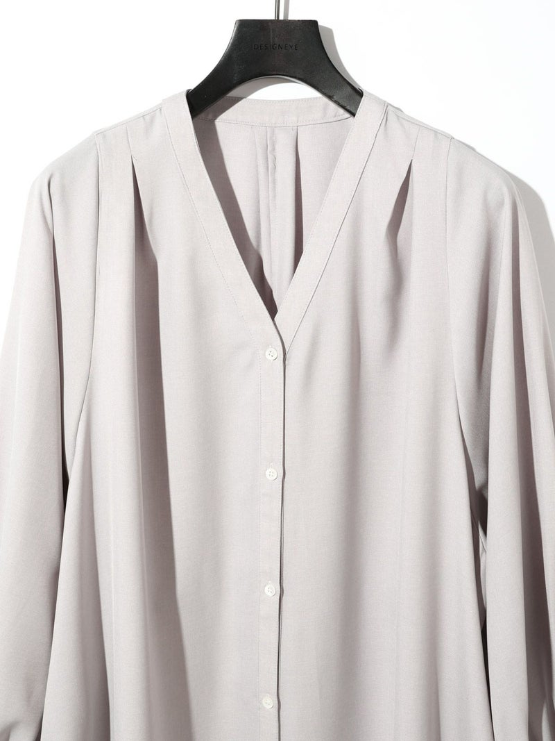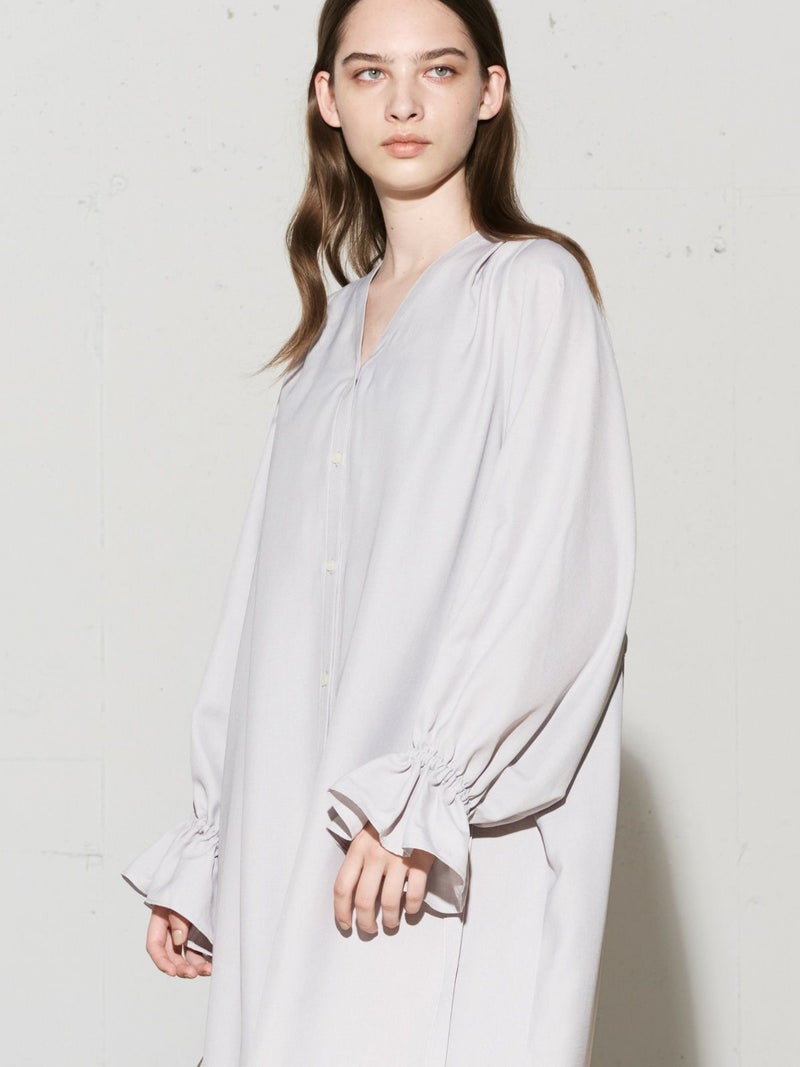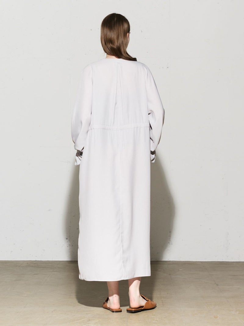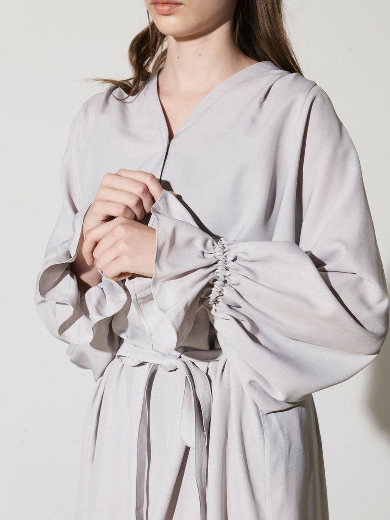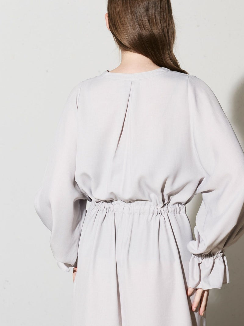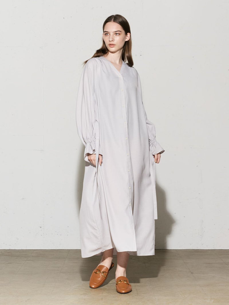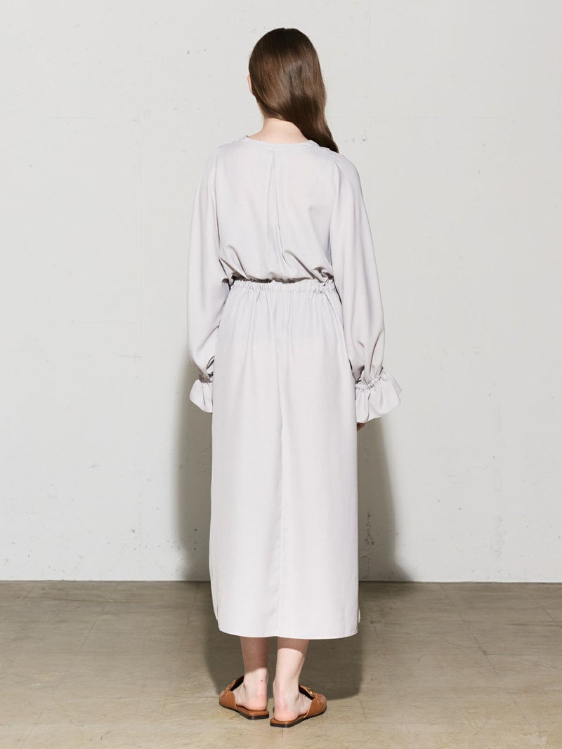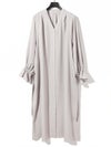 上品で女性らしい雰囲気を印象付けるベルスリーブワンピースです。ロング丈の落ち着きのある雰囲気のワンピースで袖にボリューム感を表現。袖先を絞れるデザイン仕上げとなっています。ウエスト紐ベルト付きで着こなしによってアレンジをきかせることができます。すっきりとしたVネックの首元が品を感じさせてくれる1枚。フロントはボタン使いなので羽織ってコーディネートしても素敵です。アイボリーやライトグレーの落ち着きのある淡い色合いが大人の魅力を引き立てたワンピースです。